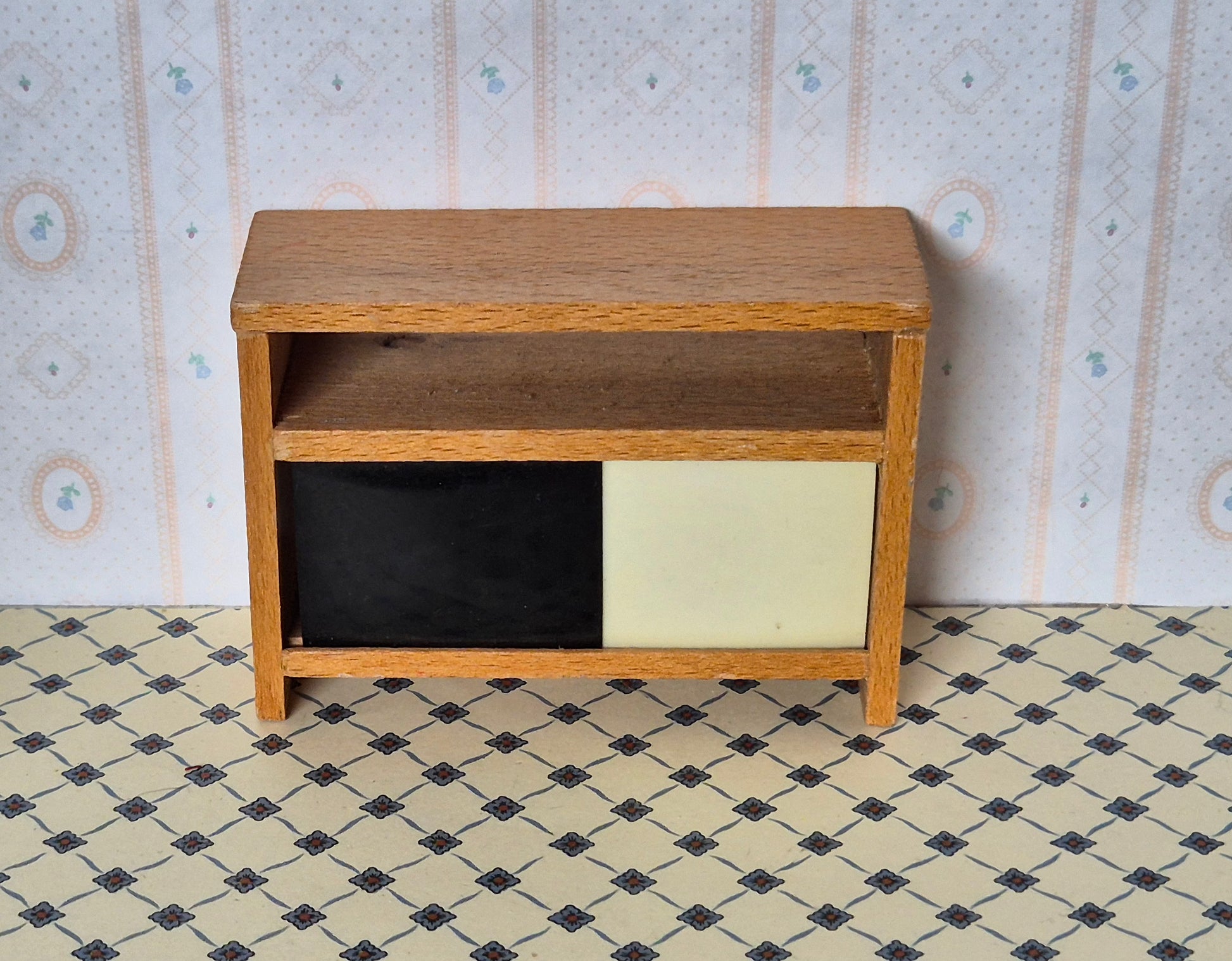 Fin vintage reol af træ med hvid og sort skydelåger. God pæn stand med en smule patina.