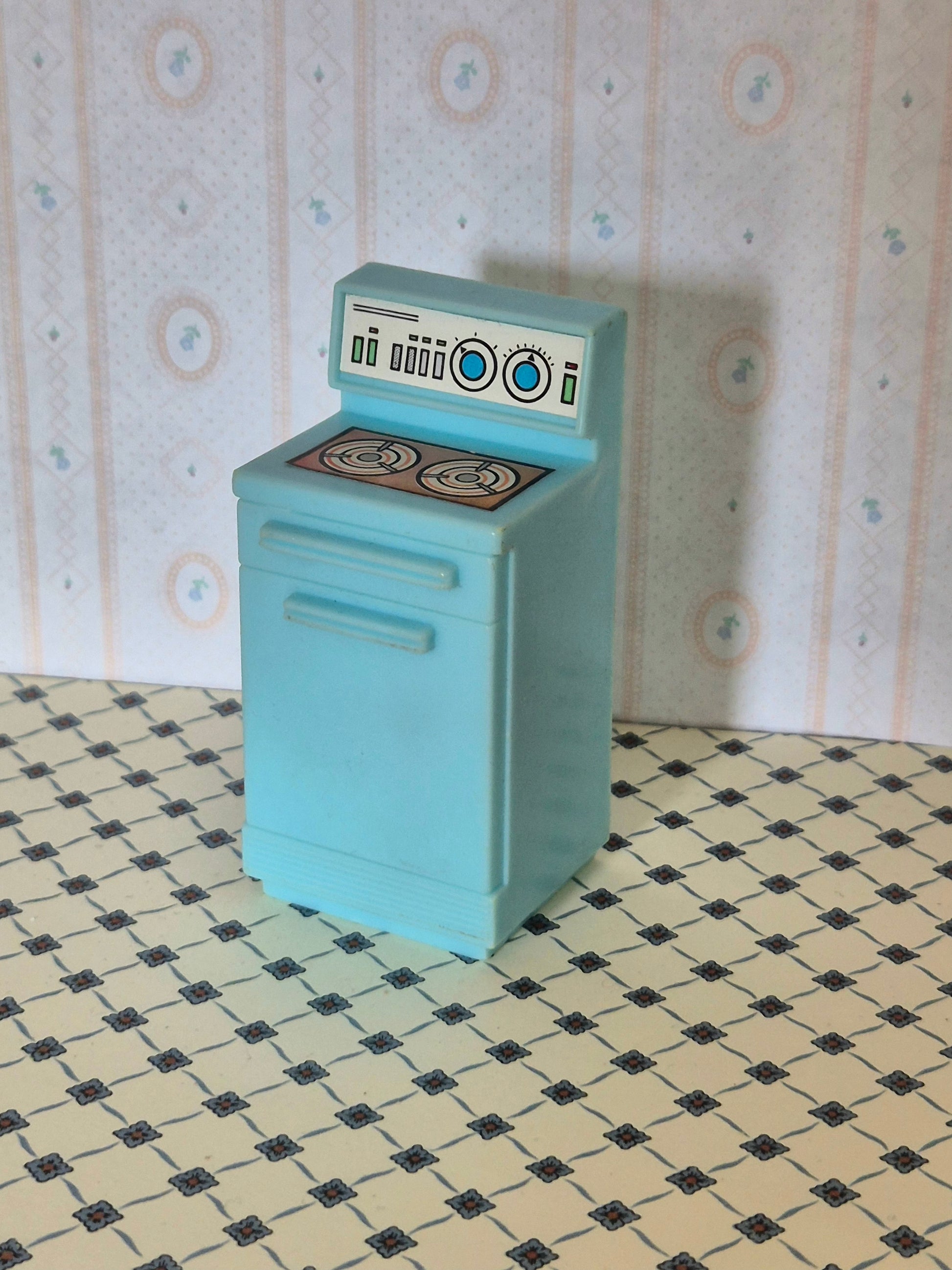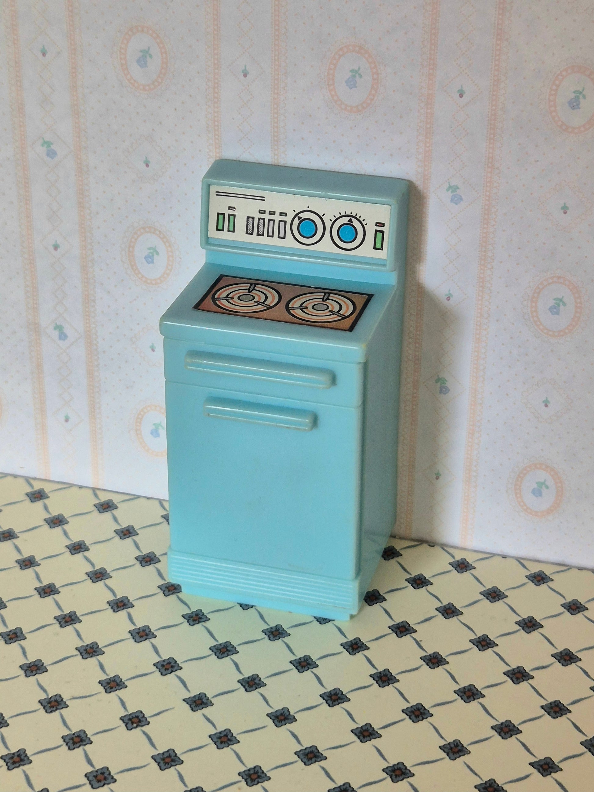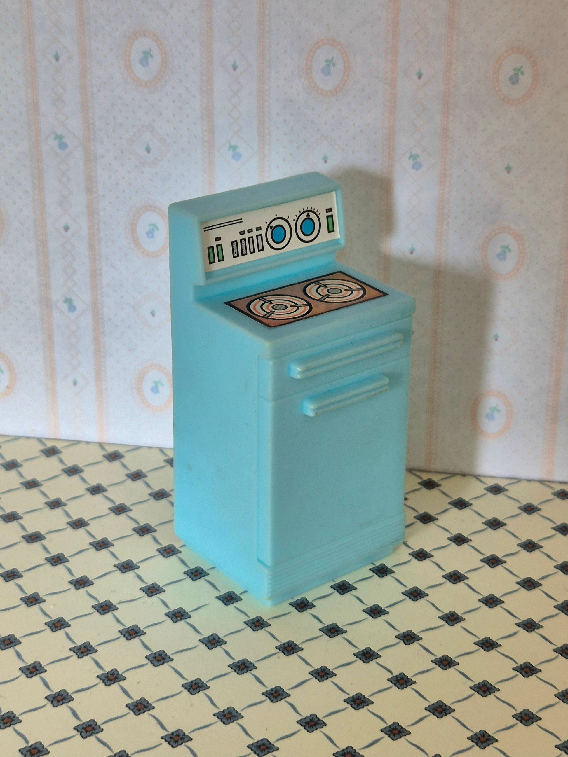 Blåt vintage komfur af plast i 1:18. Der er patina