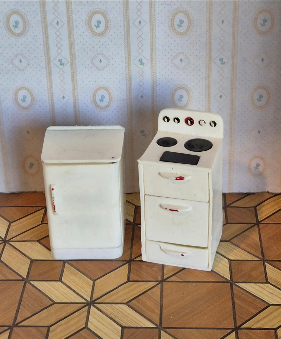 Vintage sæt af Barton, vintage køkken møbler, komfur og køleskab. Det er af plast.