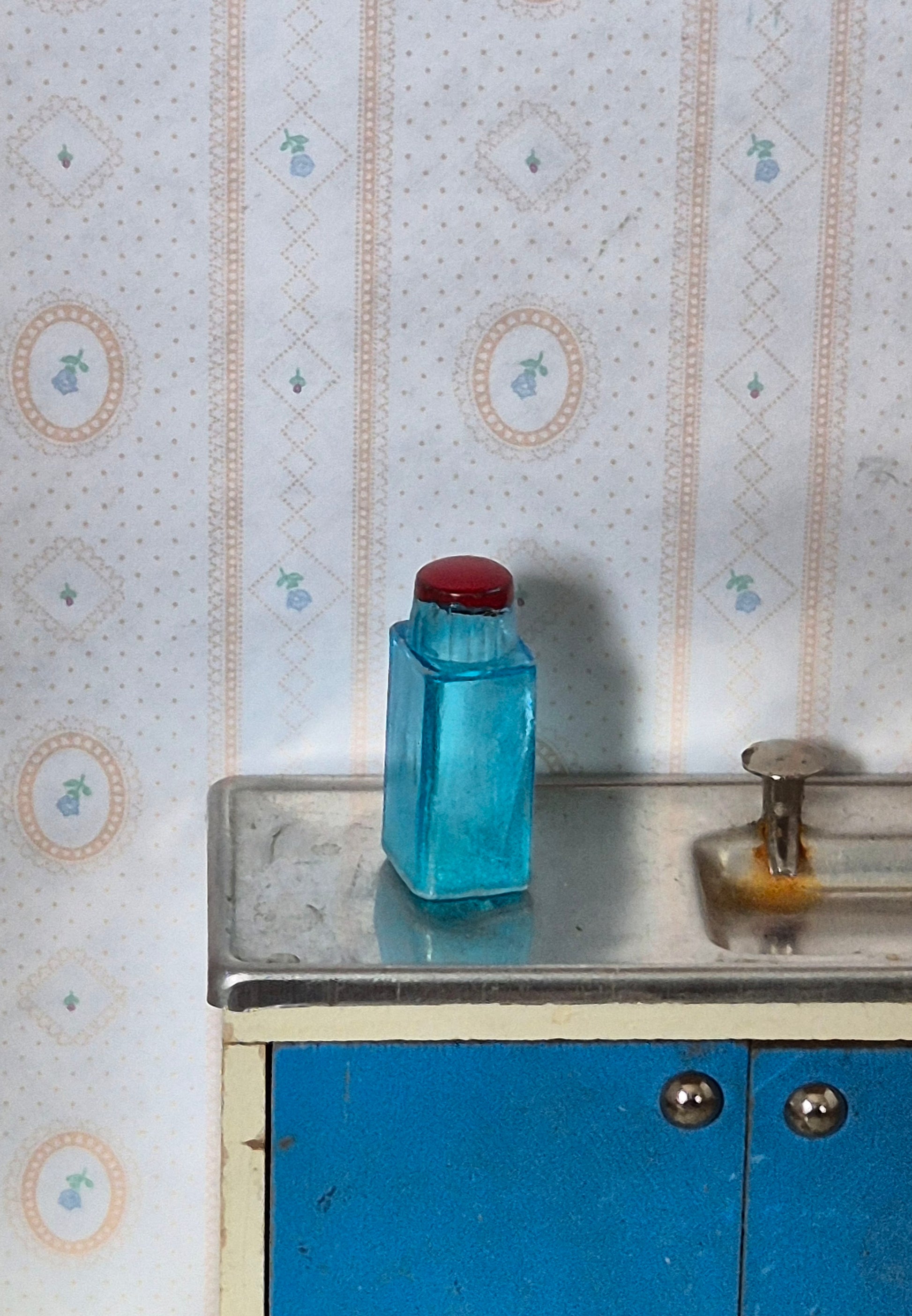 Pæn vintage lyseblå beholder med rødt låg. Udmærket stand med patina. Ca 3 cm høj.