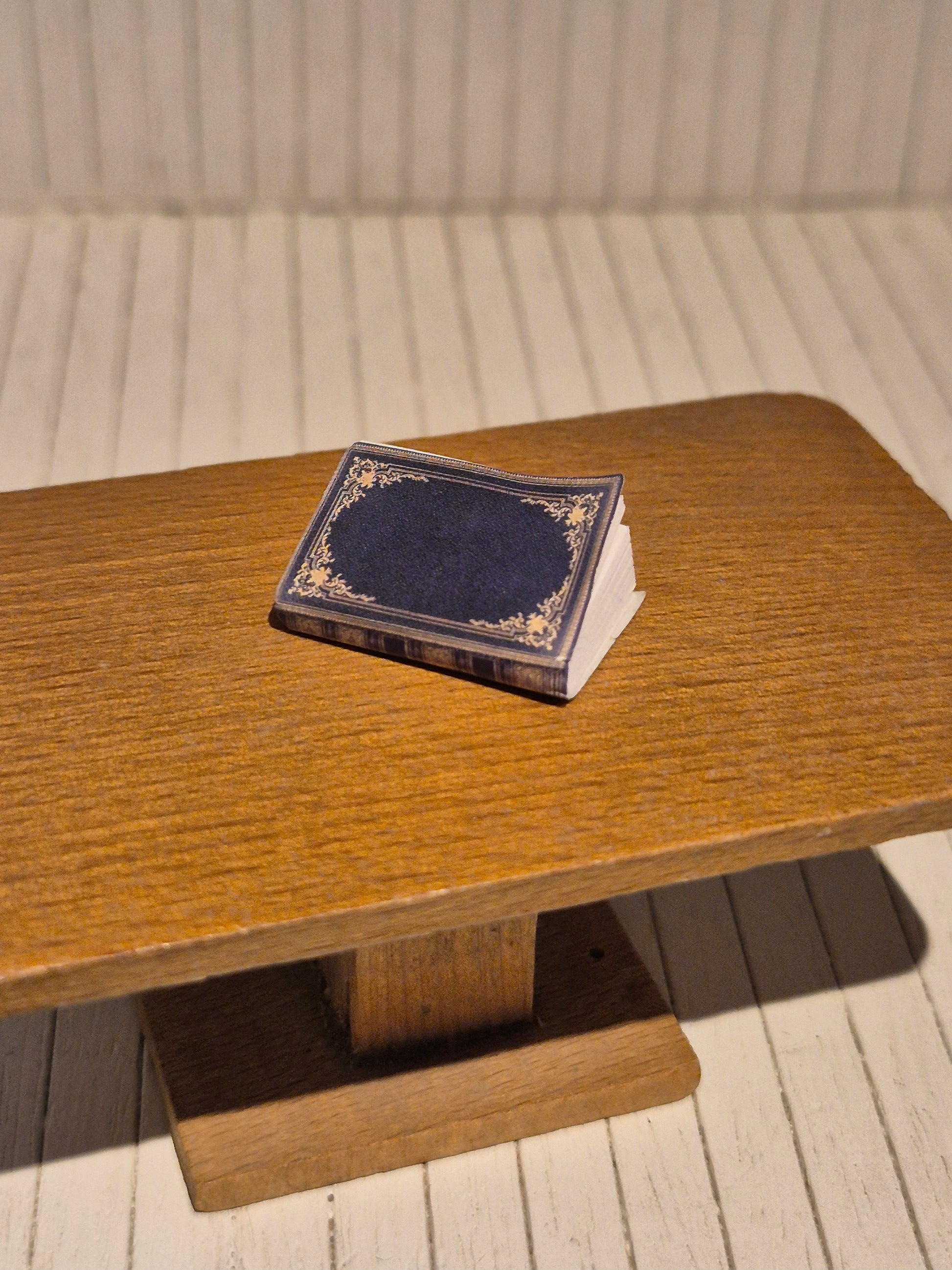 Nice blue book that has golden markings on the cover and white glossy pages inside.