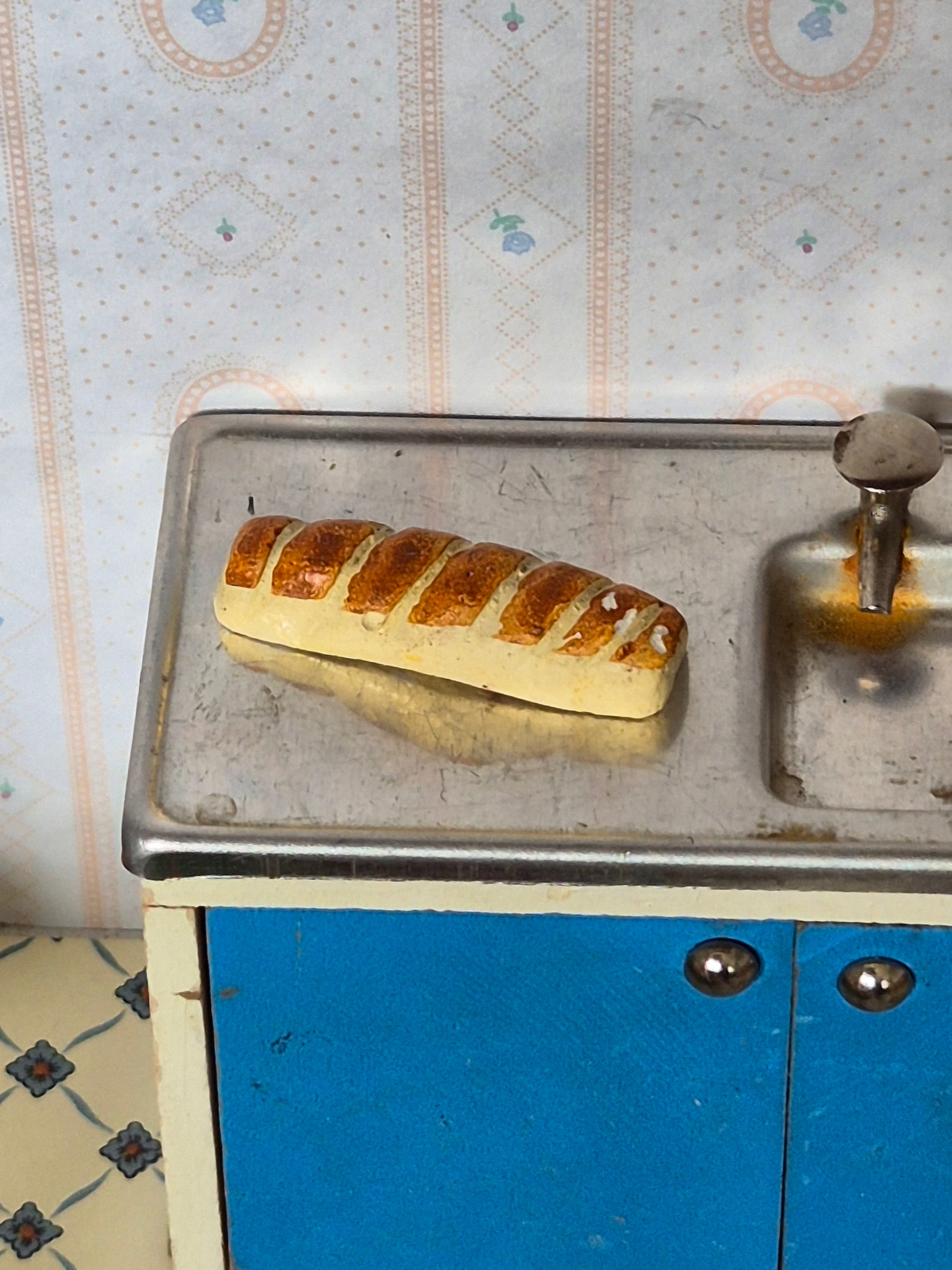 Brød, hjemmelavet af fimoler eller ler. Udmærket stand. Det er ca 4 cm.