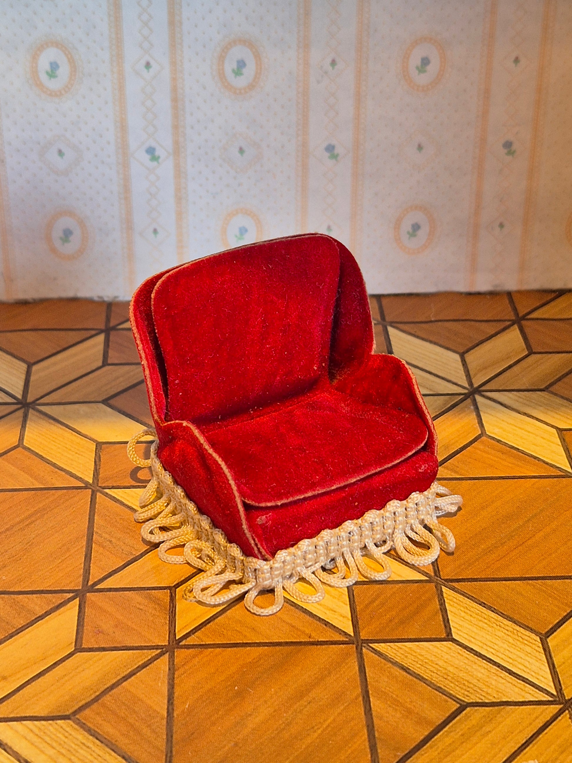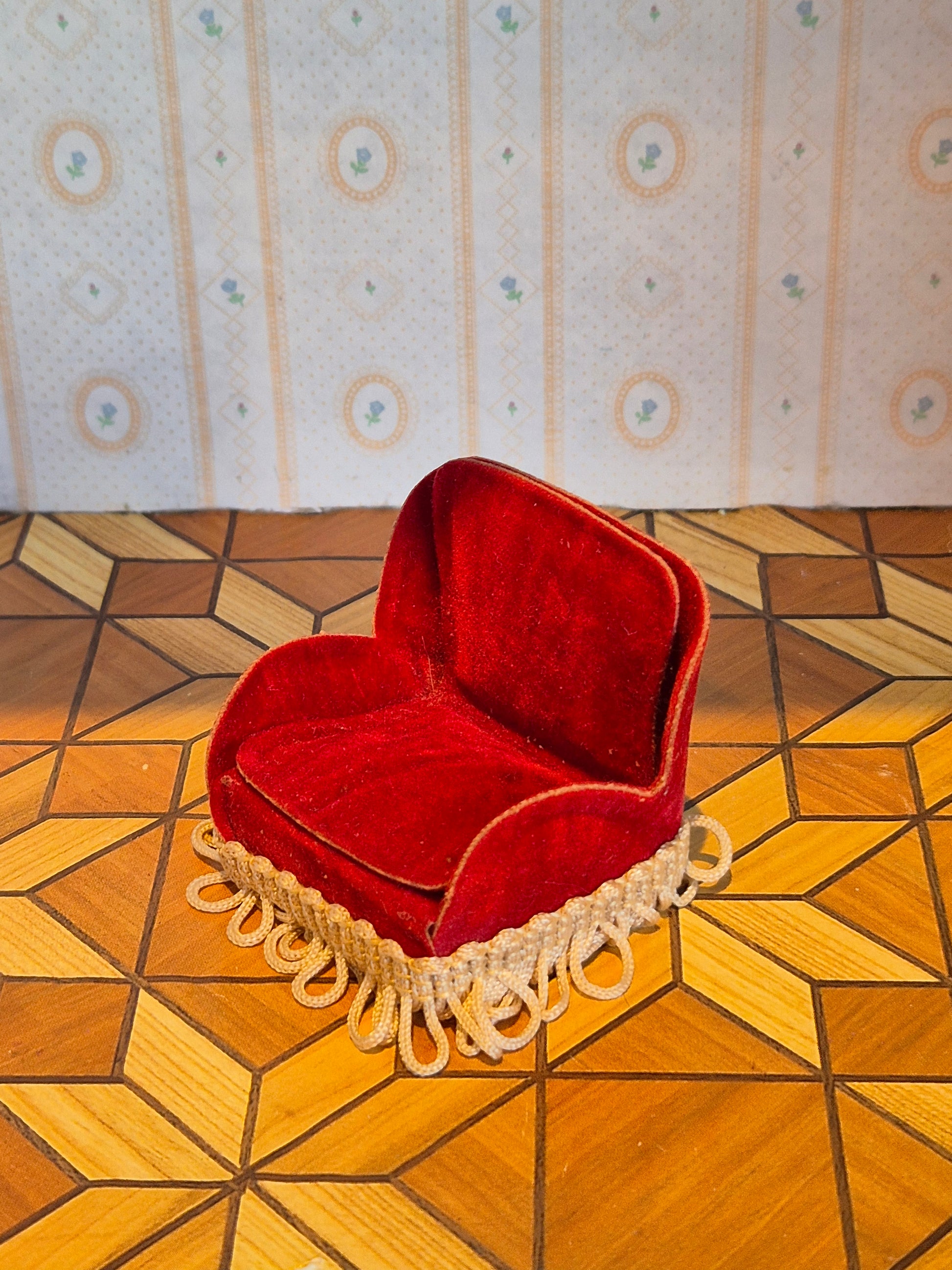 Lænestol af mørkerød fløjls-lignende stof med blondekant.