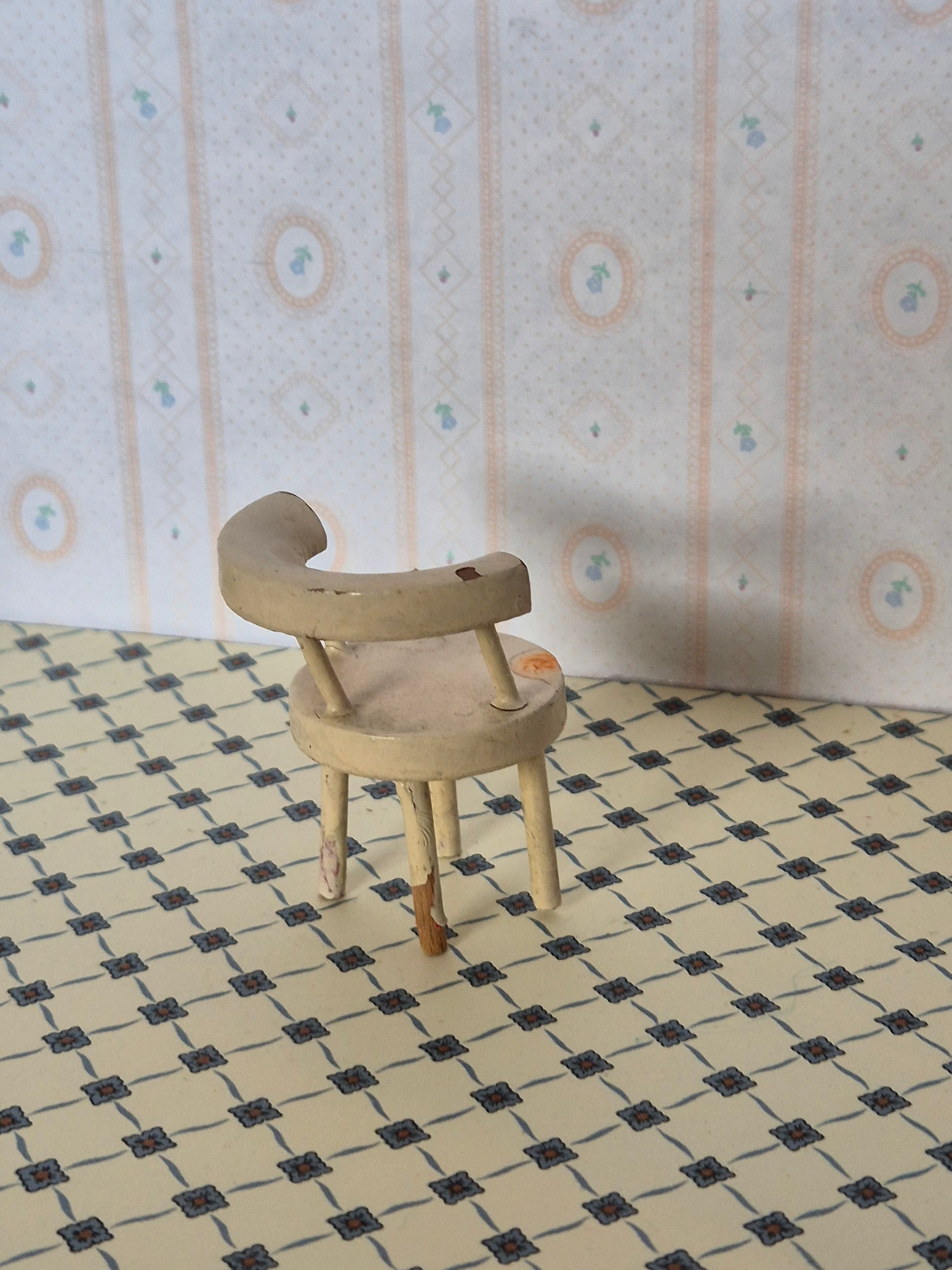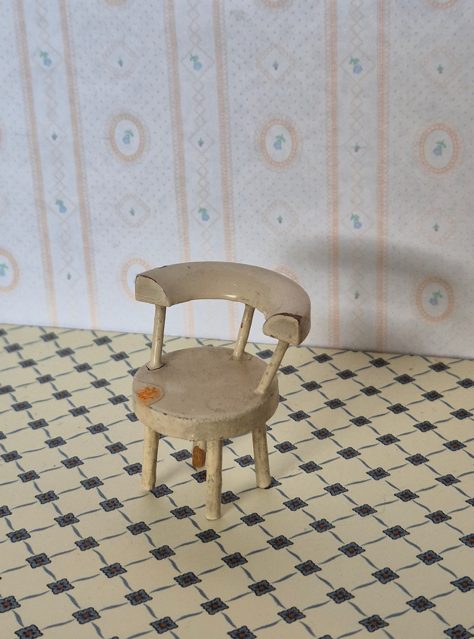 Vintage 1:16 hvidmalet krostol af træ. Den har patina og brugsspor.