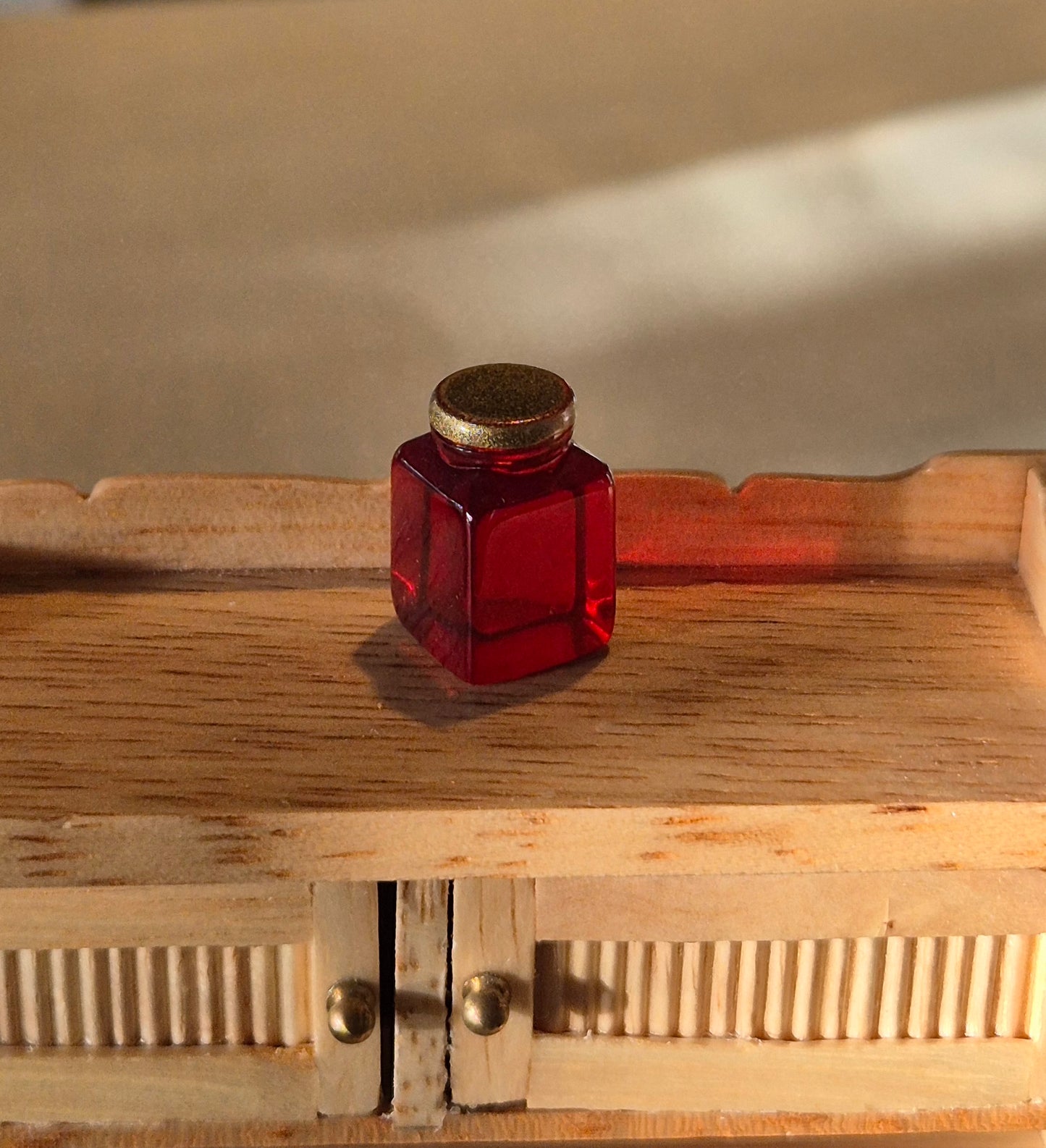 Glaskrukke med rød gelé til dukkehus køkkenet.