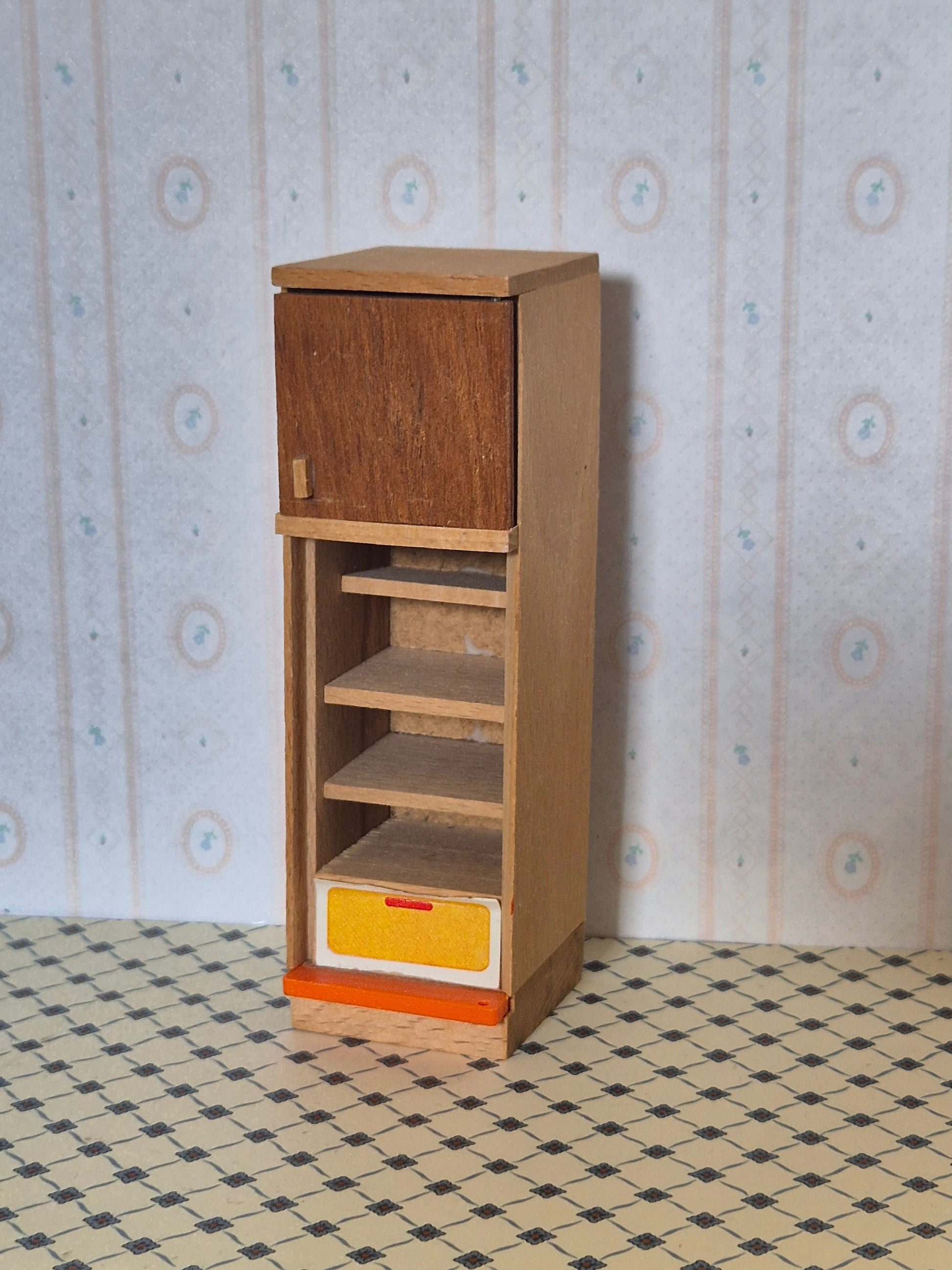 Vintage køleskab af mærket Hanse af Skandinavien. Der mangler en orange låge. Sjældent køleskab. Det er af træ.