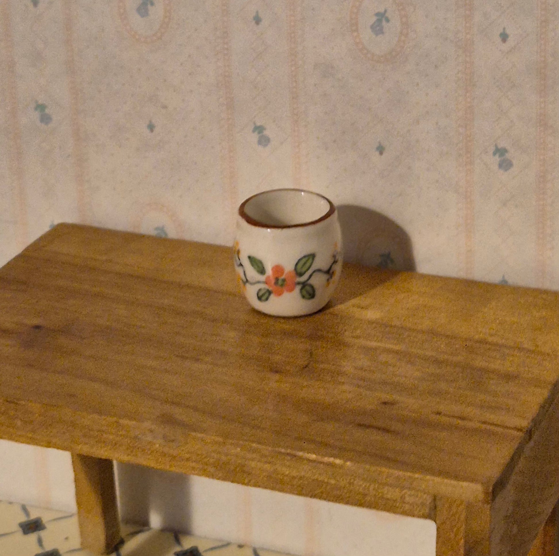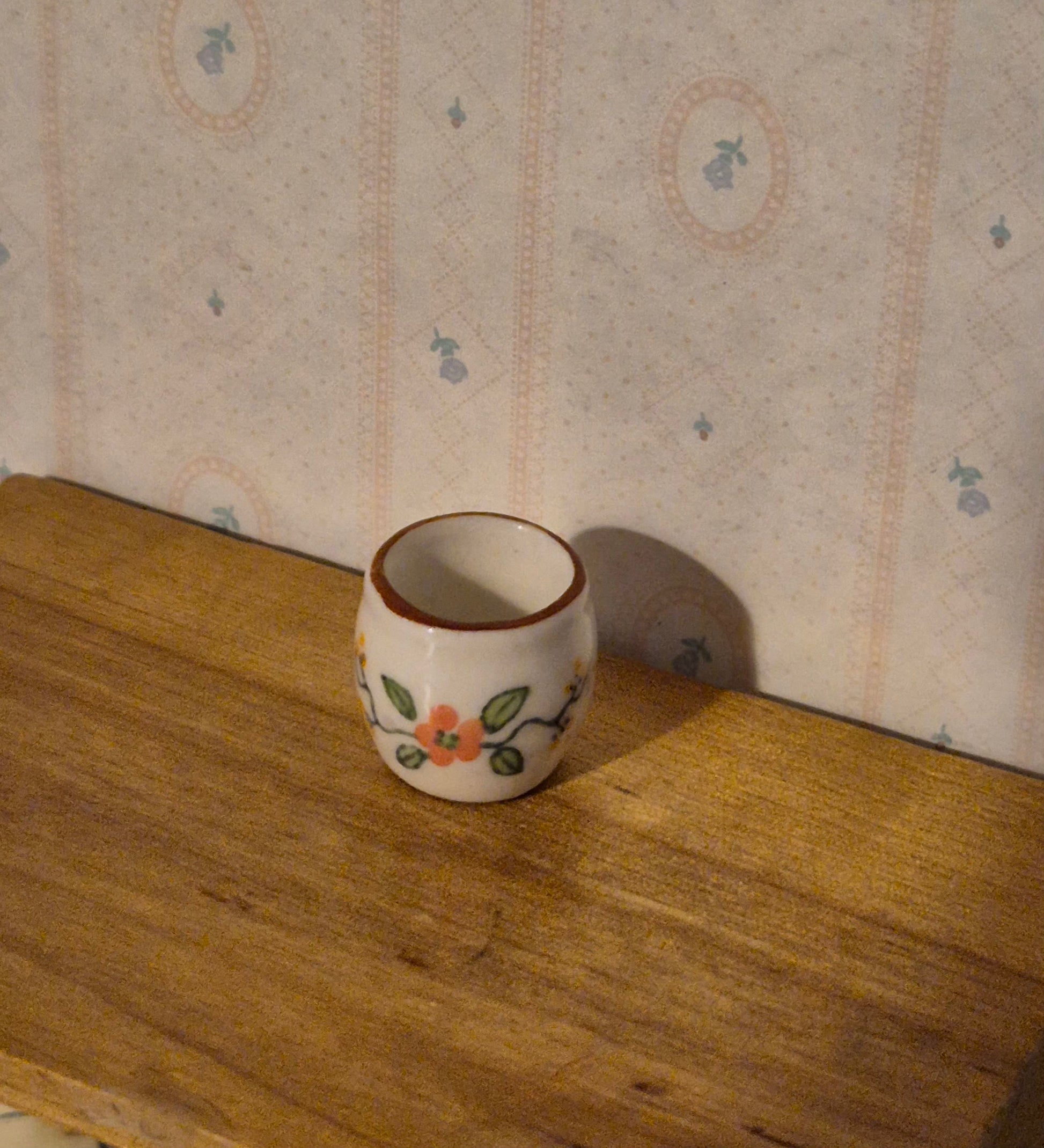 Pæn porcelæn krukke eller potteskjuler med blomstermotiv. Den er ca 1,4 cm høj.
