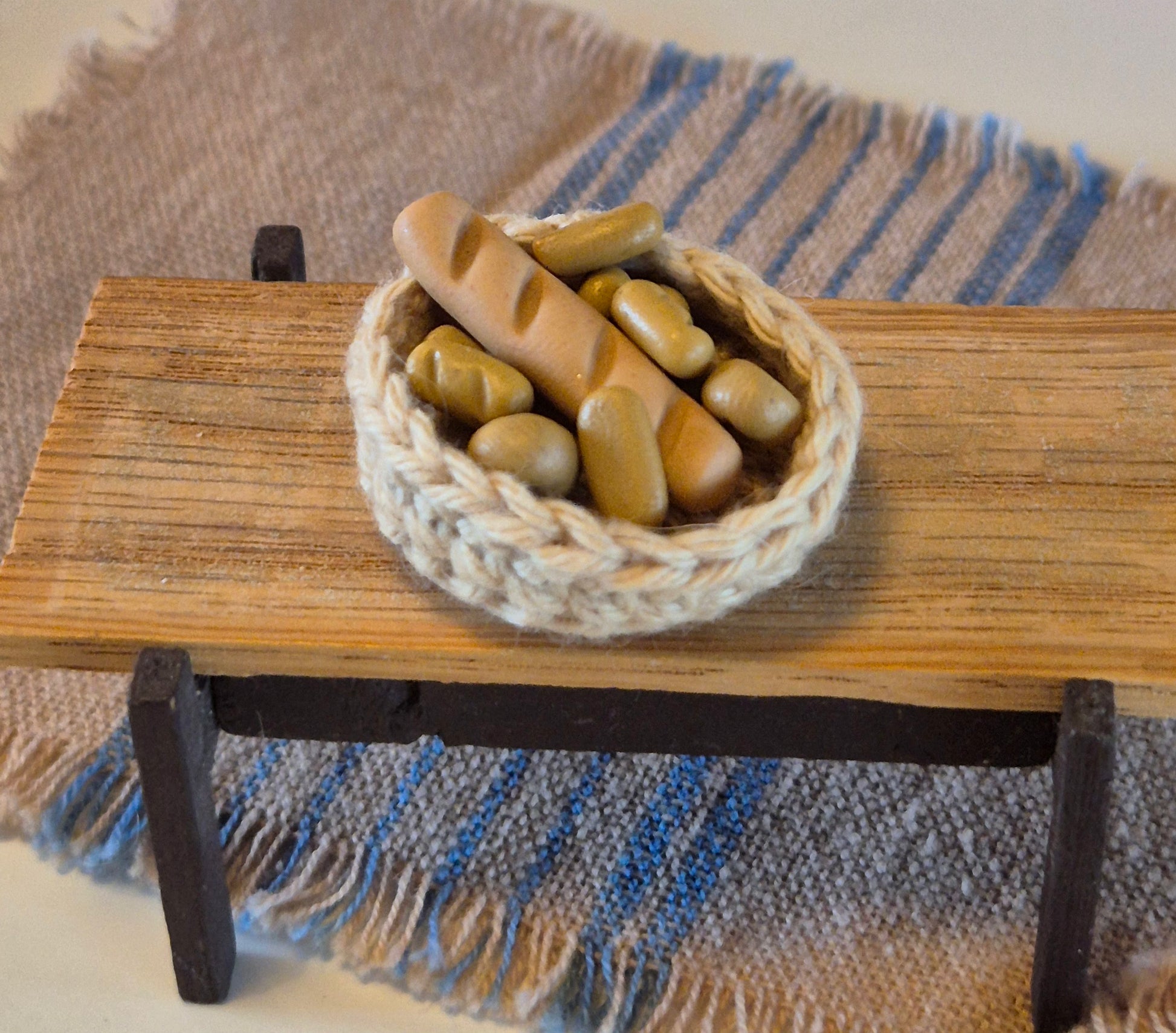 Miniature bread and Flutes in a crocheted basket. The food items. The bread is made of fimols, homemade along with the basket by a private person.