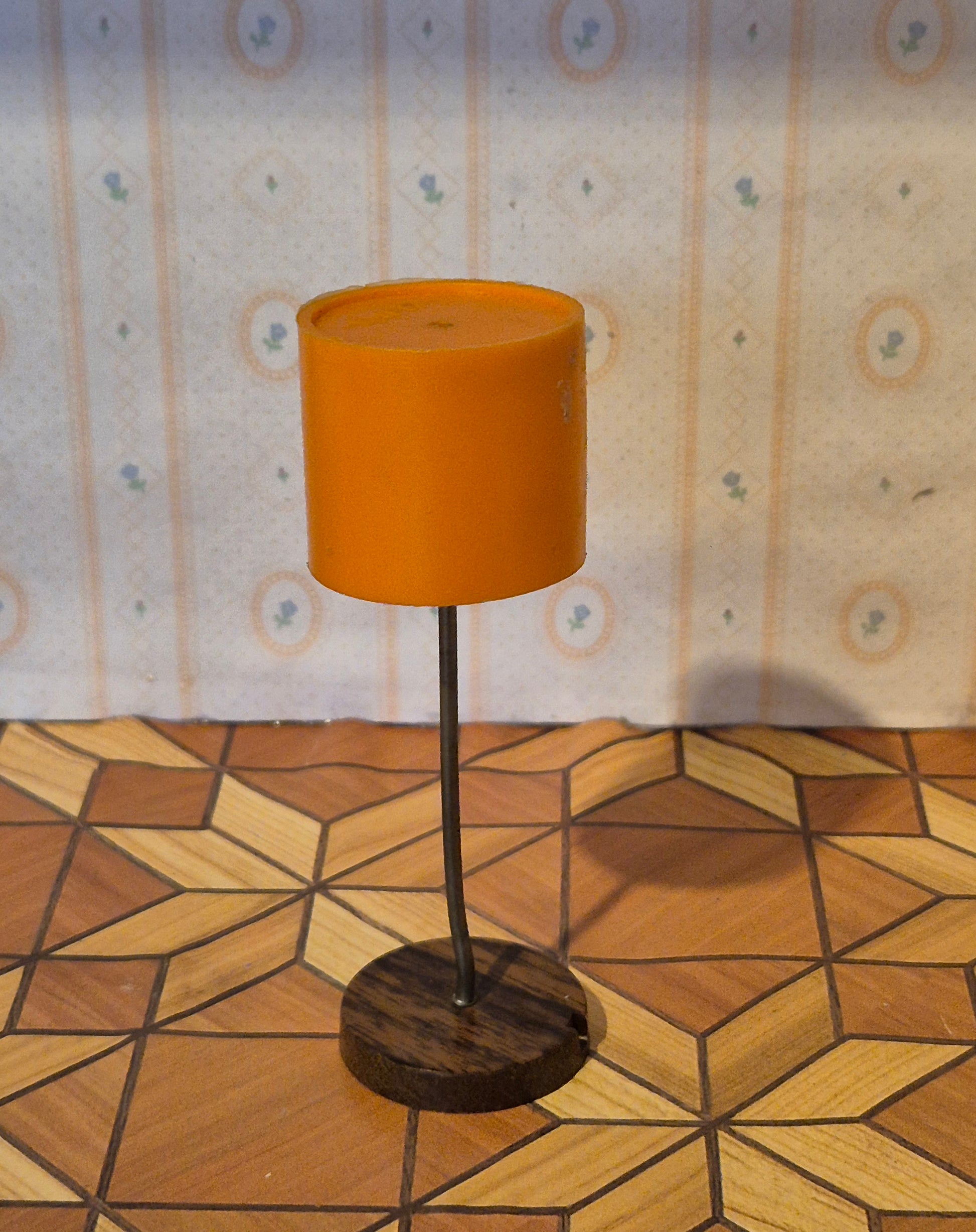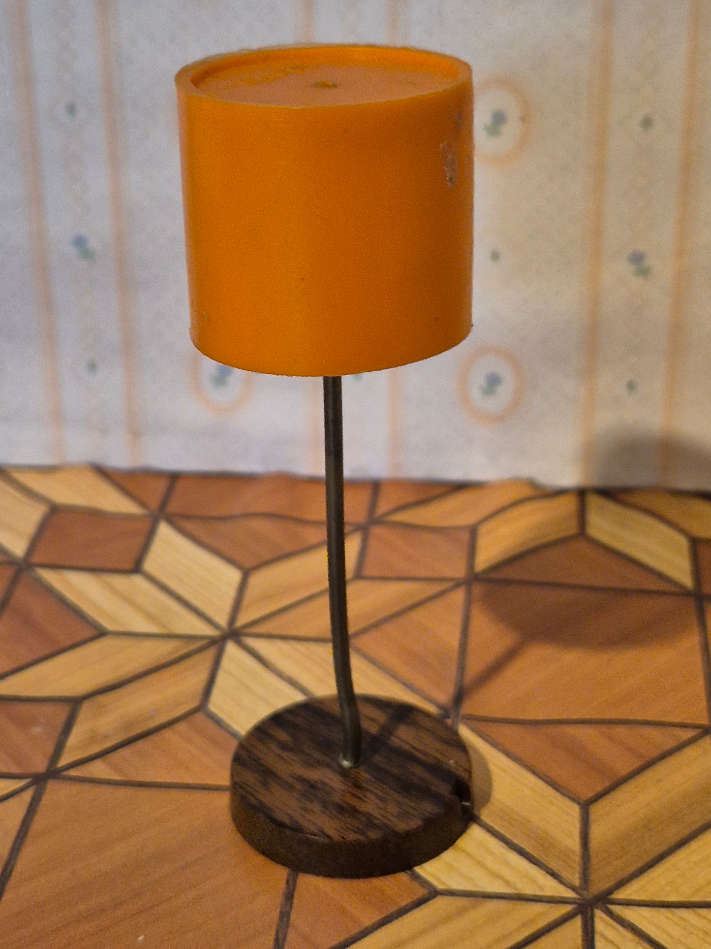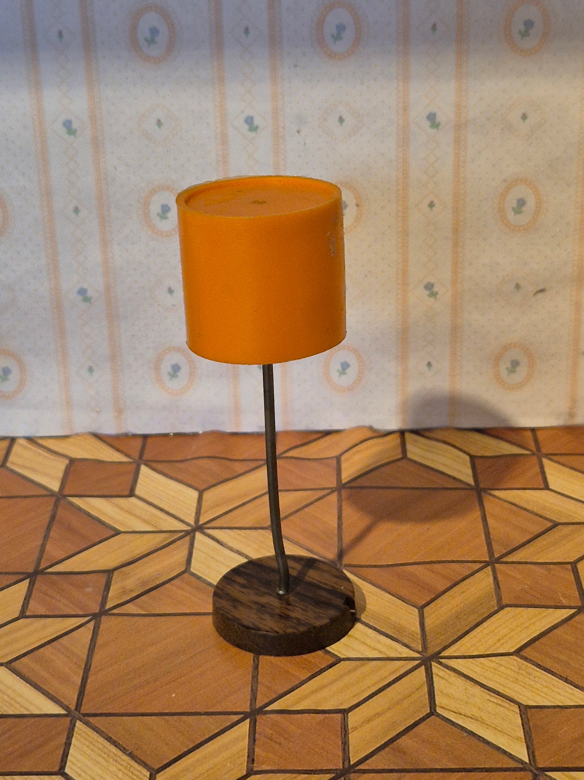 Lisa eller Lundby lampe, standerlampe med orange lampeskærm.