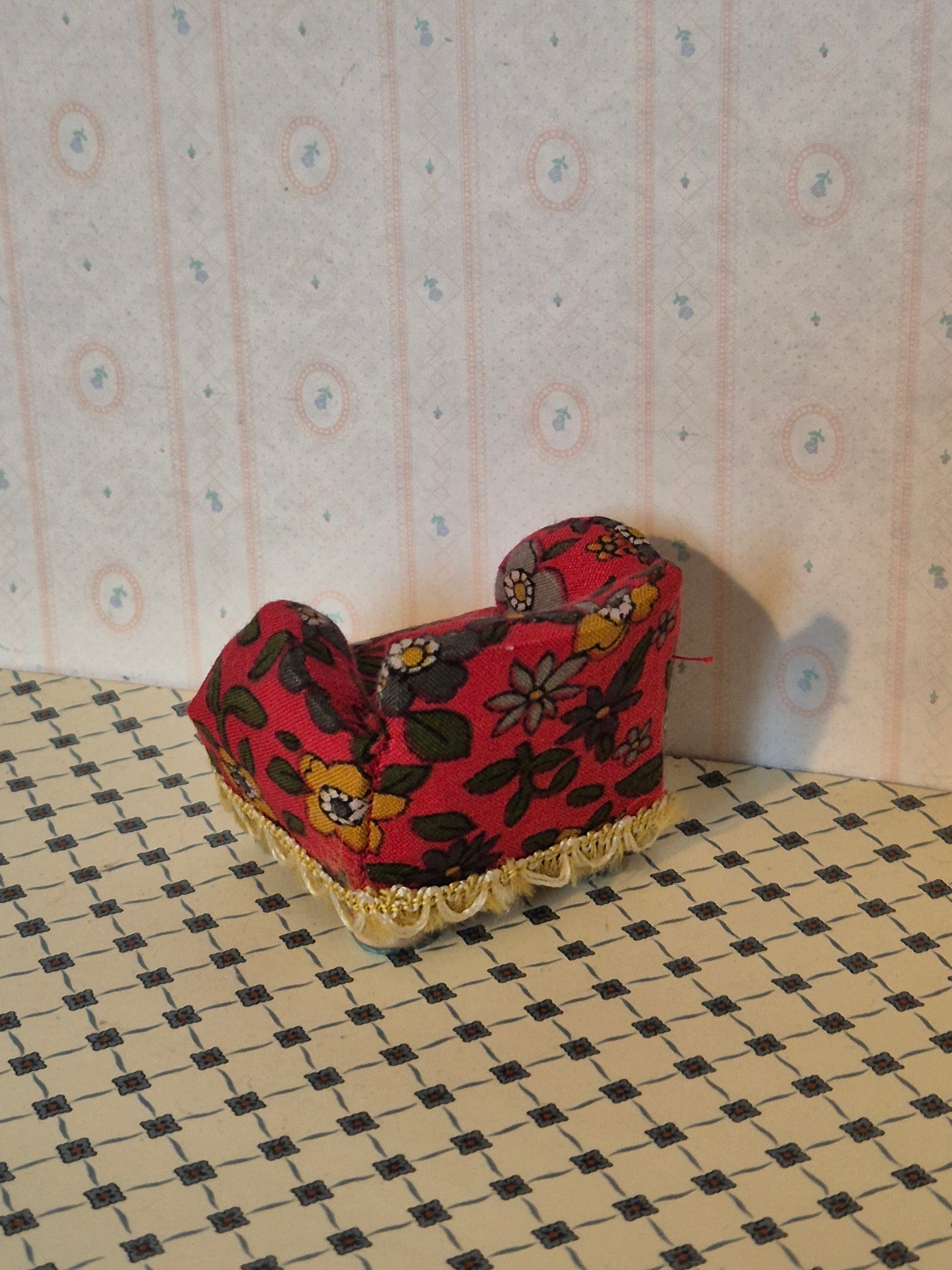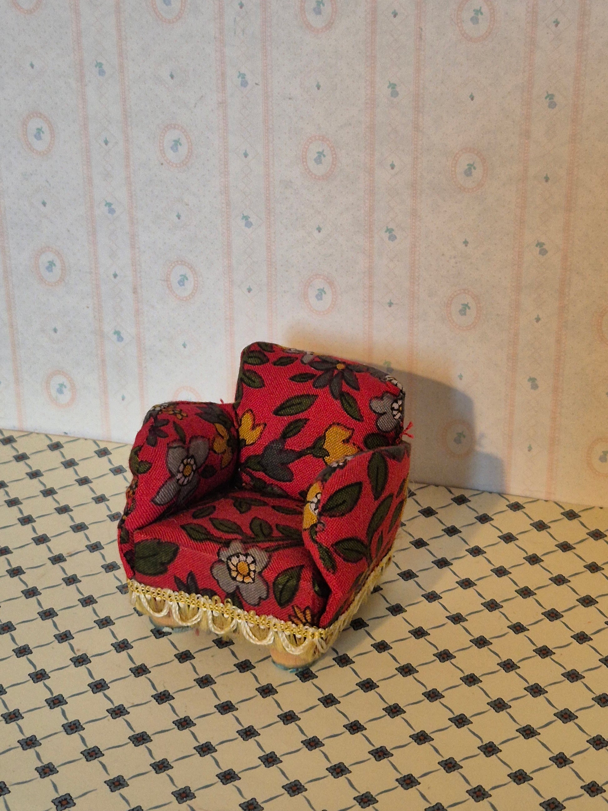 Lerro lænestol fra 1960erne med blomstermotiv og patina.