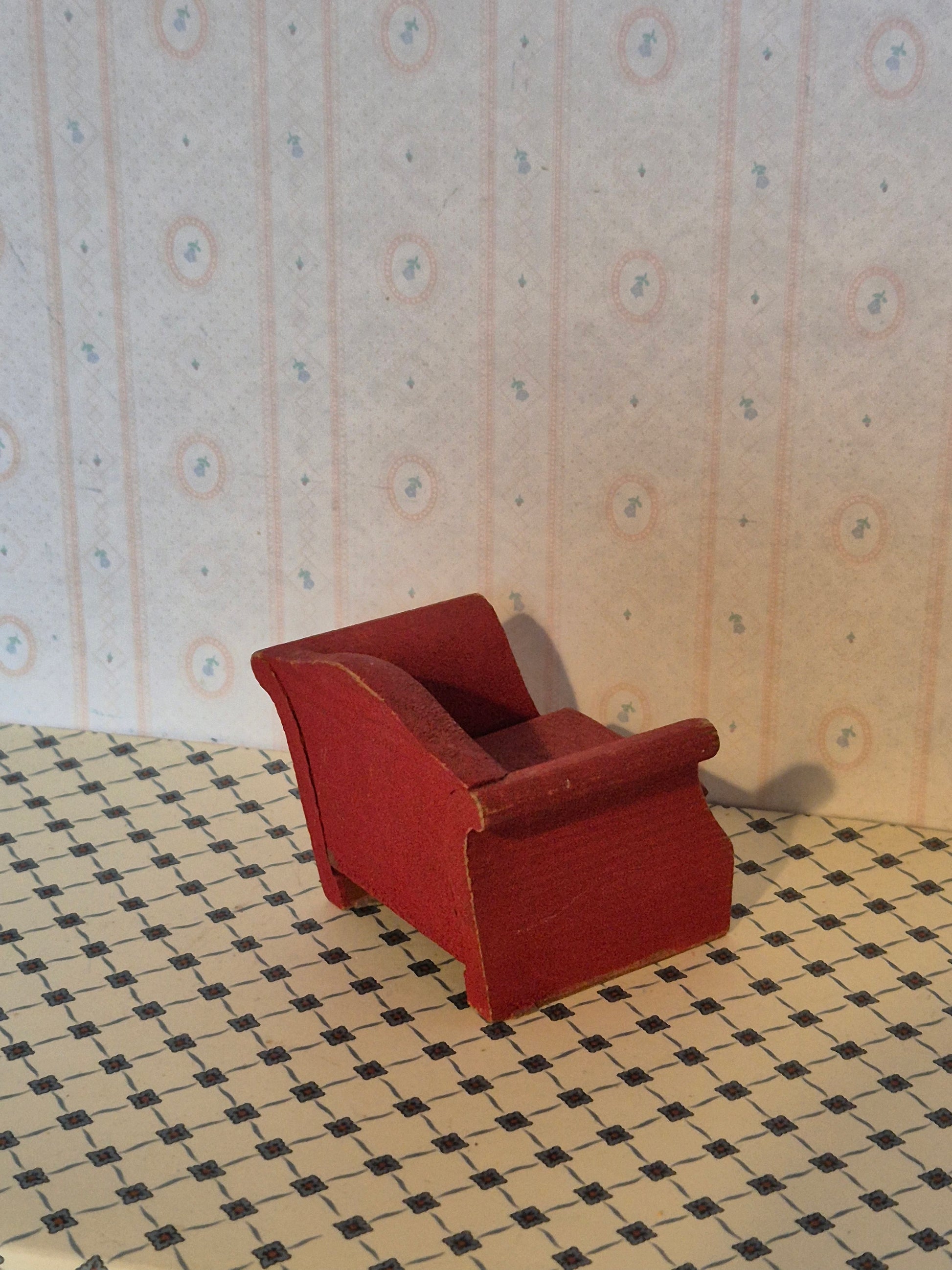 Lerro vintage sofa i rød træ str 1:16 med tegn på brug, lidt skrammer og patina.