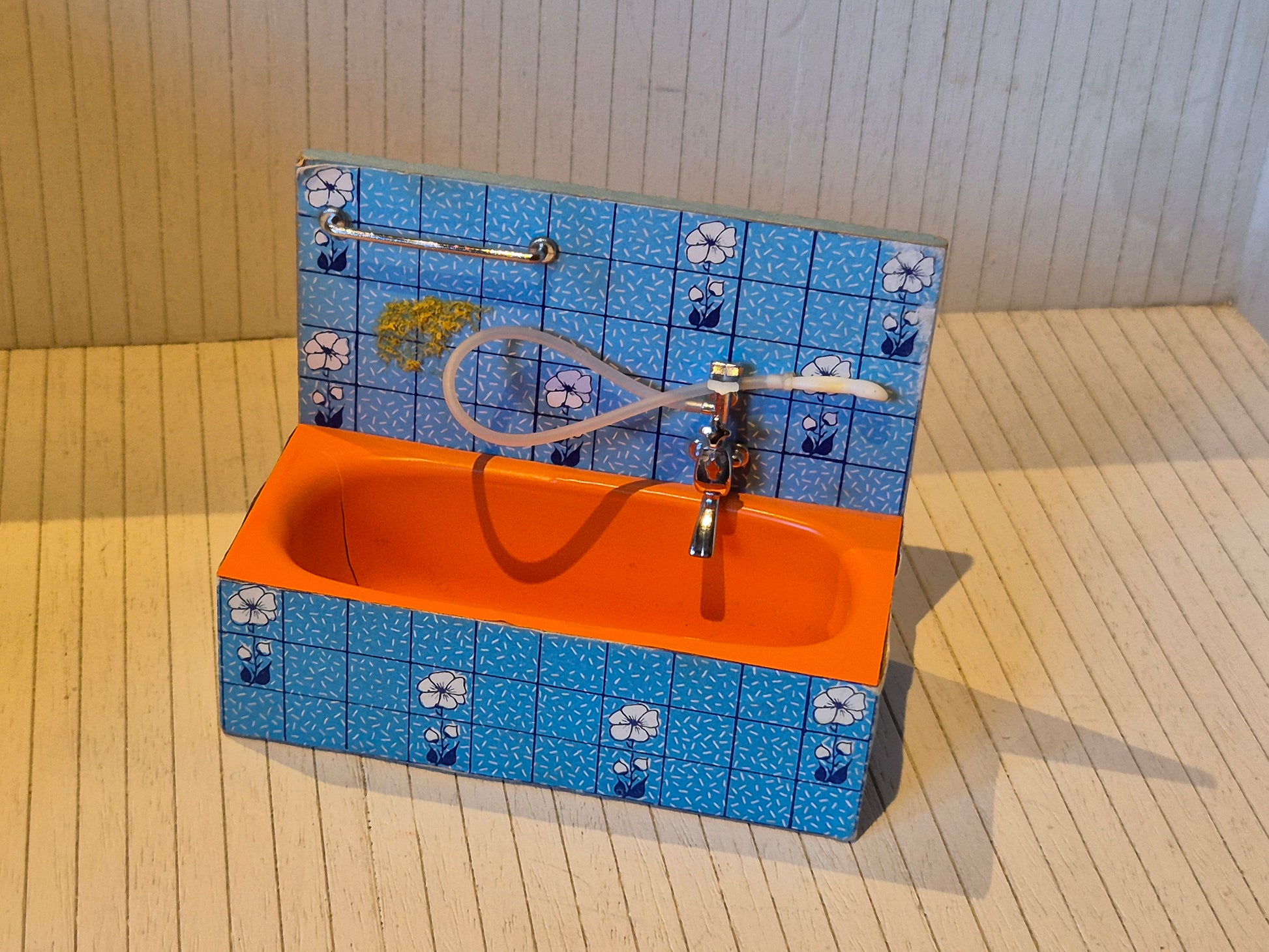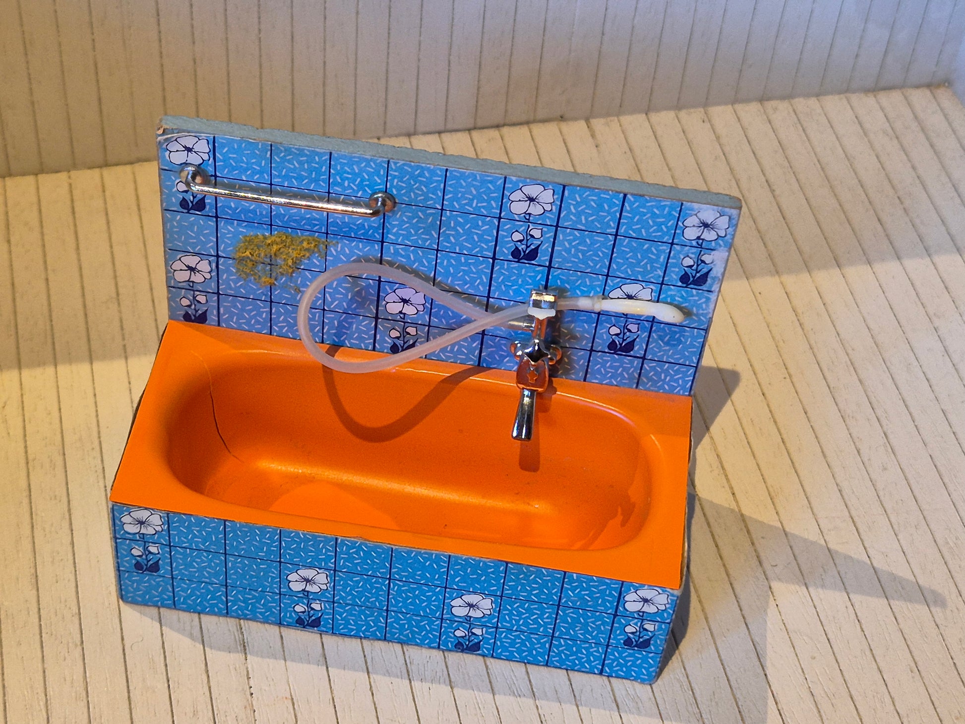 Lisa af Danmark dollhouse furniture, bathtub in orange with light blue tile wallpaper with white flowers. It is original, however the towel is missing.