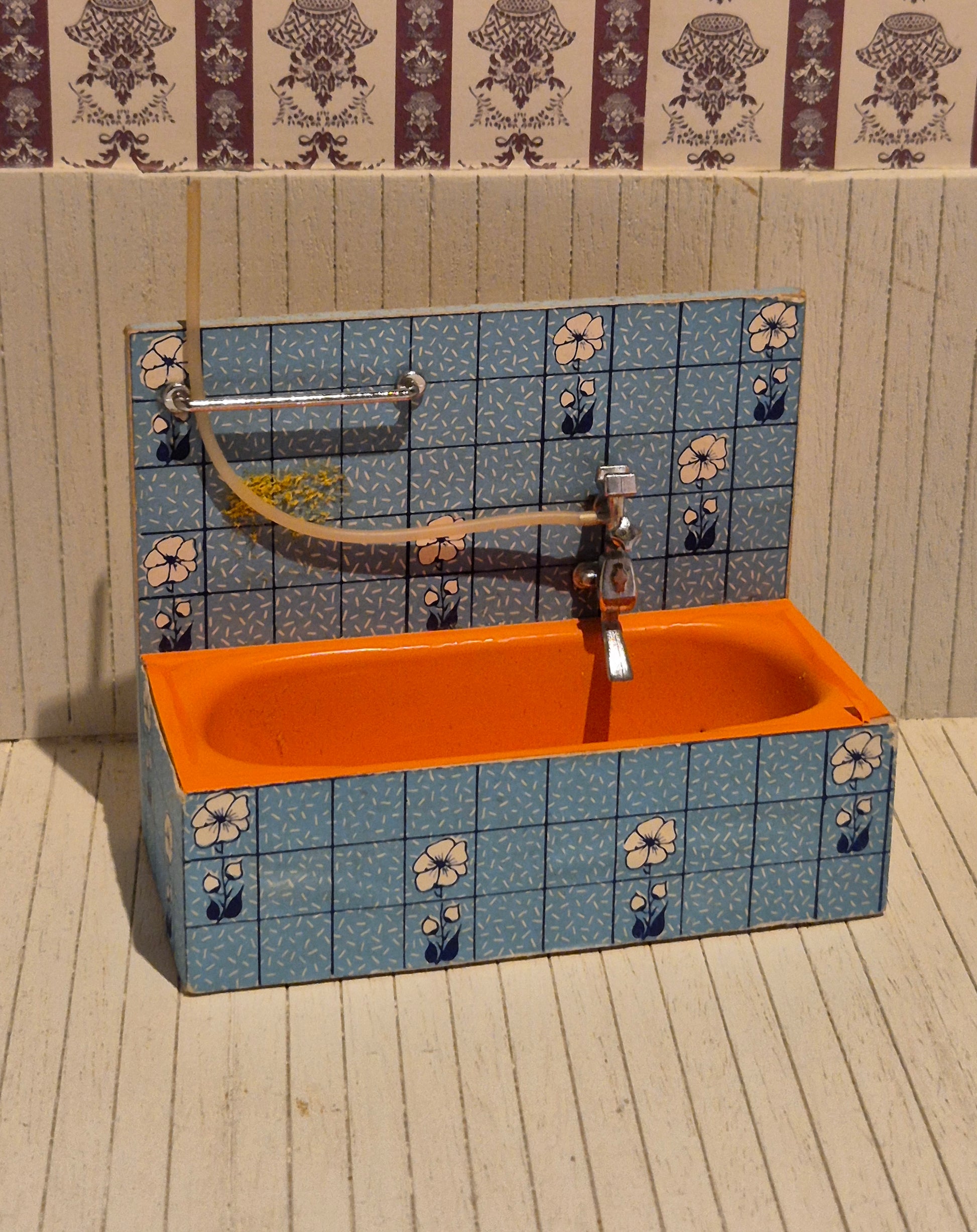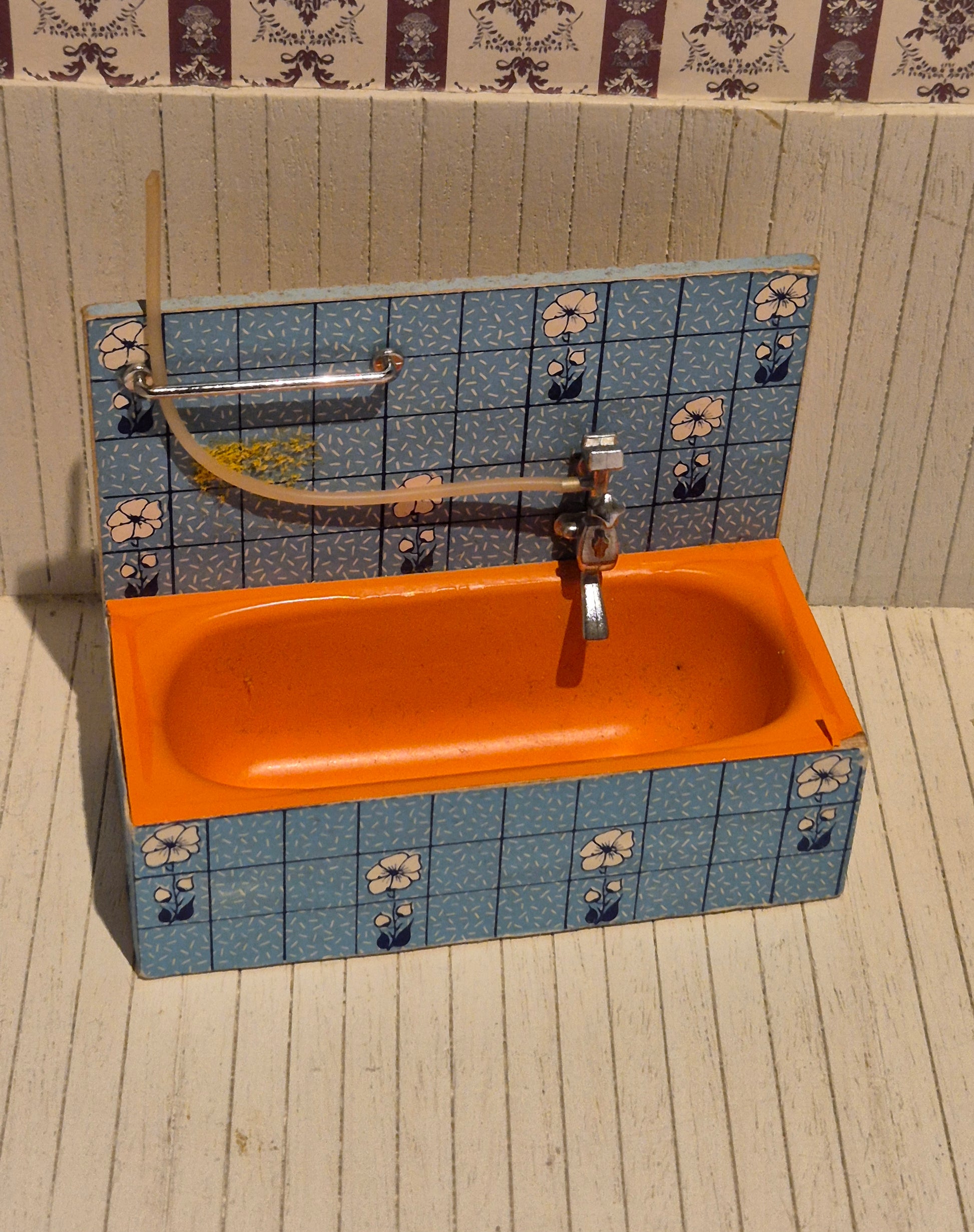 Nice classic dollhouse bathtub in orange with light blue tile wallpaper with white flowers by the brand Lisa af Danmark. Towel and shower head missing, otherwise intact.