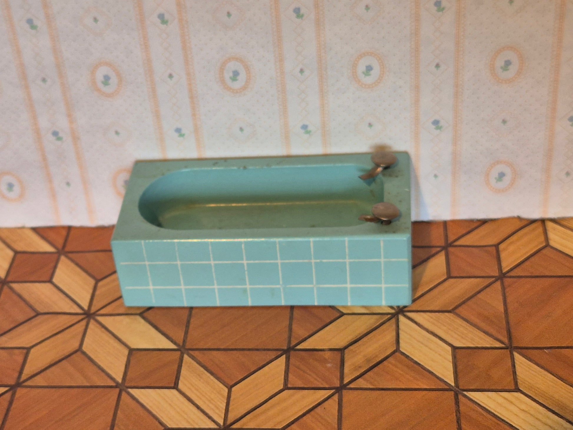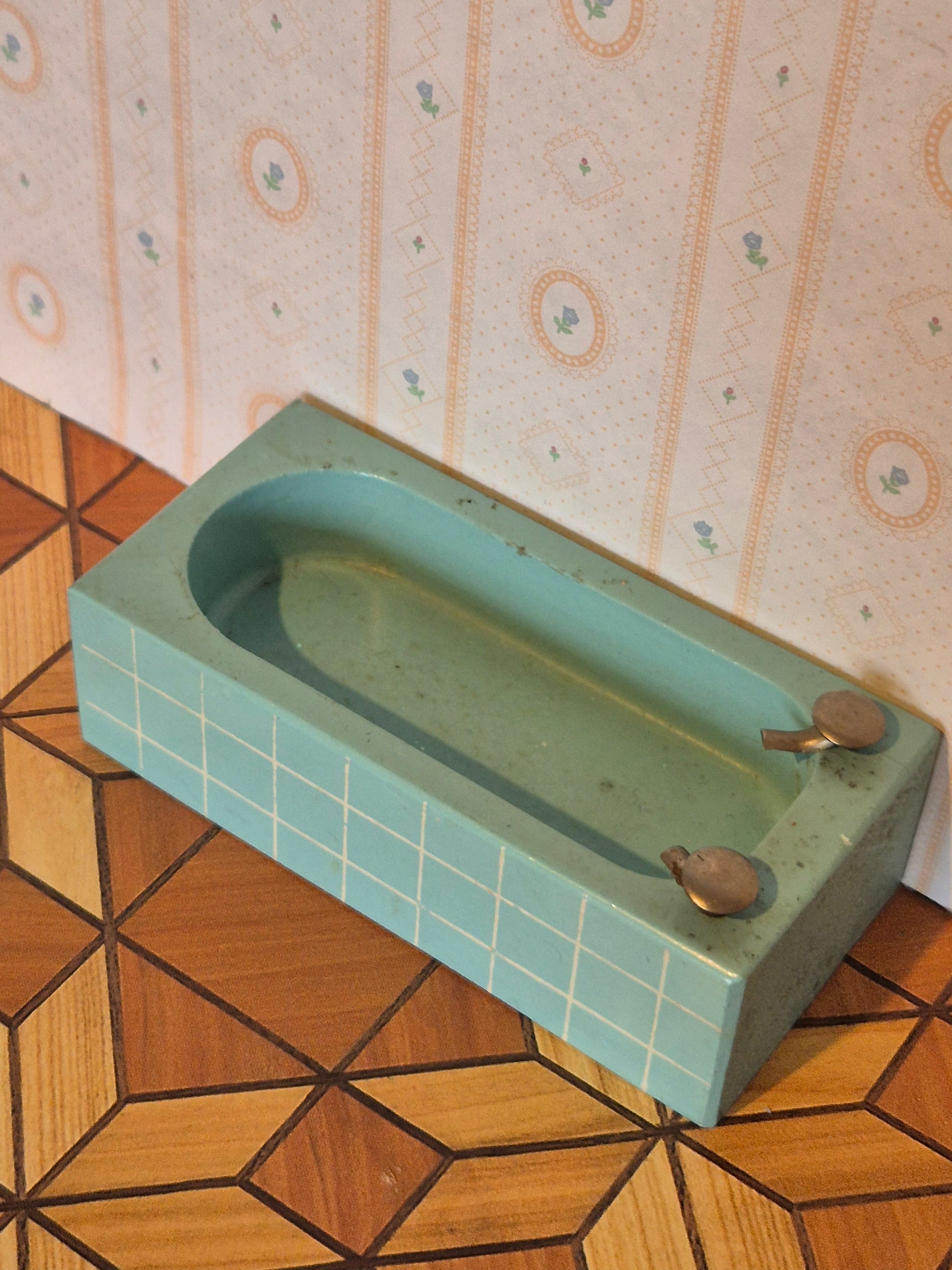 Pænt badekar i turkis af træ med hvide tern langs siden. Det er ældre og af mærket Lisa af Danmark.