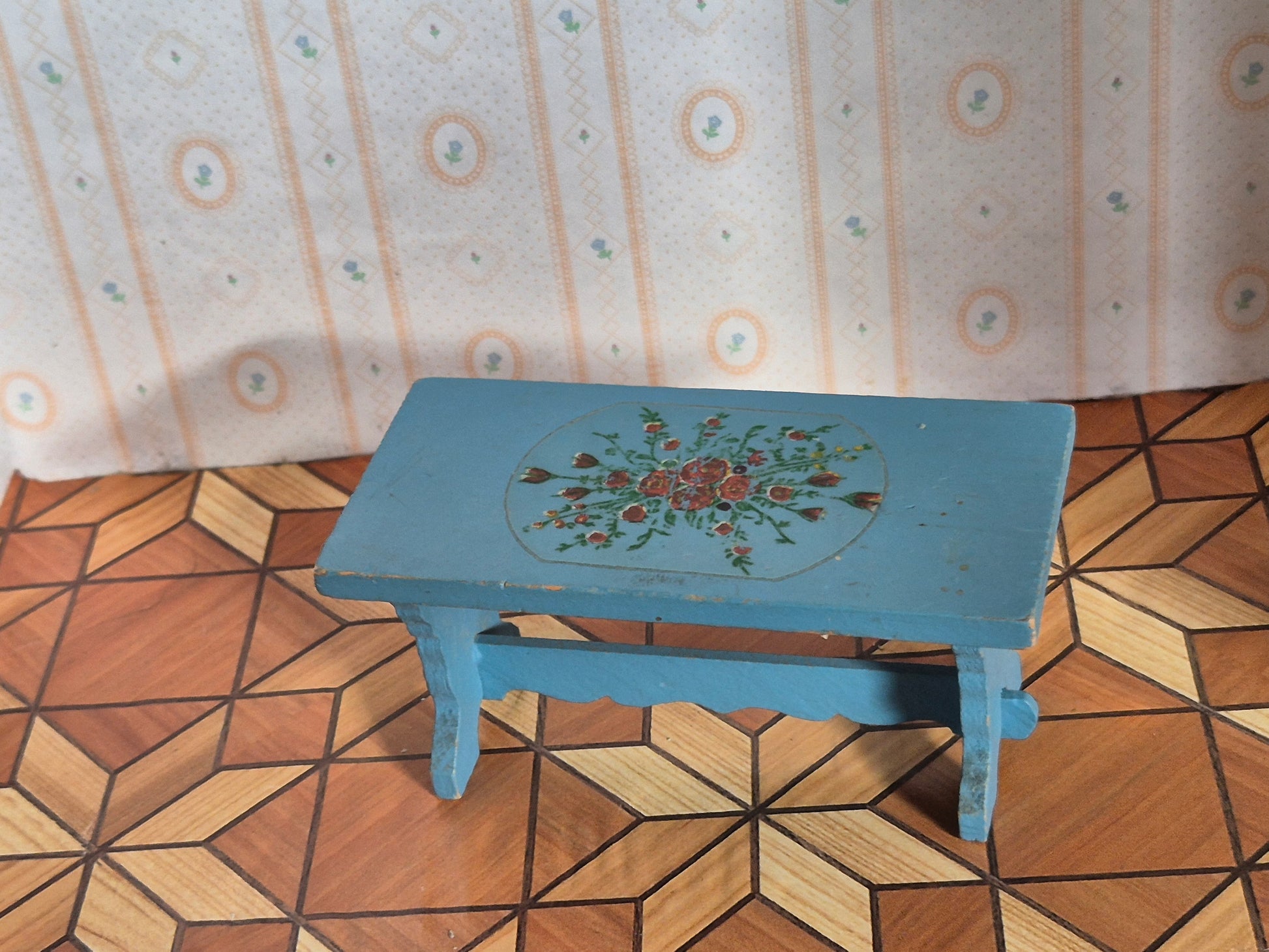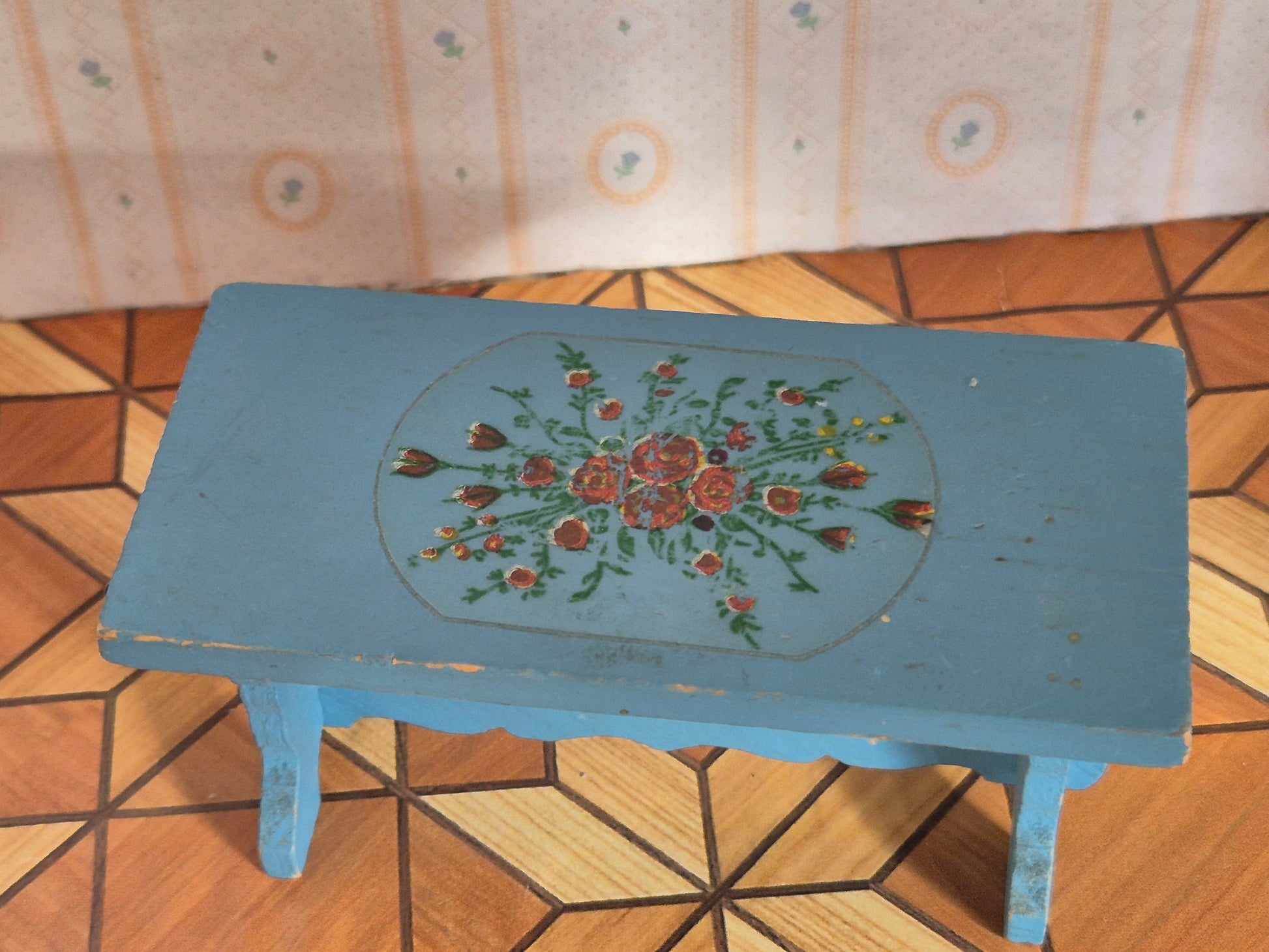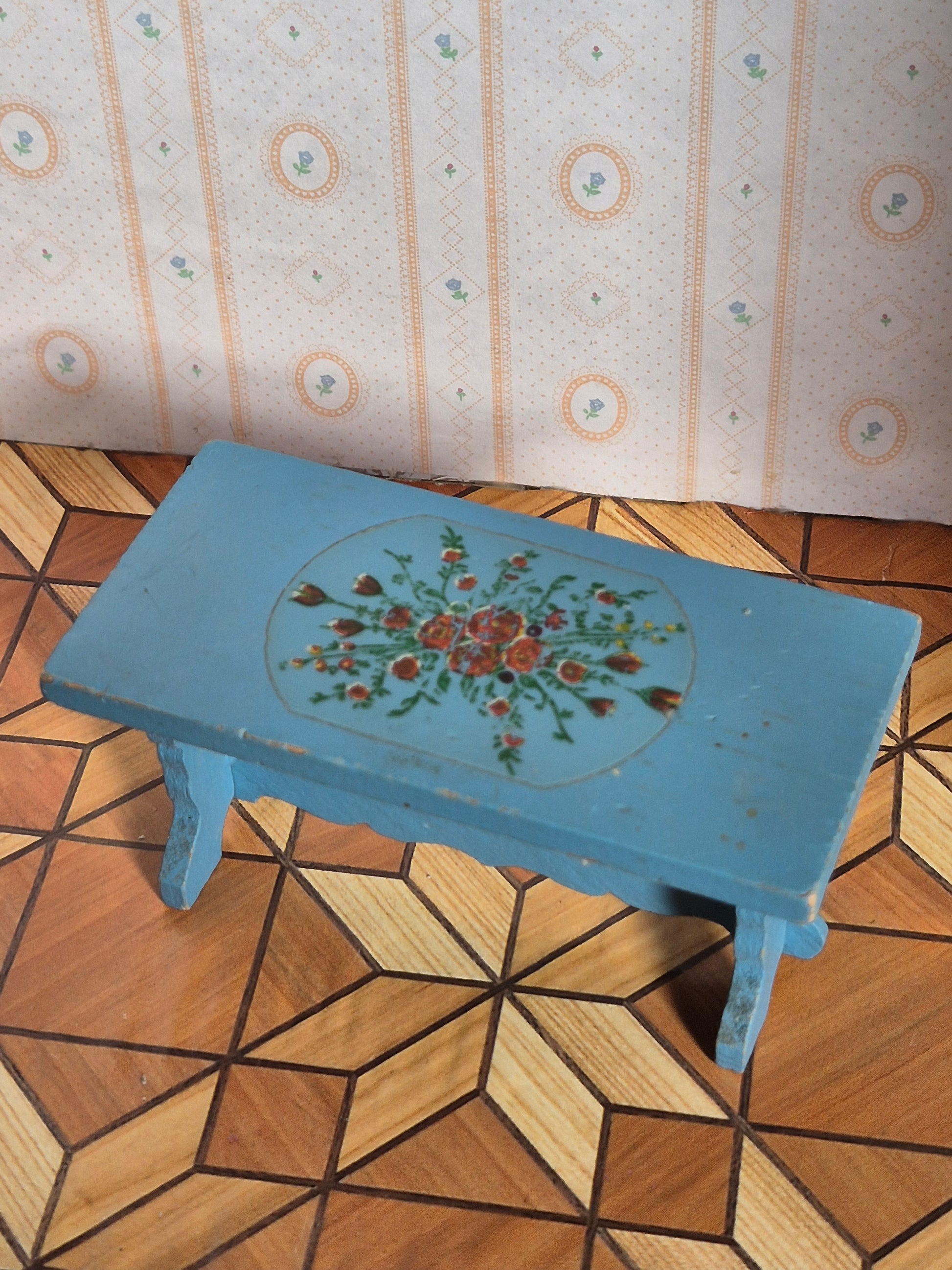 Lisa spisebord af træ, lyseblåt med blomstermotiv. Almue stil. God stand. Patina.