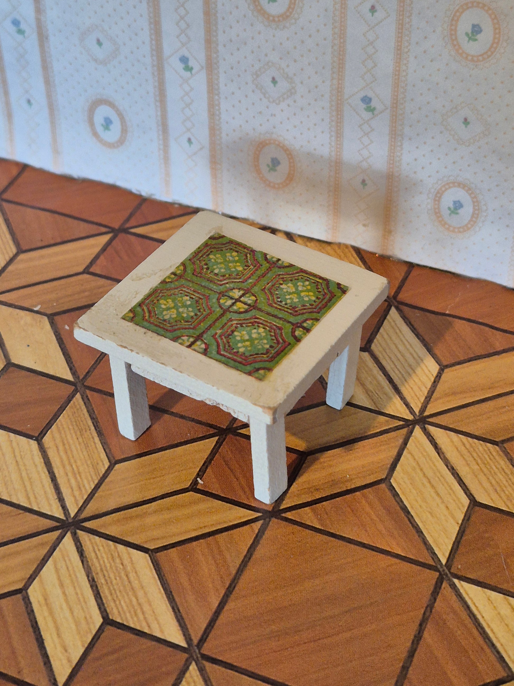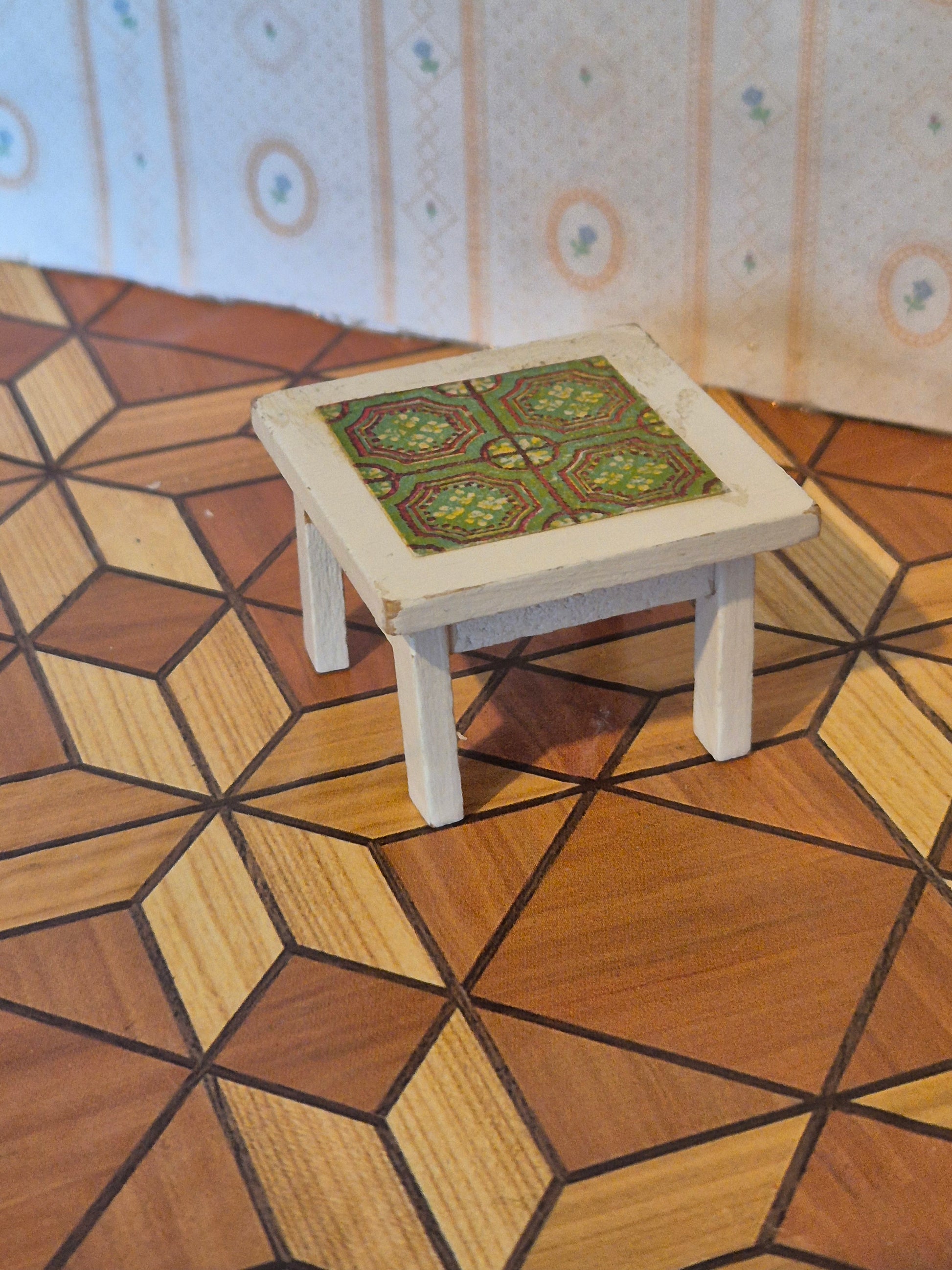 Lille sofabord eller sidebord, hvidt med grøn papirdug, af mærket Lisa af Danmark.