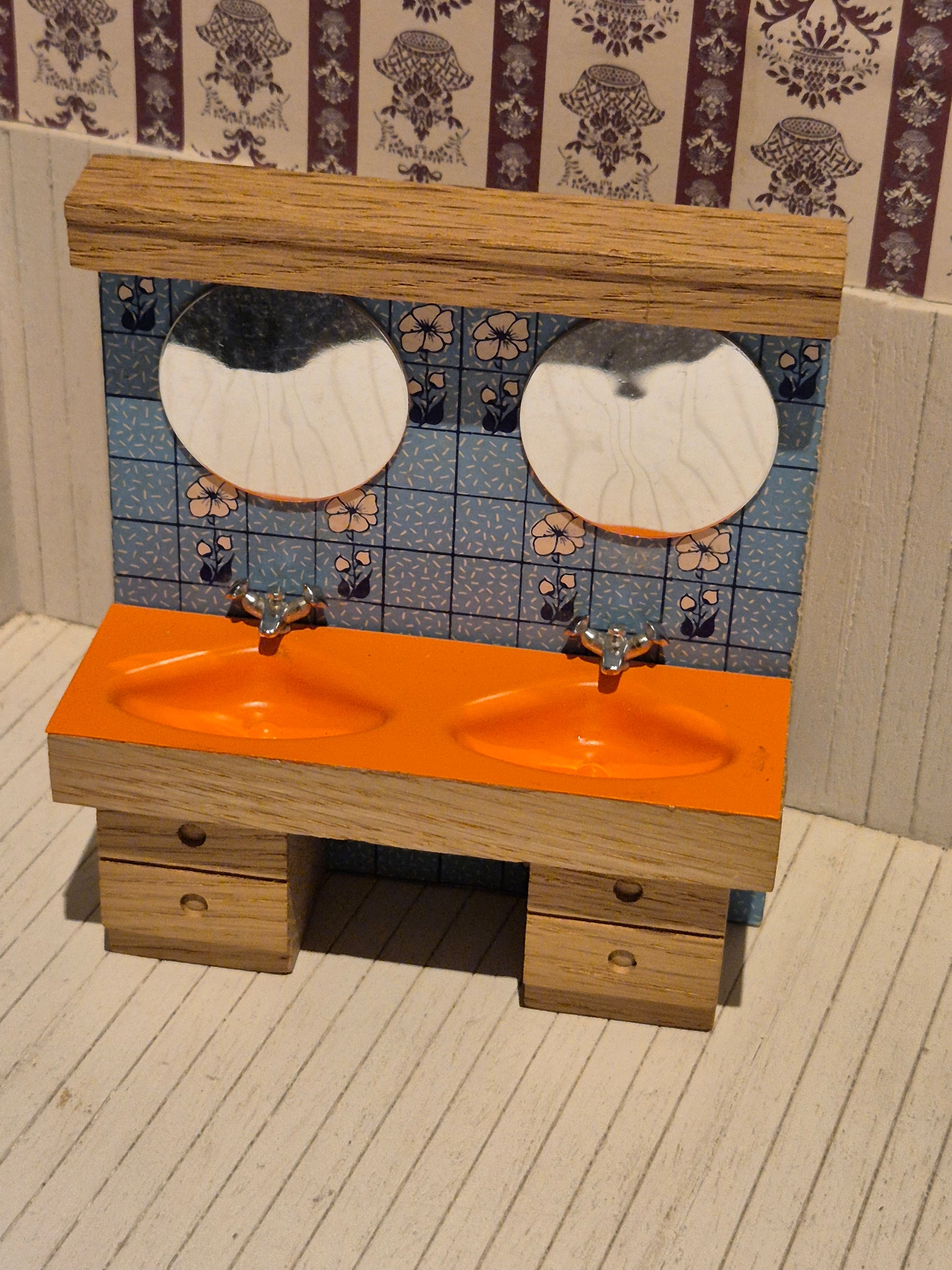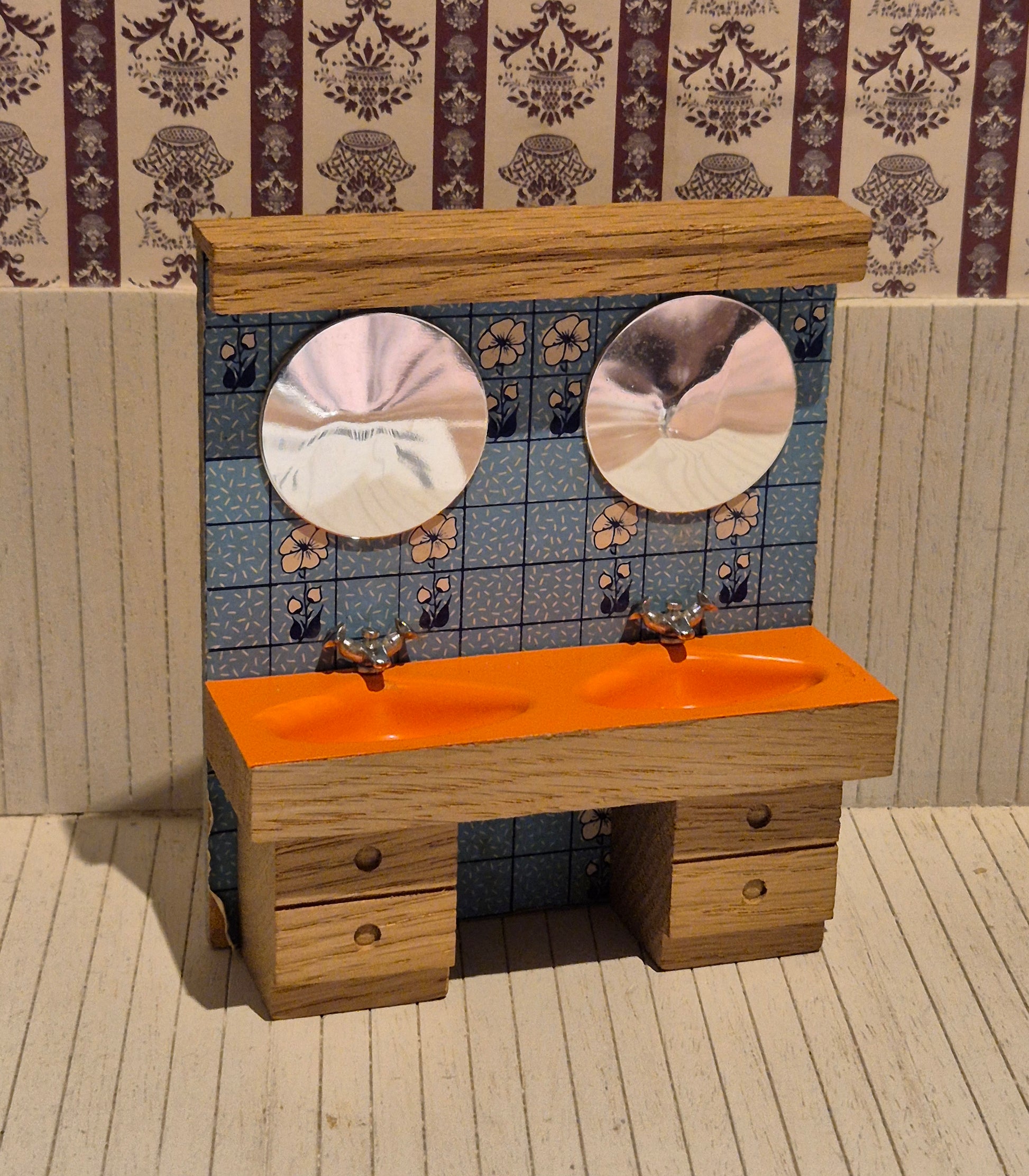 Nice classic dollhouse double sink in orange and wood with light blue tile wallpaper with white flowers by the brand Lisa af Danmark.