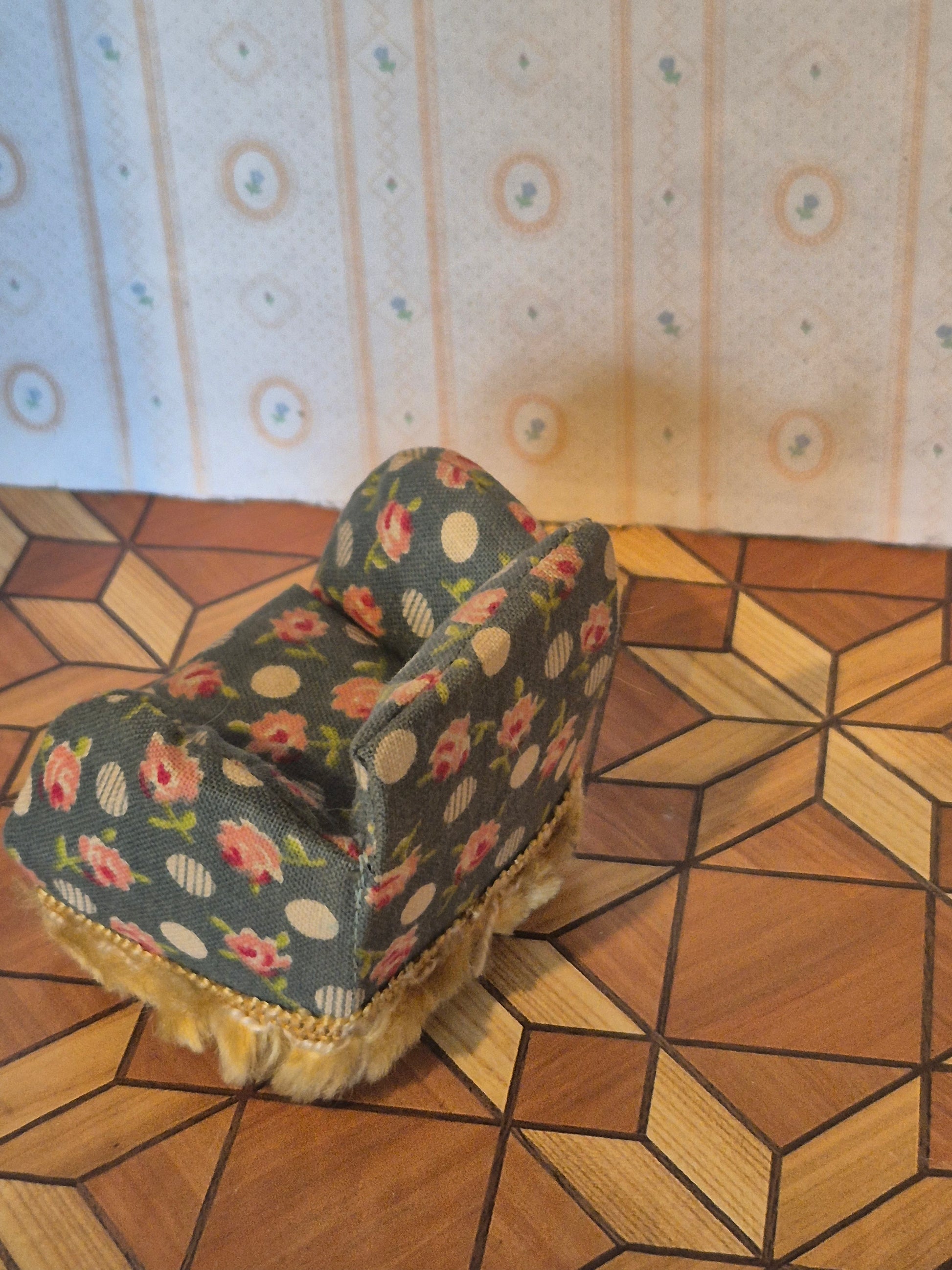 Pæn vintage Lisa lænestol I grå led blomster motiv, ret sjældne.