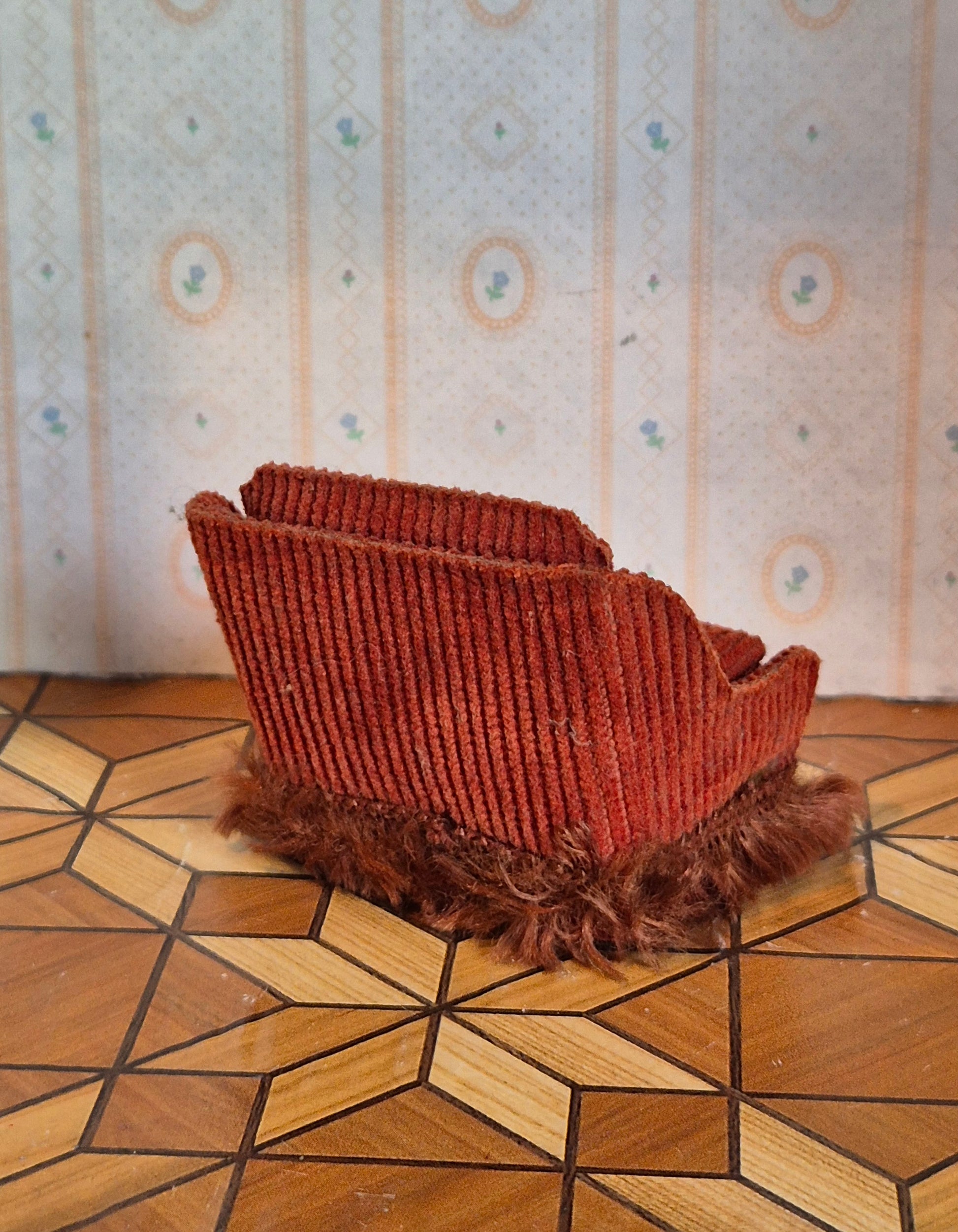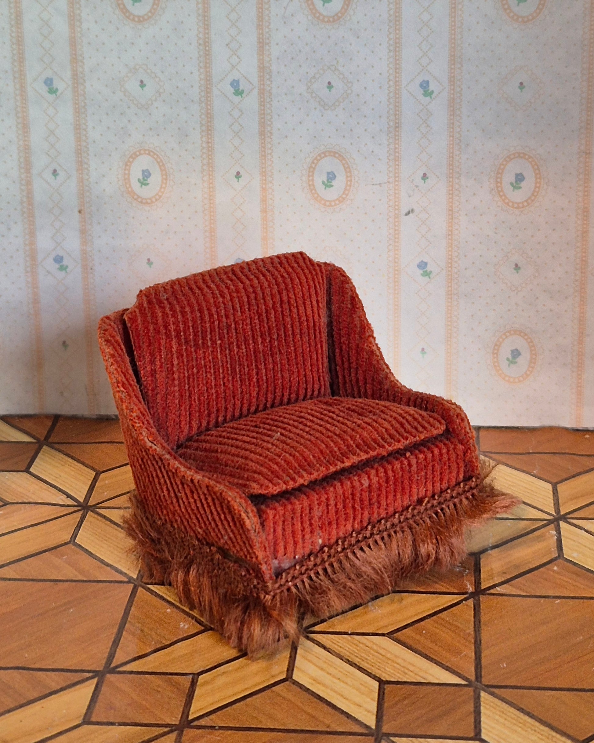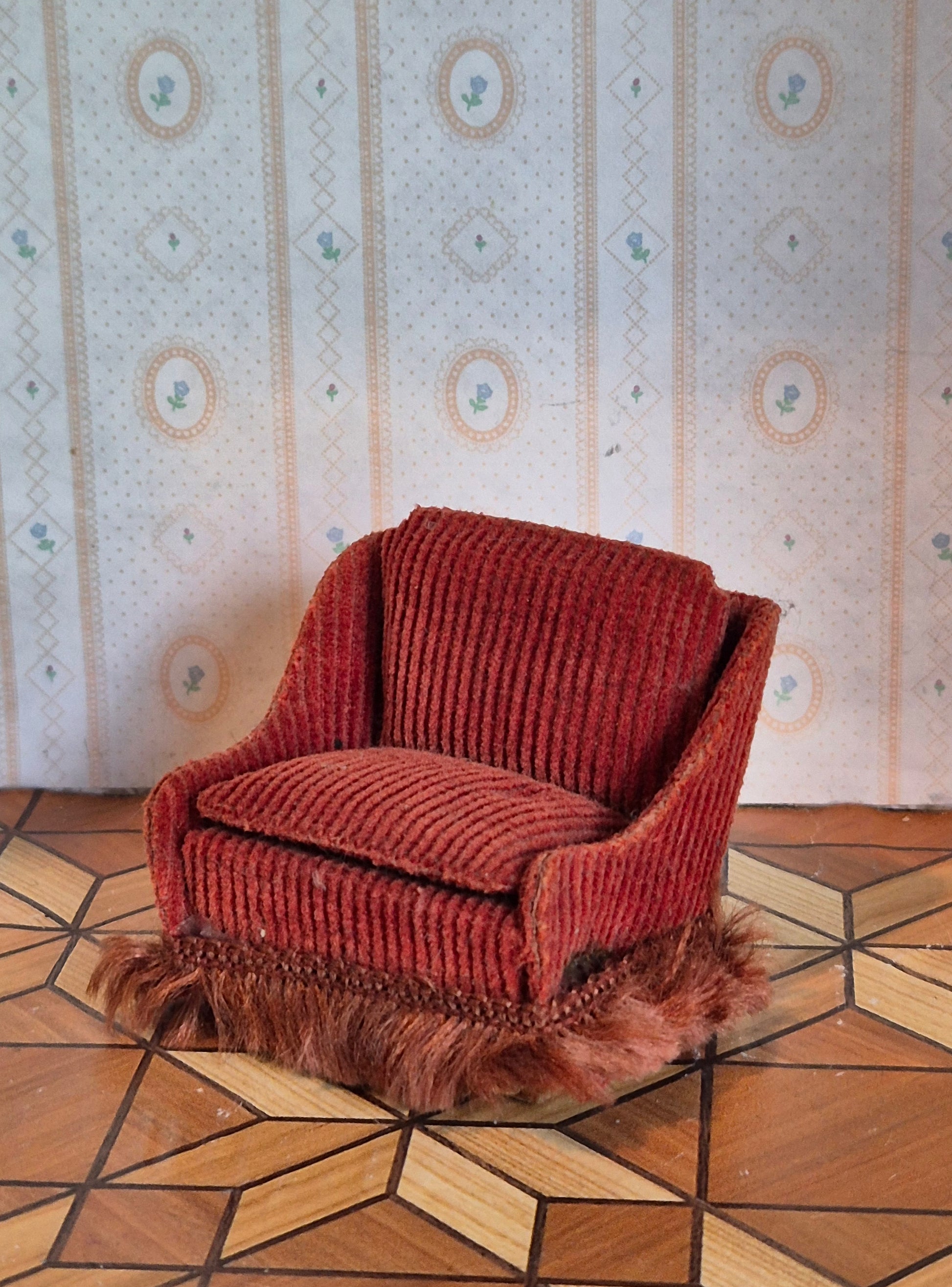 Lisa rødbrun fløjlsstof lænestol, der er vintage og pæn.