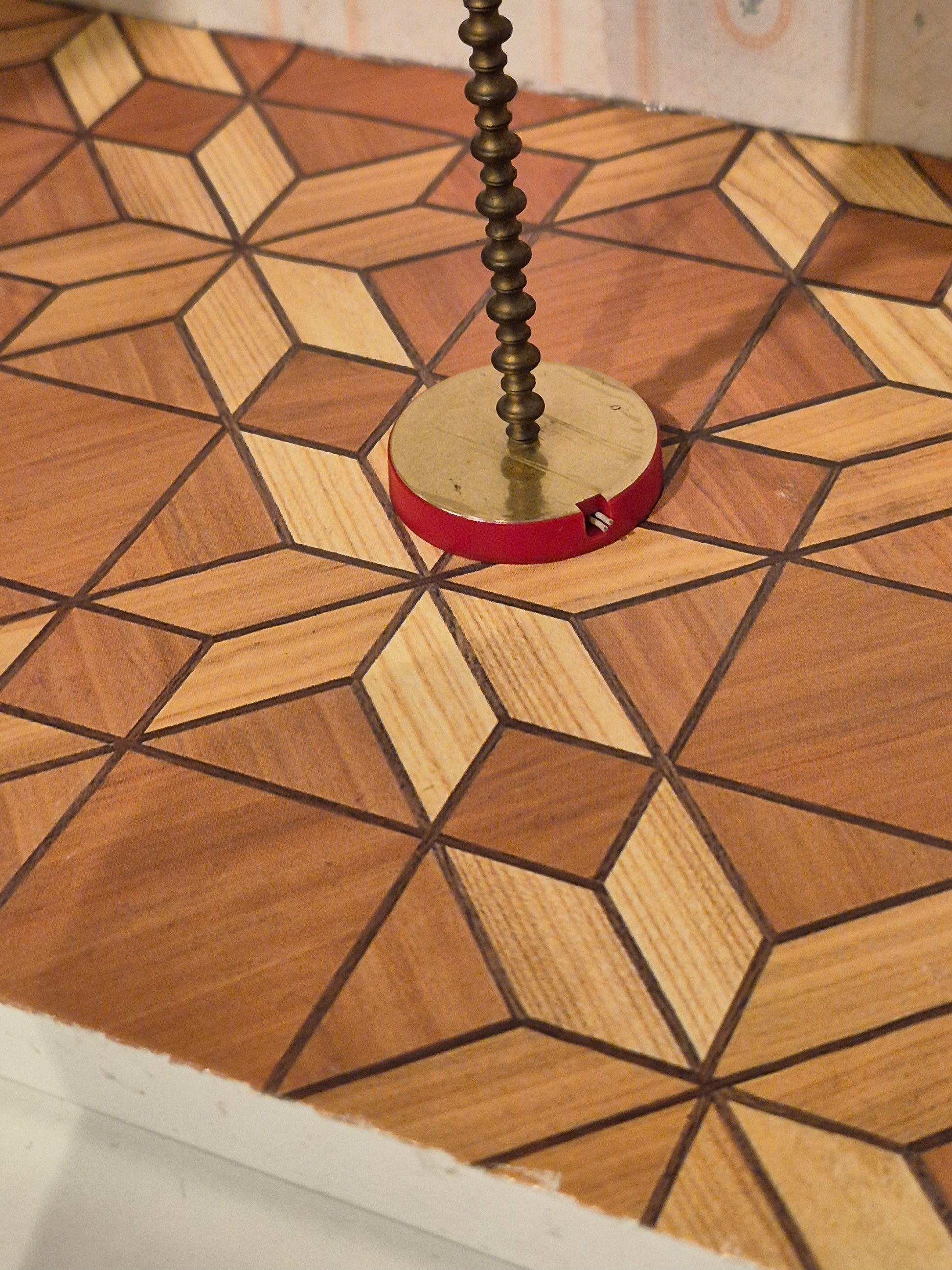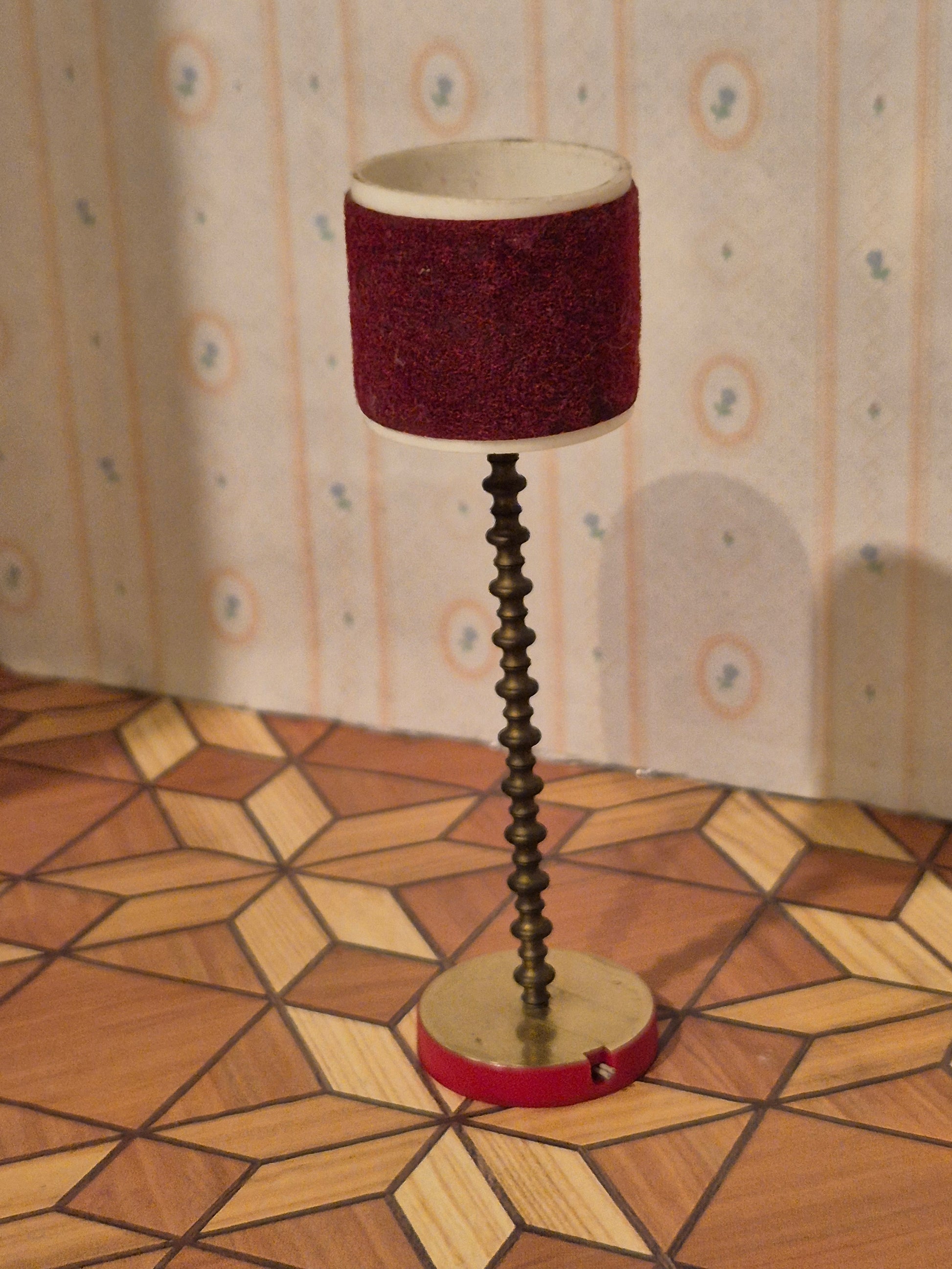 Pæn dukkehus lampe af plast og metal. Særligt kendetegn er standerlampens røde fod med guld. Den er af det danske mærke Lisa af Danmark. Uden ledning, stik og lyspære.