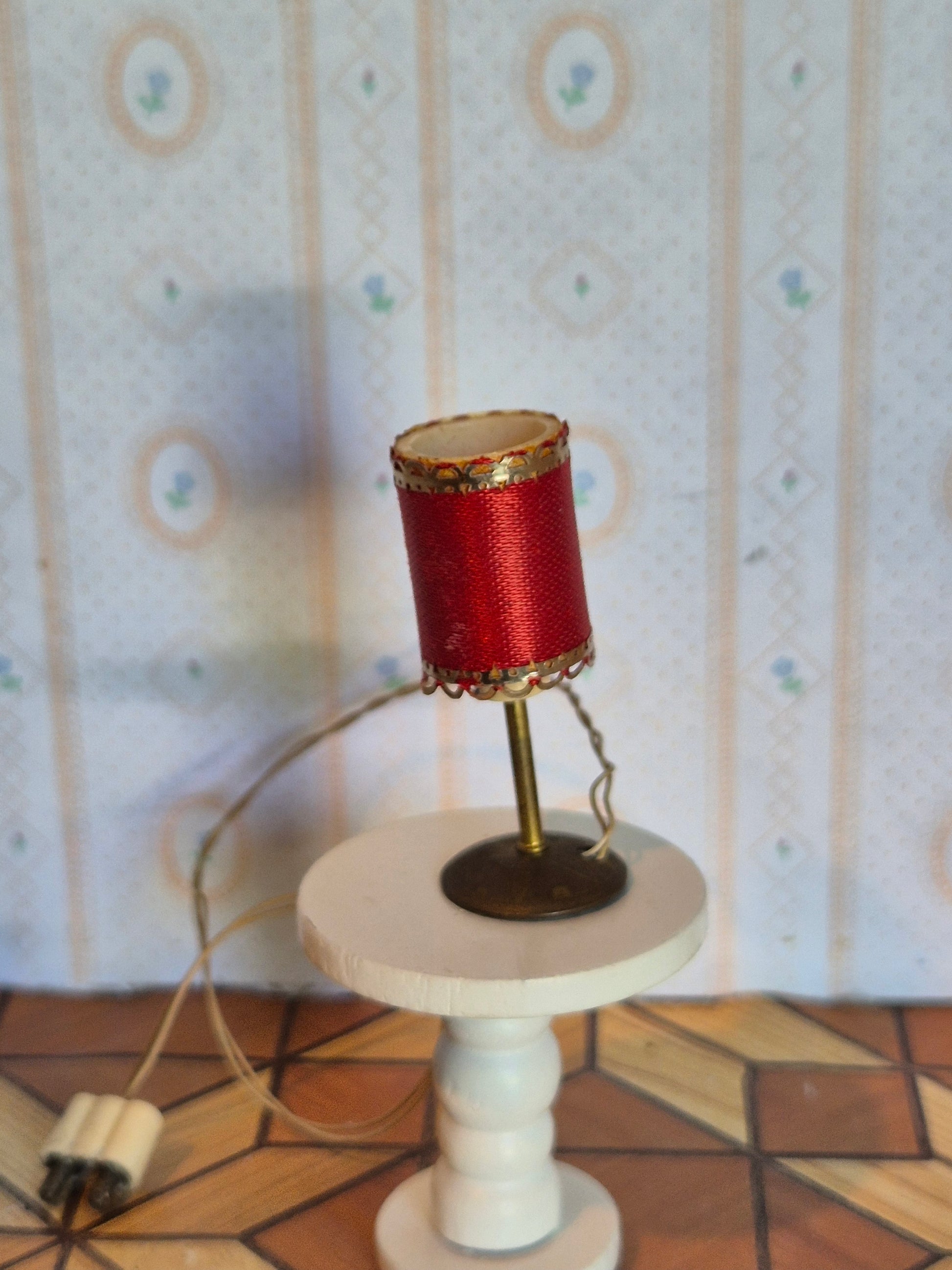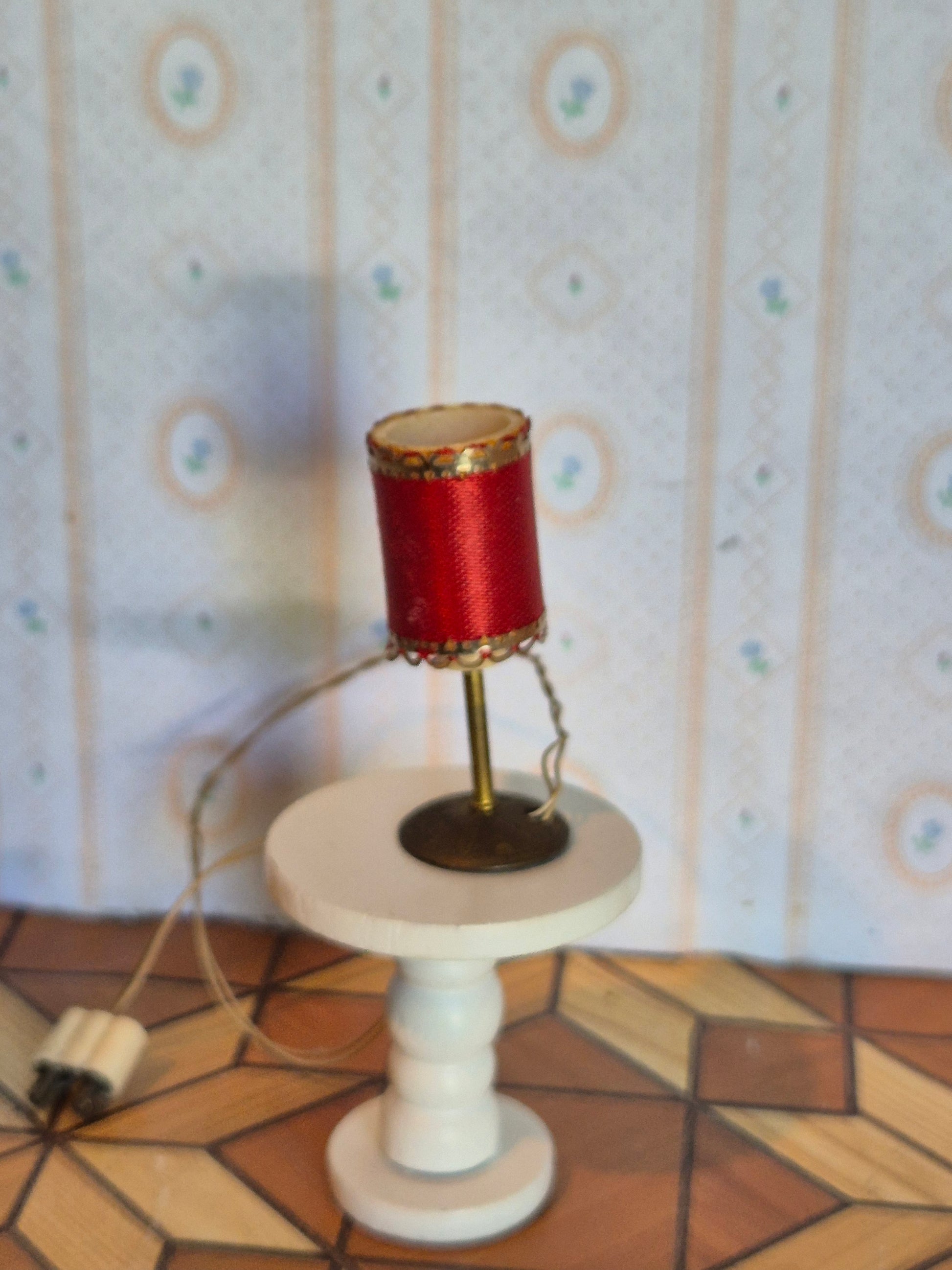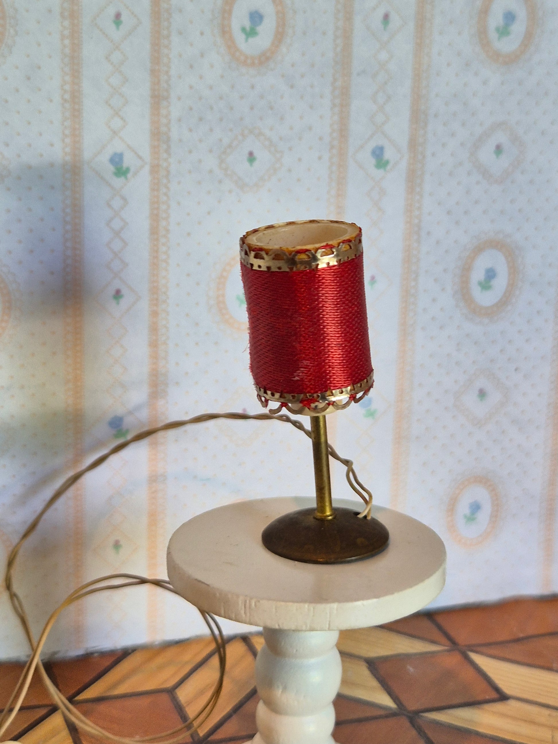 Vintage lampe, speciel bordlampe af Lisa af Danmark. Den er af metal og stof. Ses ikke ofte. Den er skæv, da stangen er blevet klemt.