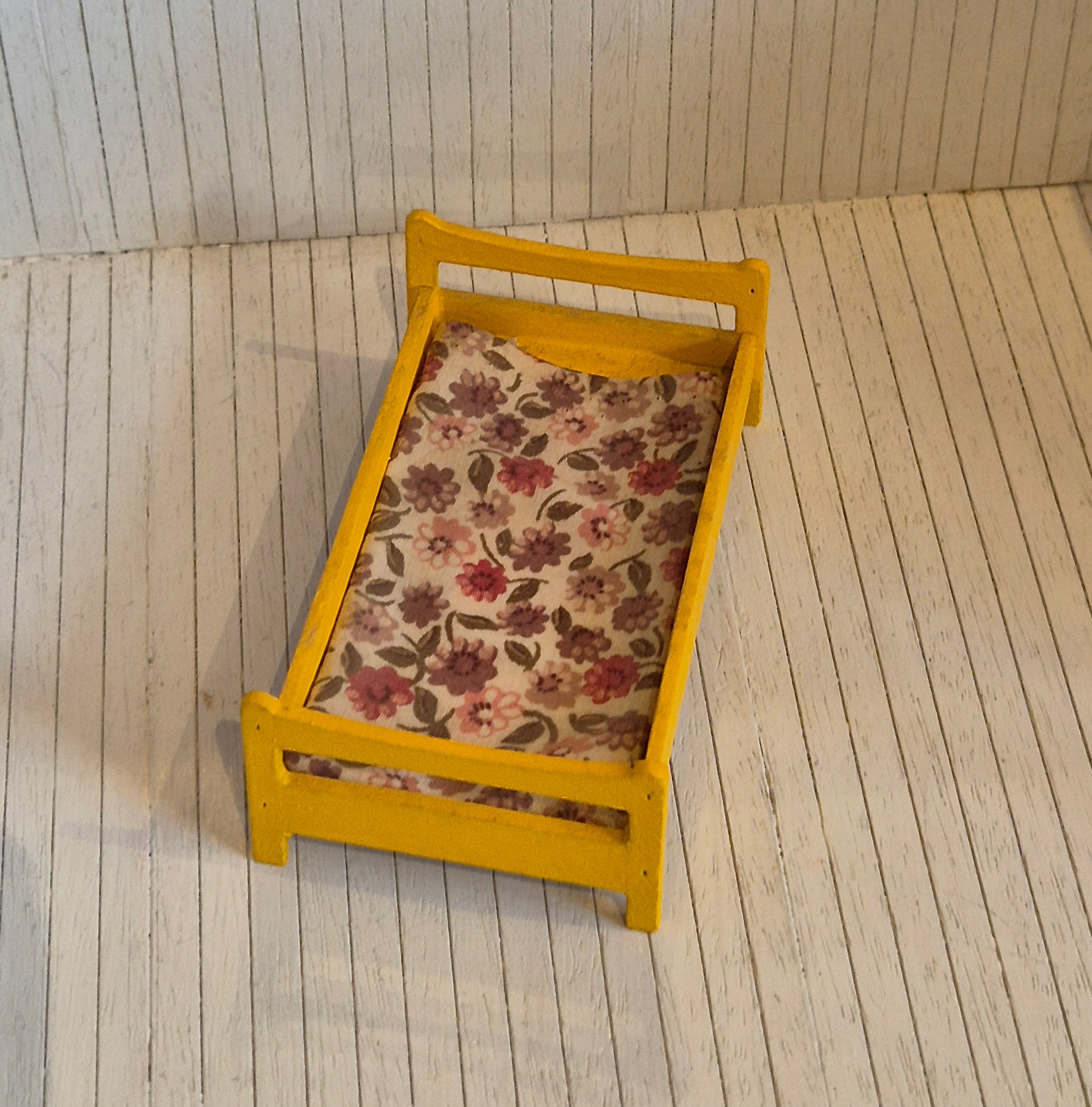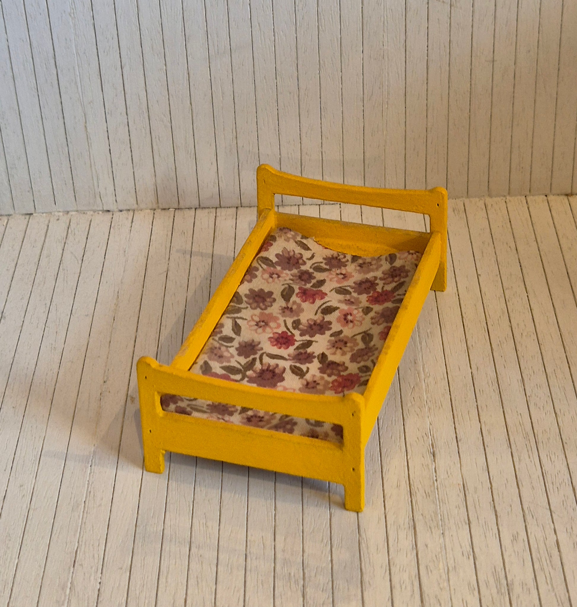 Yellow painted single bed by the brand Lisa af Danmark for the bedroom or children's room in the dollhouse.