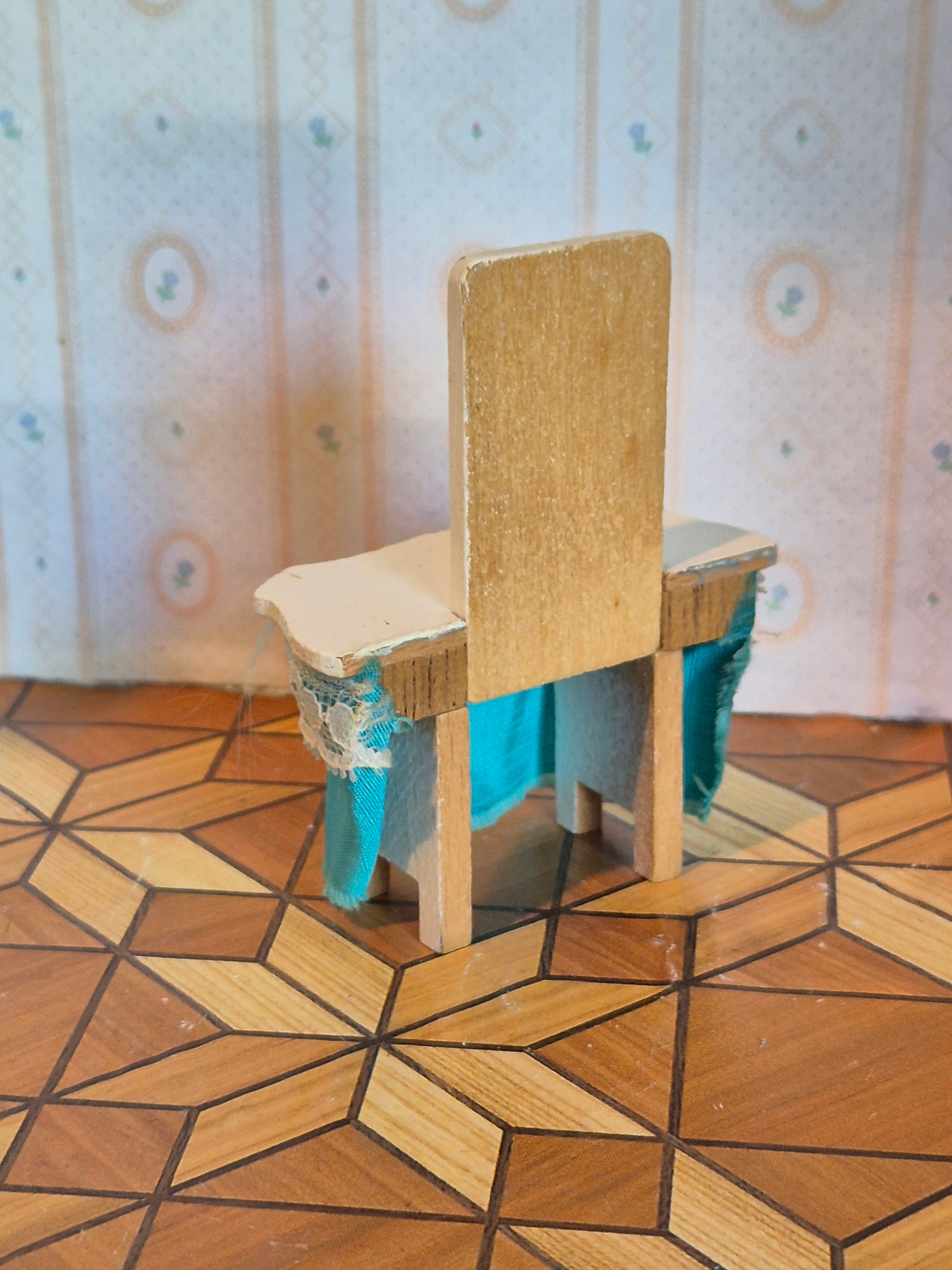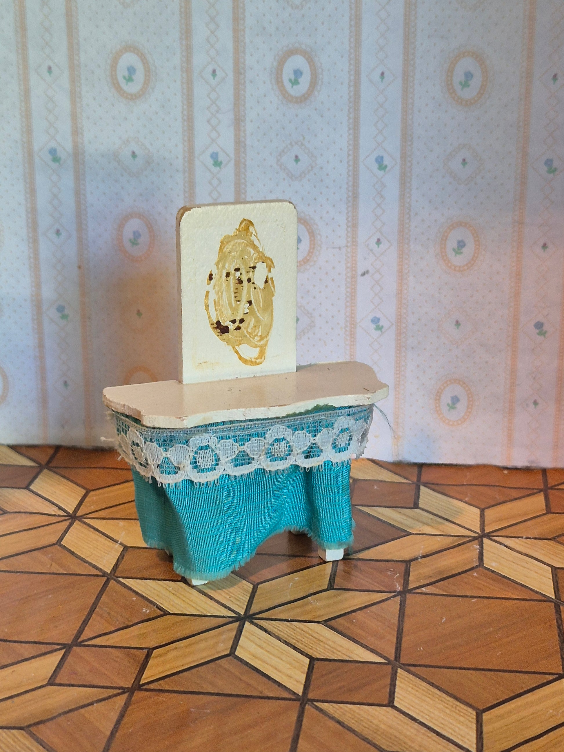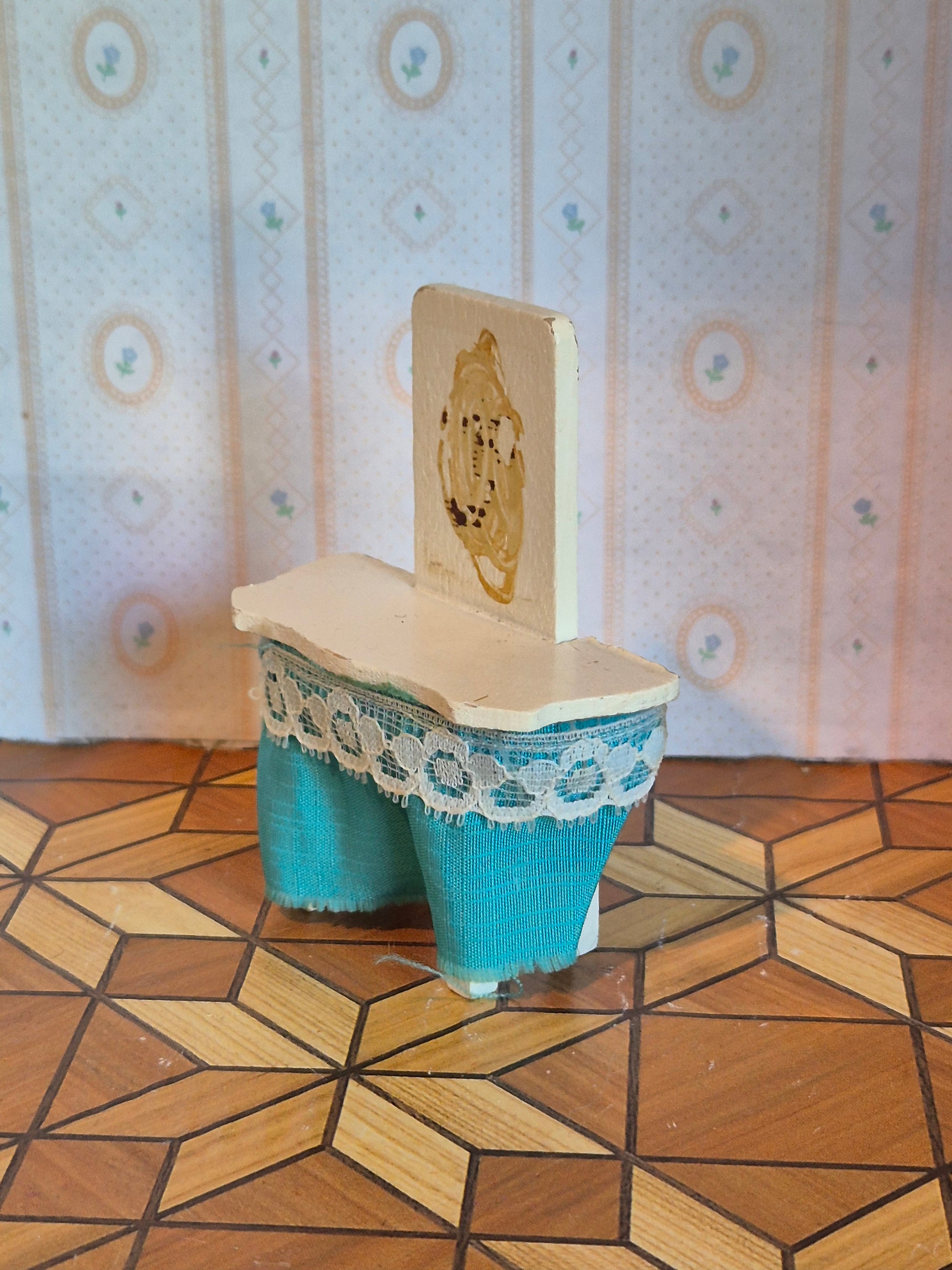 Ældre vintage sminkebord med turkisblåt forhæng med blonder af Lisa af Danmark. Spejlet mangler. Ellers fin stand.