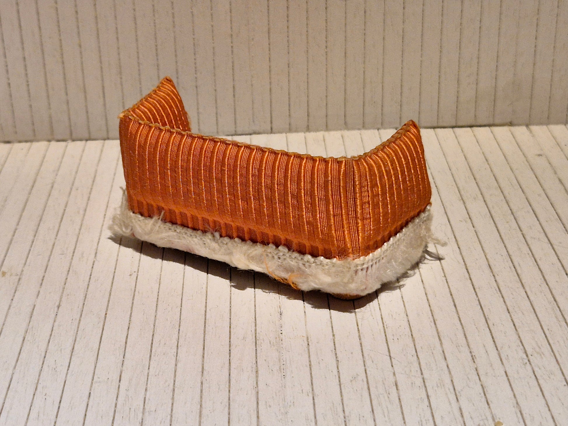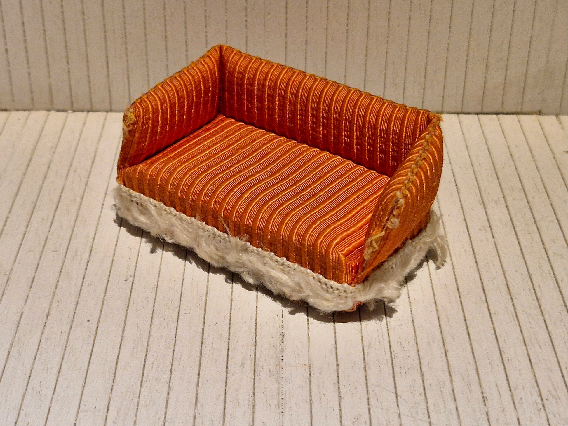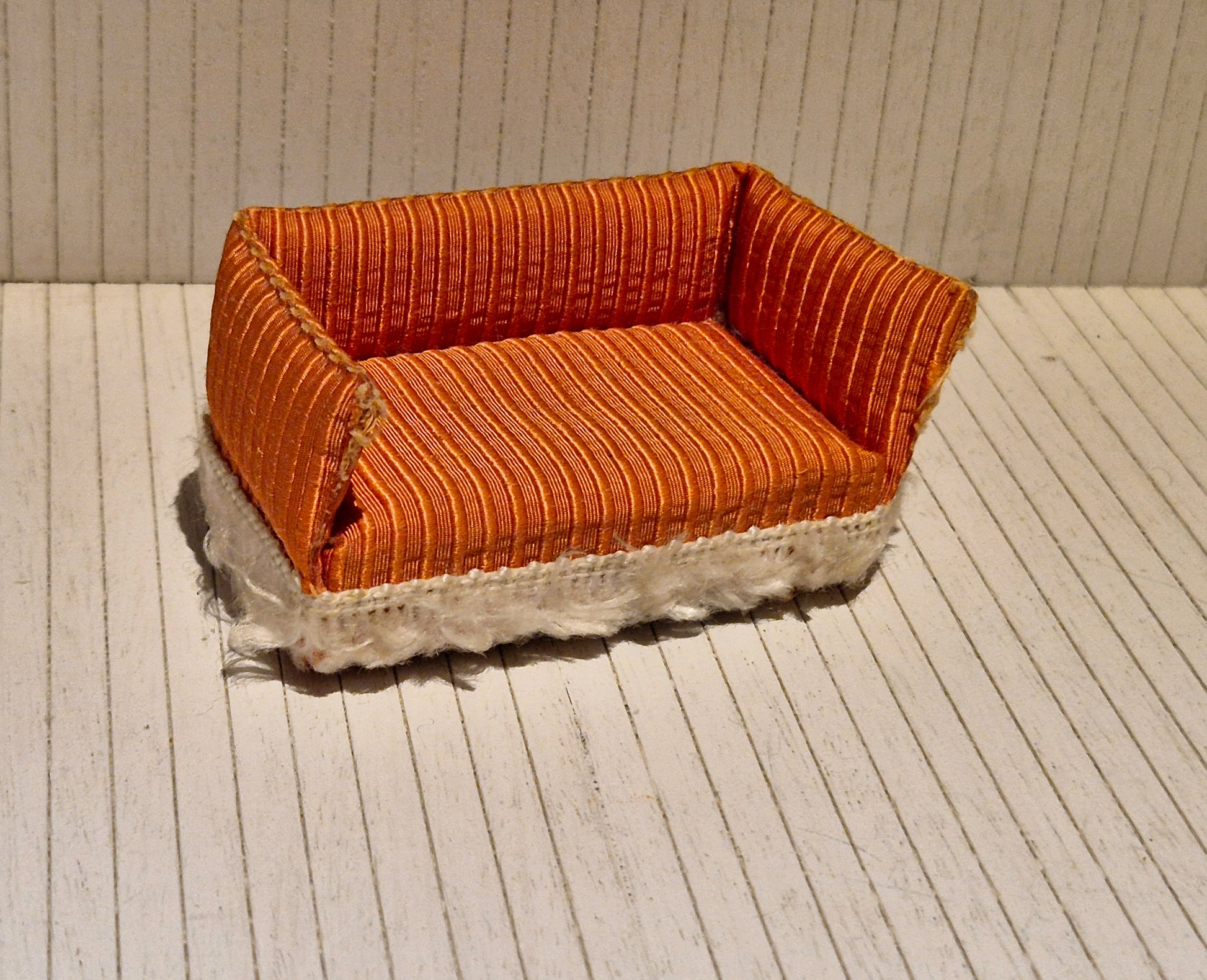 Nice light orange sofa with frosted edge for the dollhouse living room by the brand Lisa of Denmark. It belongs to Lisa's dollhouse furniture series London. It is from before the 1980s.