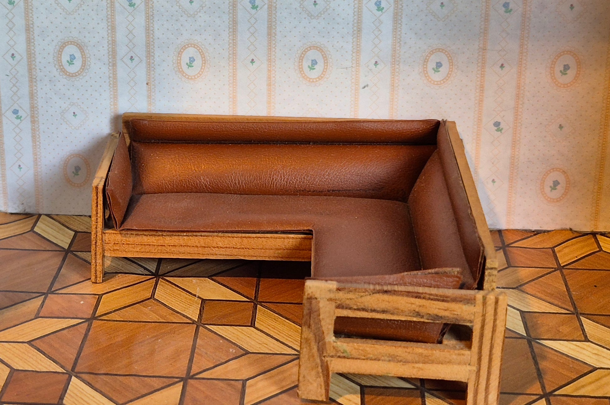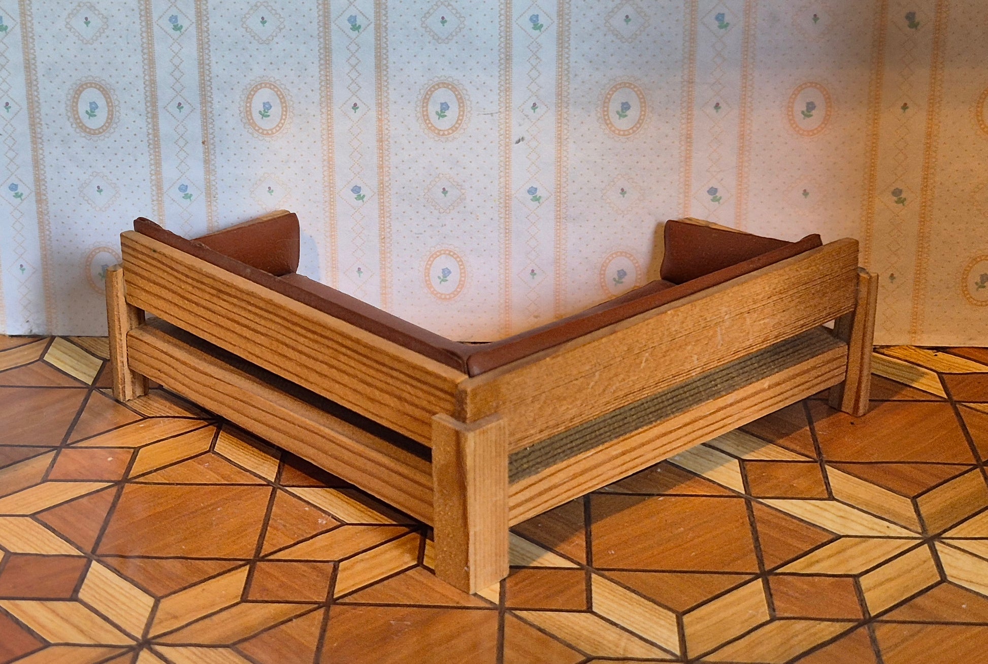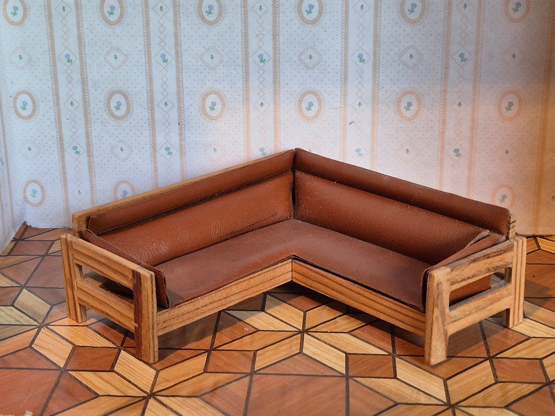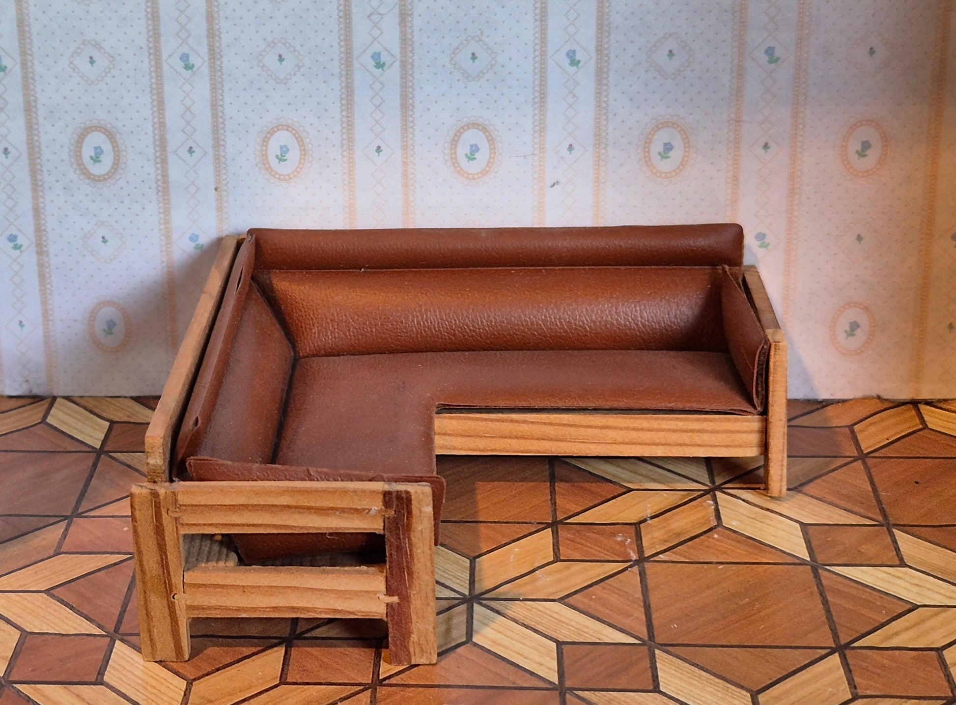 Vintage træ hjørnesofa med lysebrune lædersæder af Lisa af Danmark. Det er lidt skævt i den ene side.