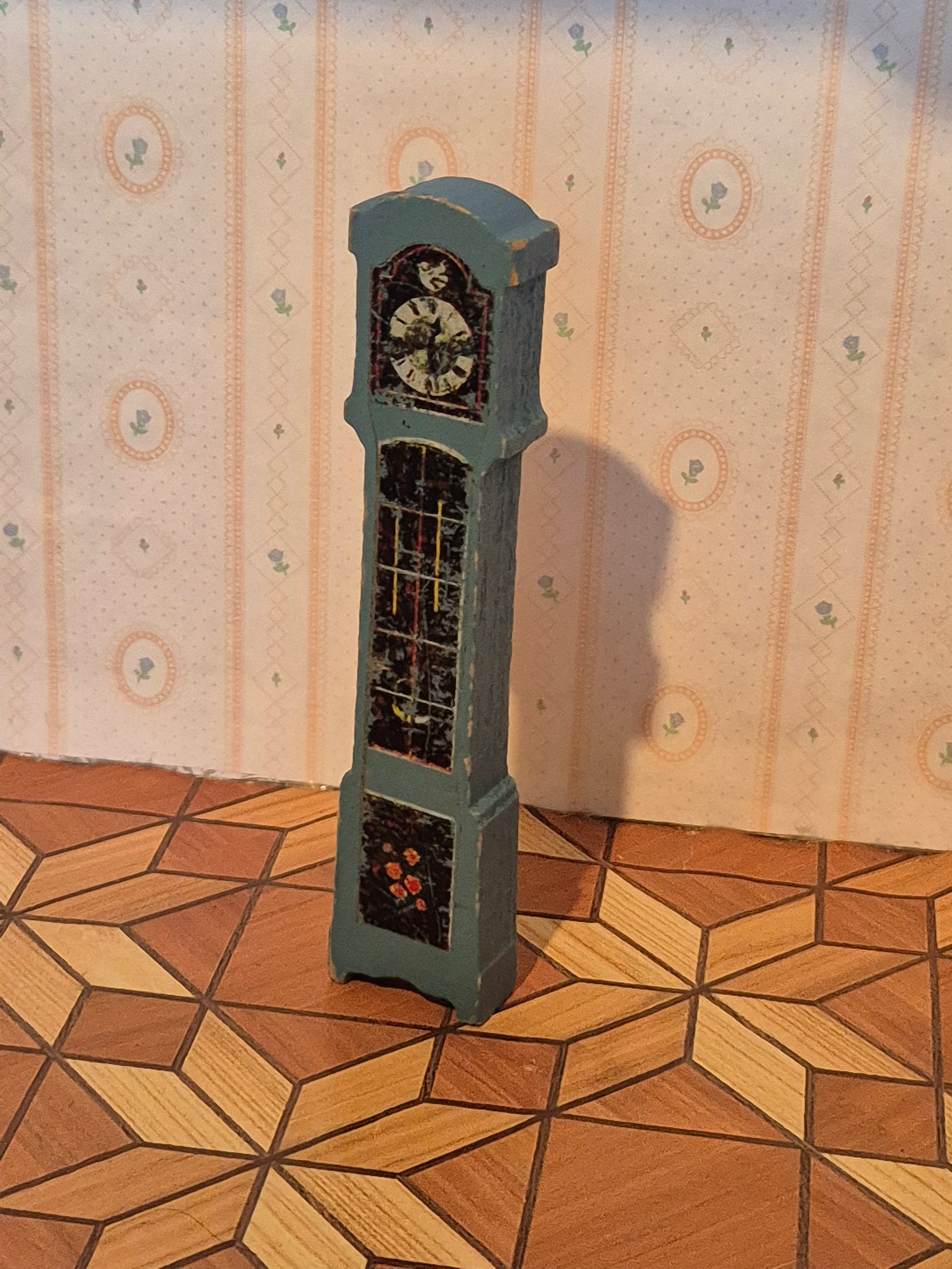 Lisa standerur, bedstefar klokke i lyseblå træ med patina og brugsspor, slid.