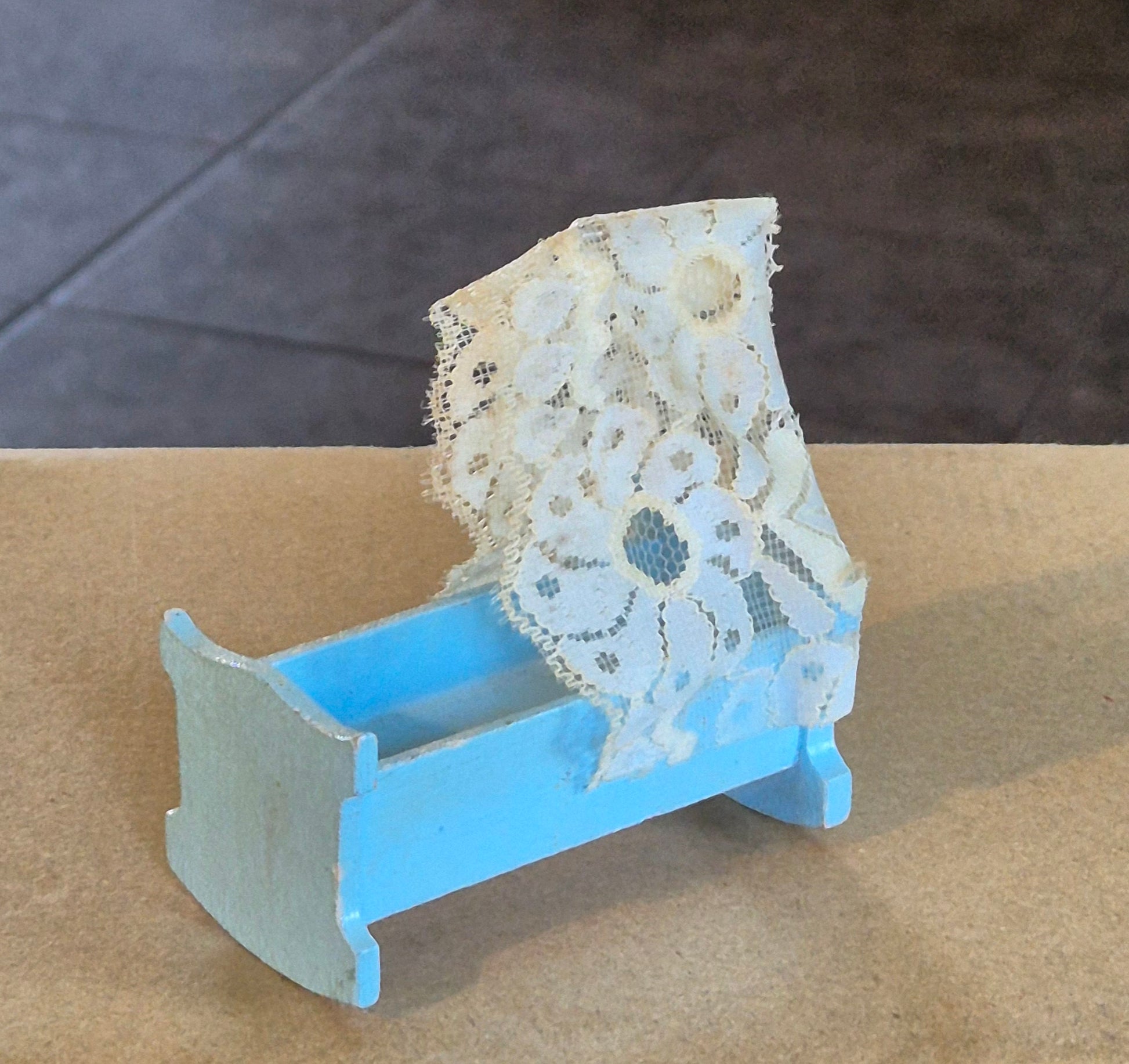 Light blue cradle with lace canopy by Lisa of Denmark.