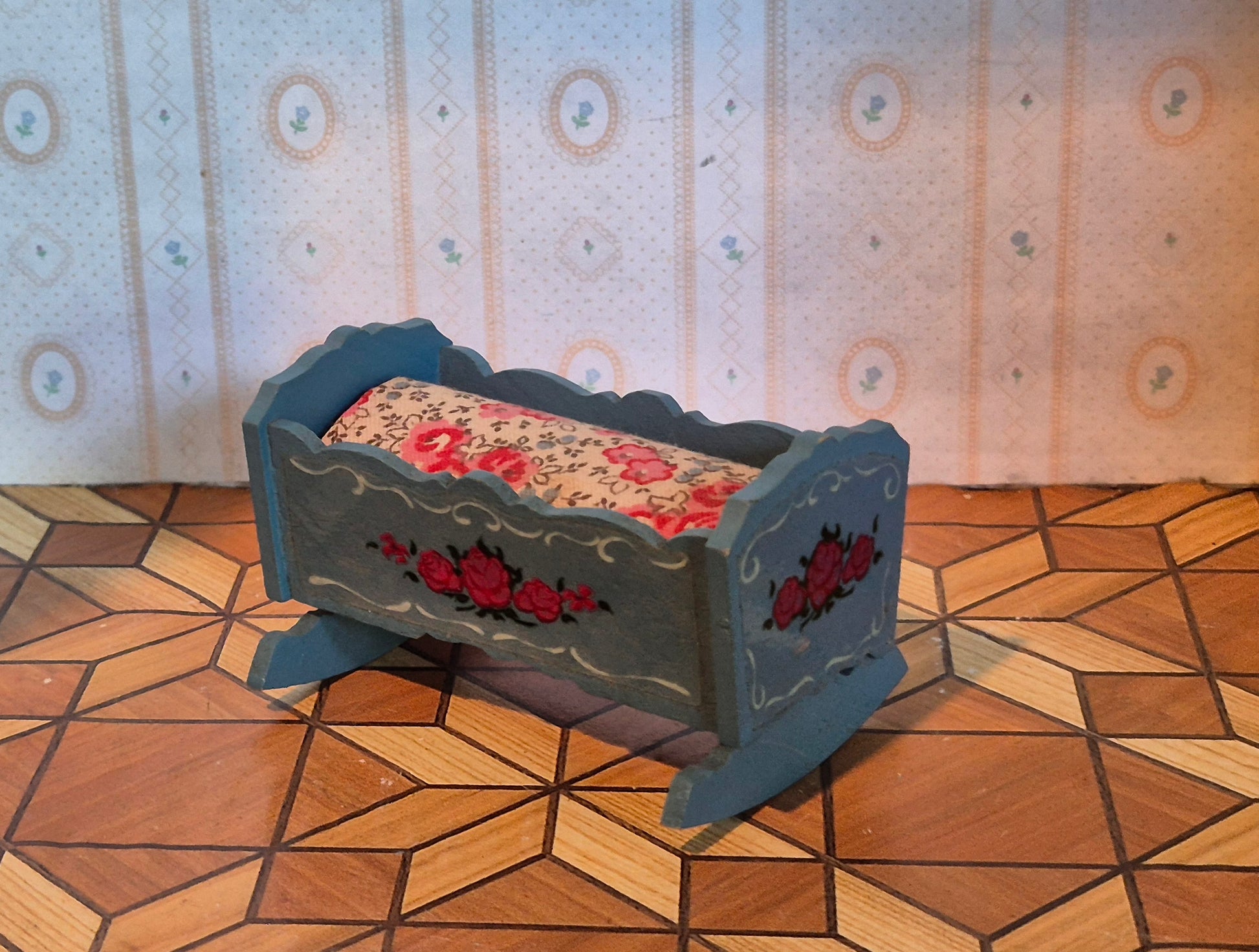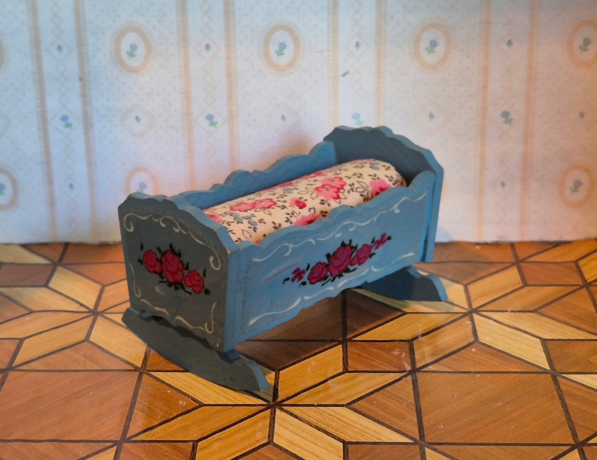 Pæn og fin original Lisa vintage vugge i lyseblå almue stil med blomstermotiv og madras. Rigtig god stand.
