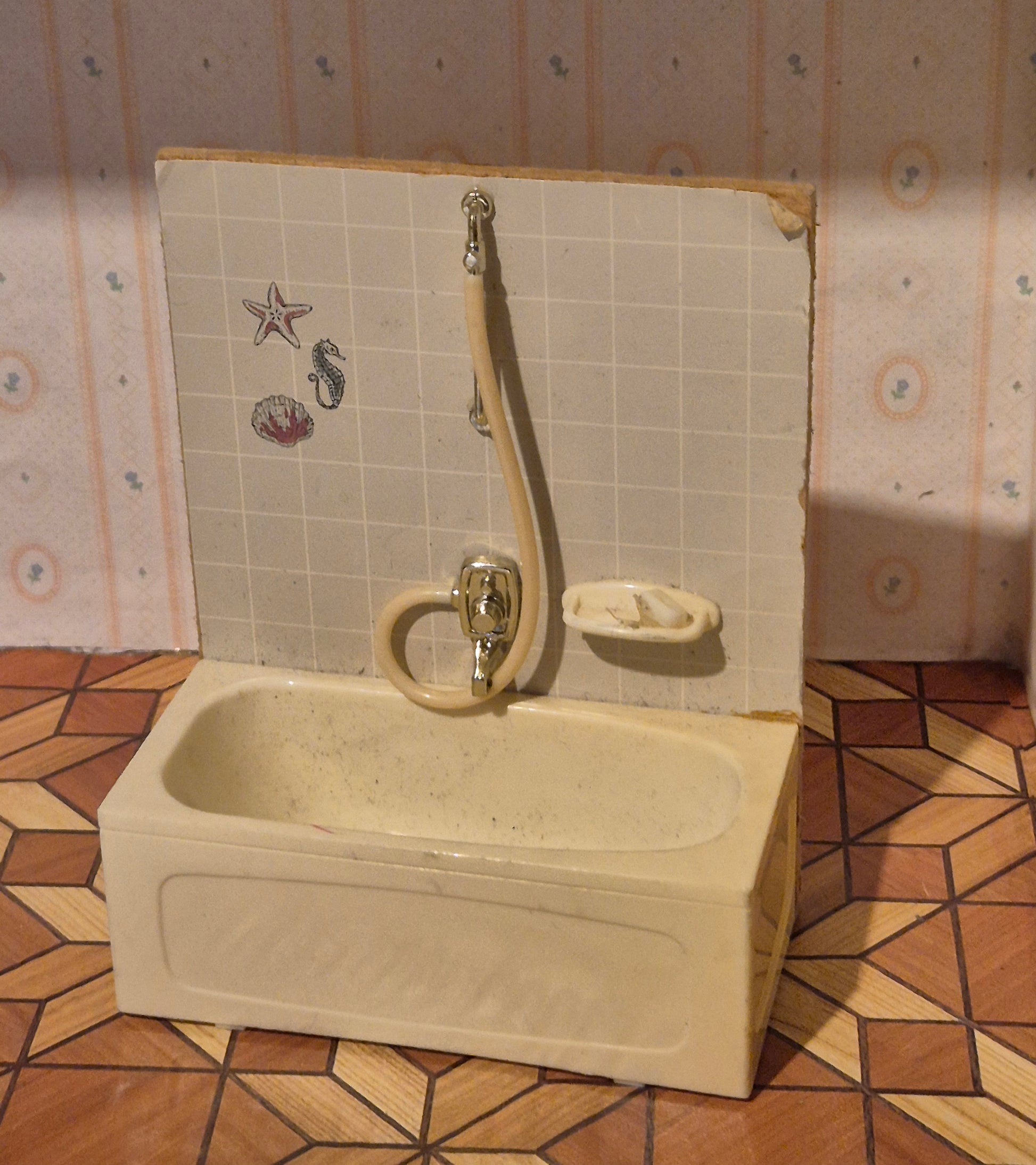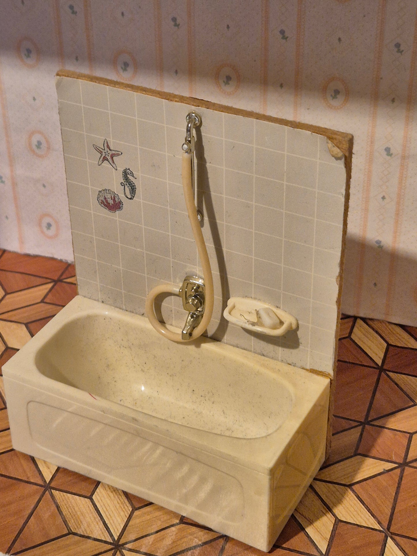 Lundby badekar i ocean tema. Brugt med brugsspor med patina. Der er mangler. Solafbleget