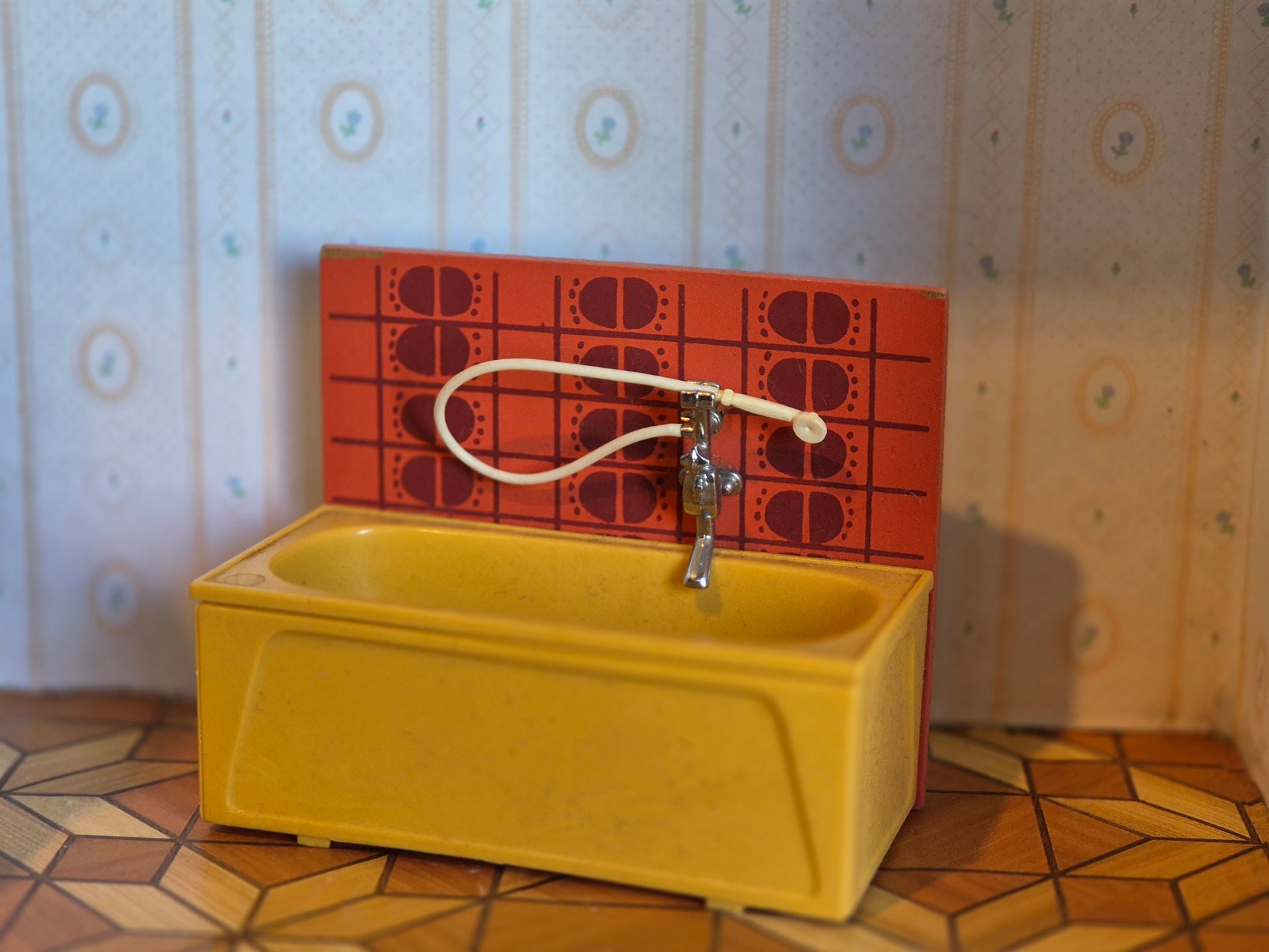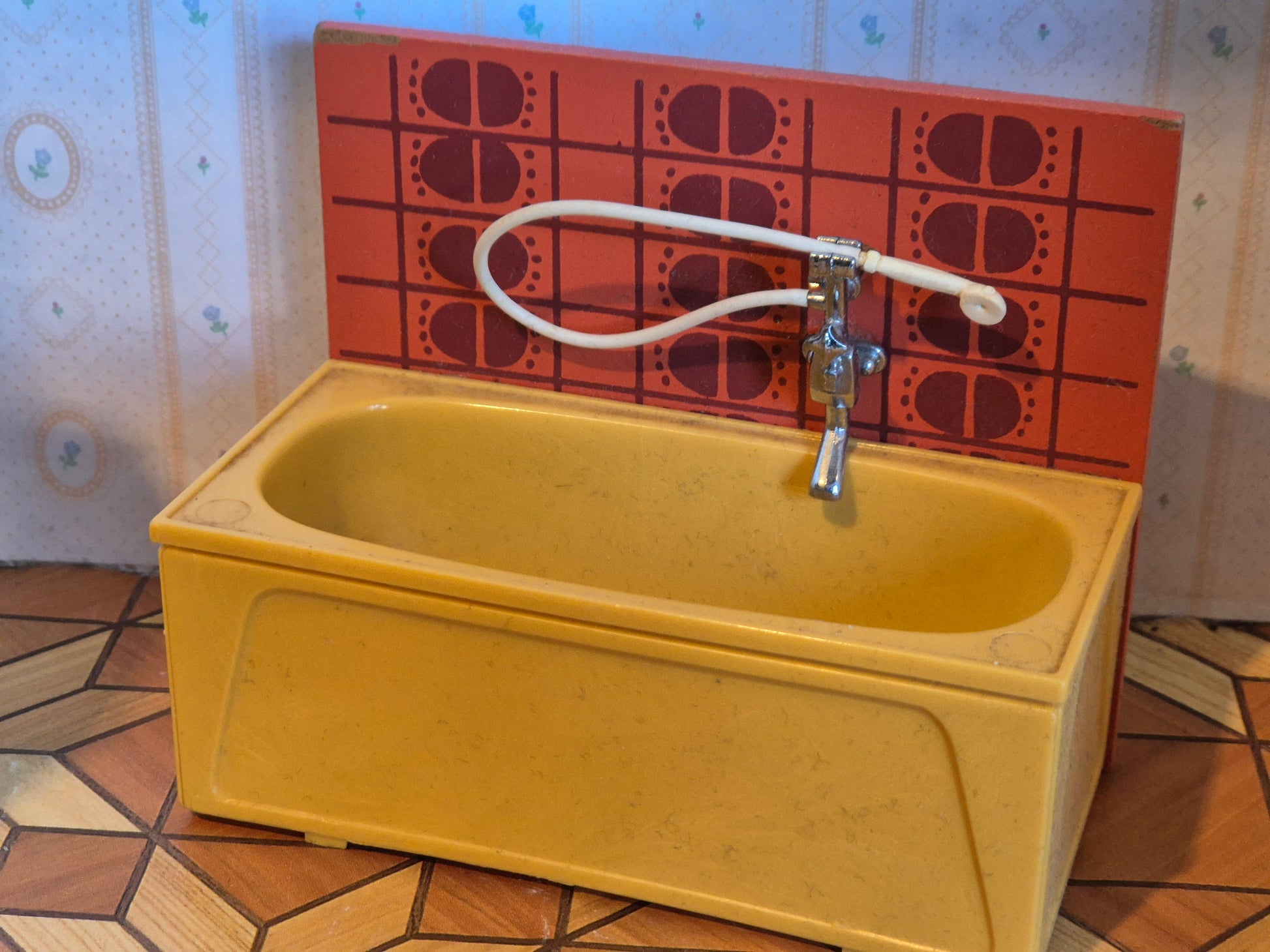 Lundby intakt badekar i gul og orange. Pænt badekar