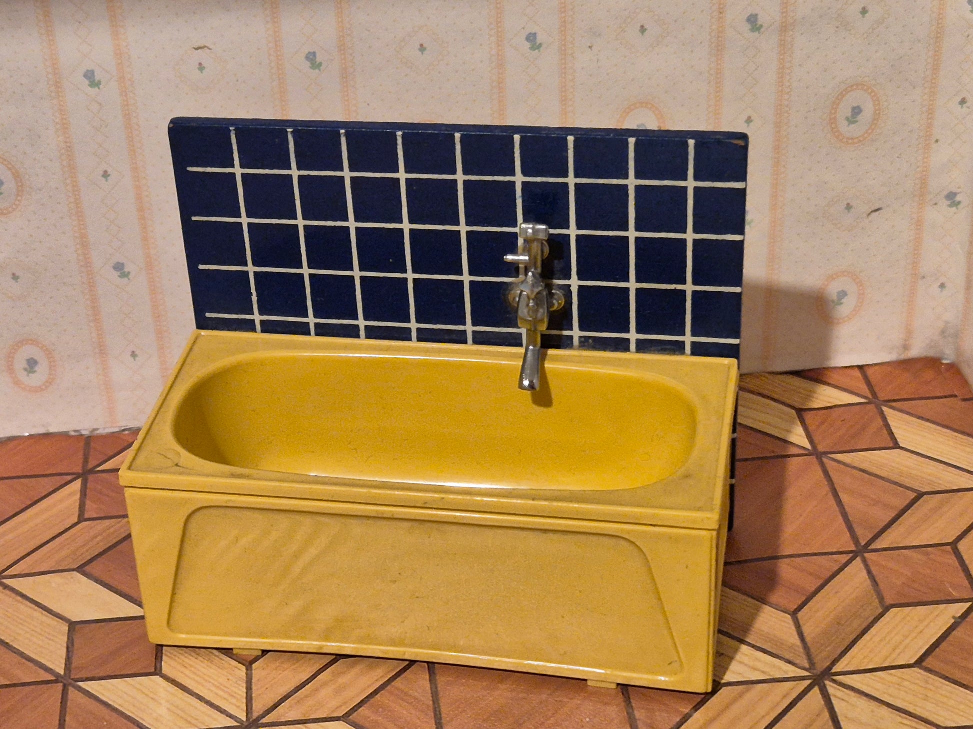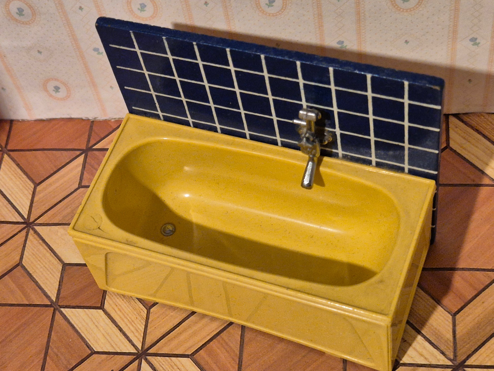 Lundby badekar I blå og gul farve. Det er ældre og mangler nogle dele. Kan bruges som reservedel.