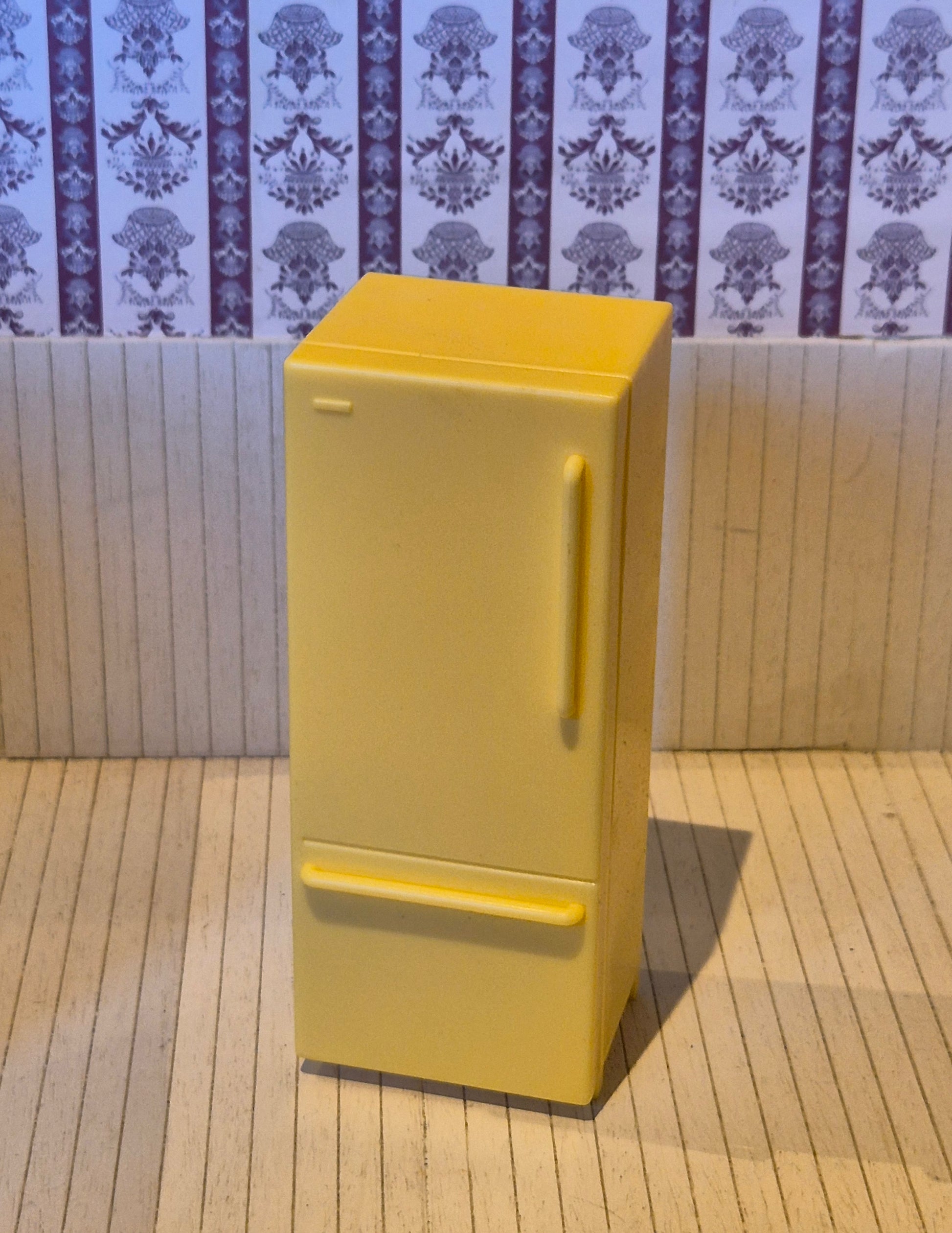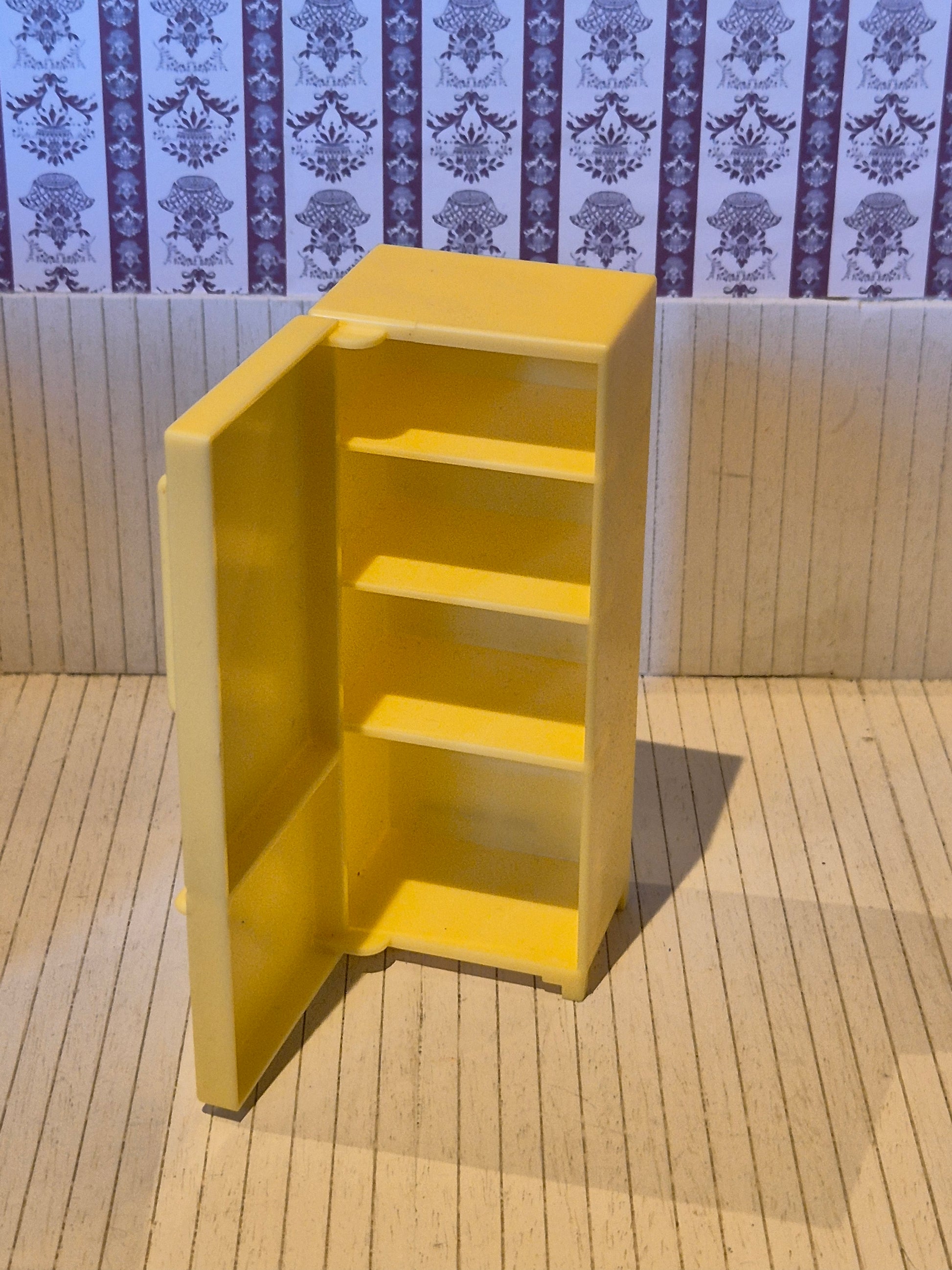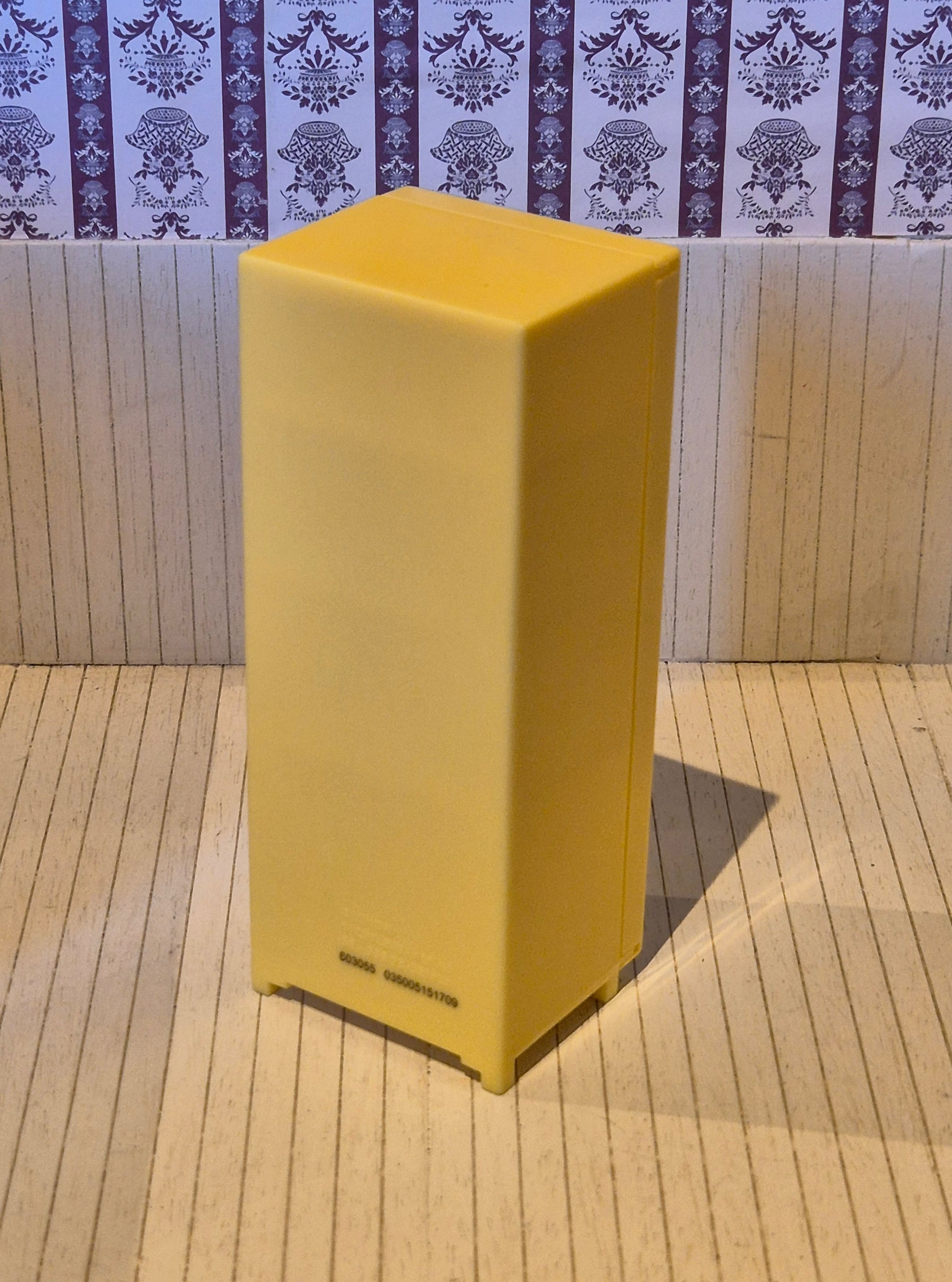 Yellow refrigerator for the Lundby dollhouse kitchen.