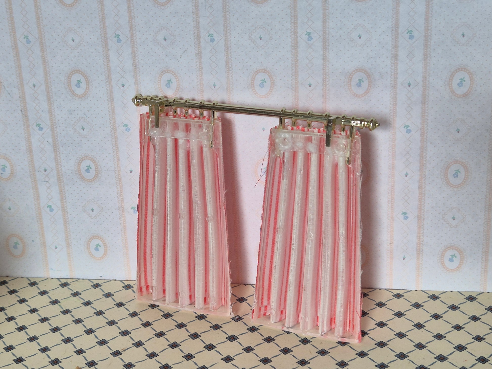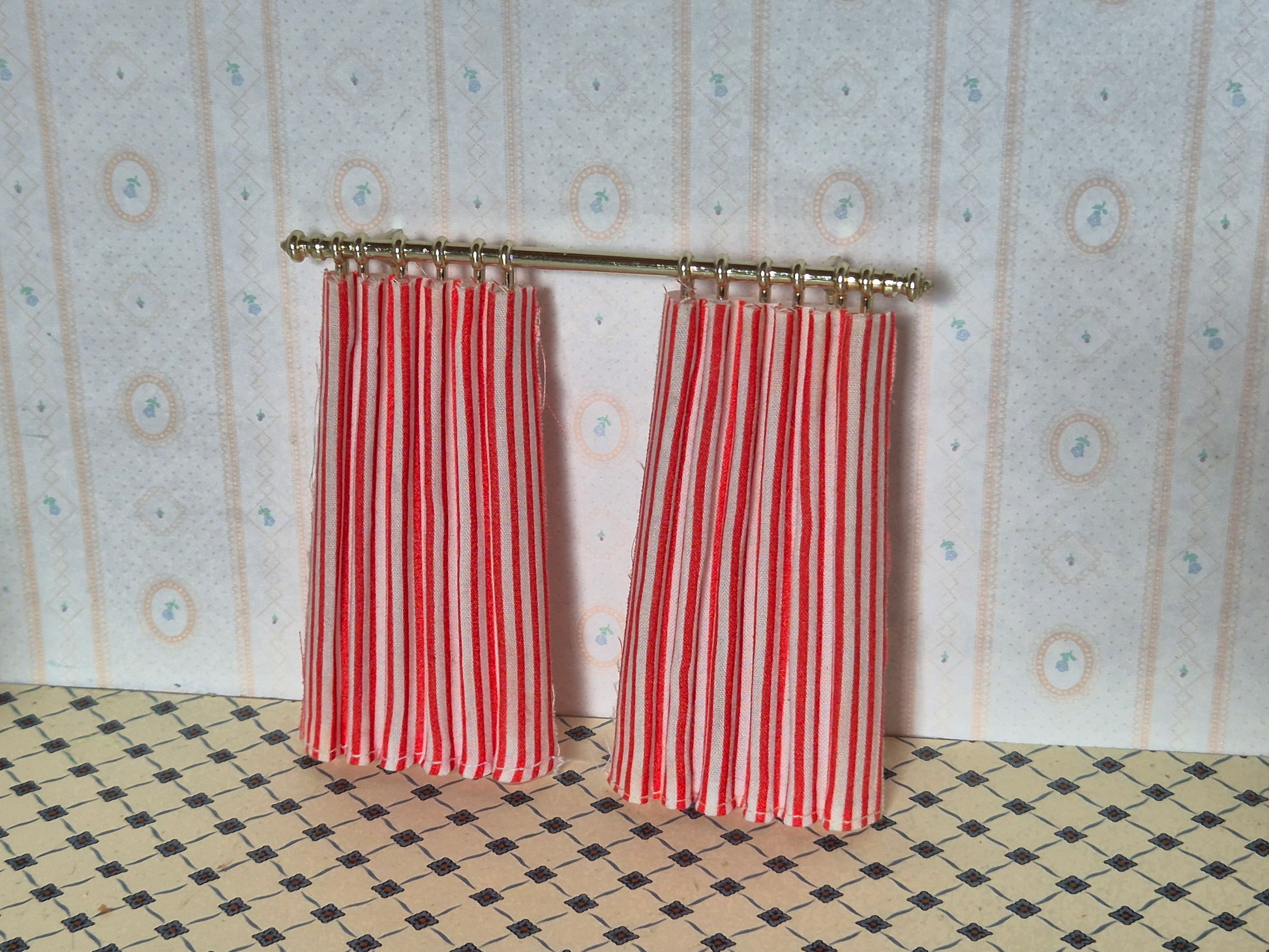 Pænt og fint Lundby gardin i udmærket stand. Det er rødt og hvidt stribet af plast med stof.