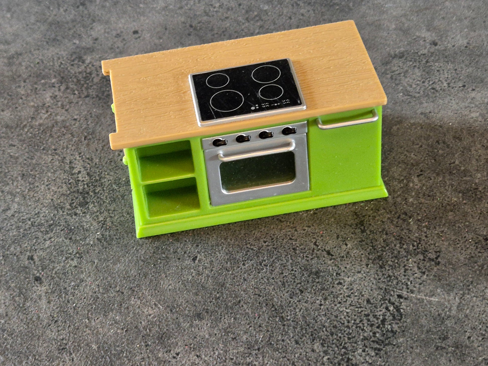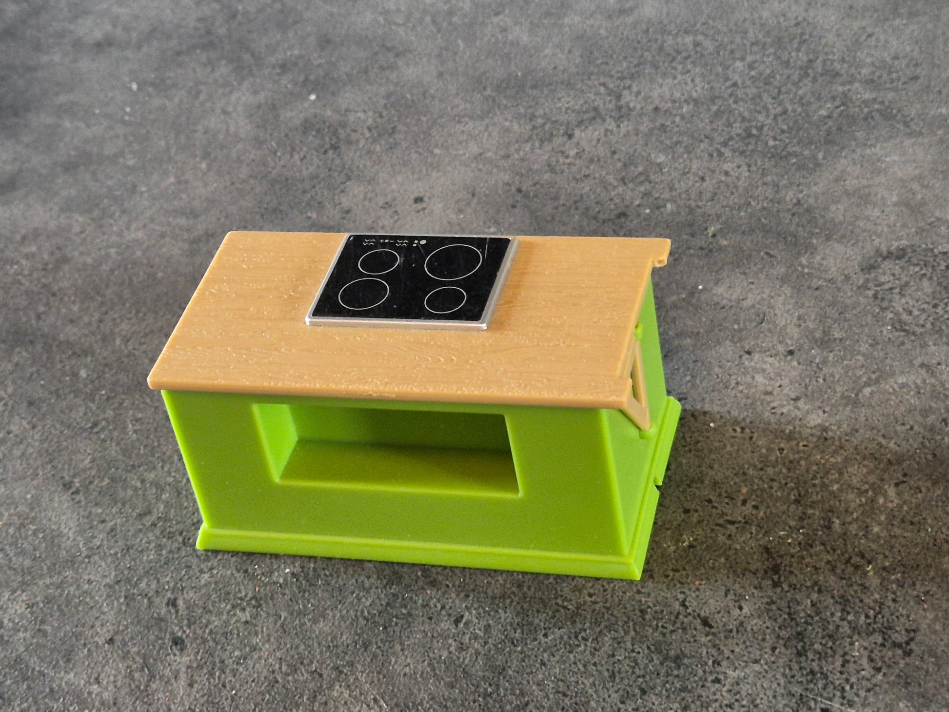 Lundby stove In green plastic. Nice and used. One flap is missing on the side. Otherwise in good condition.