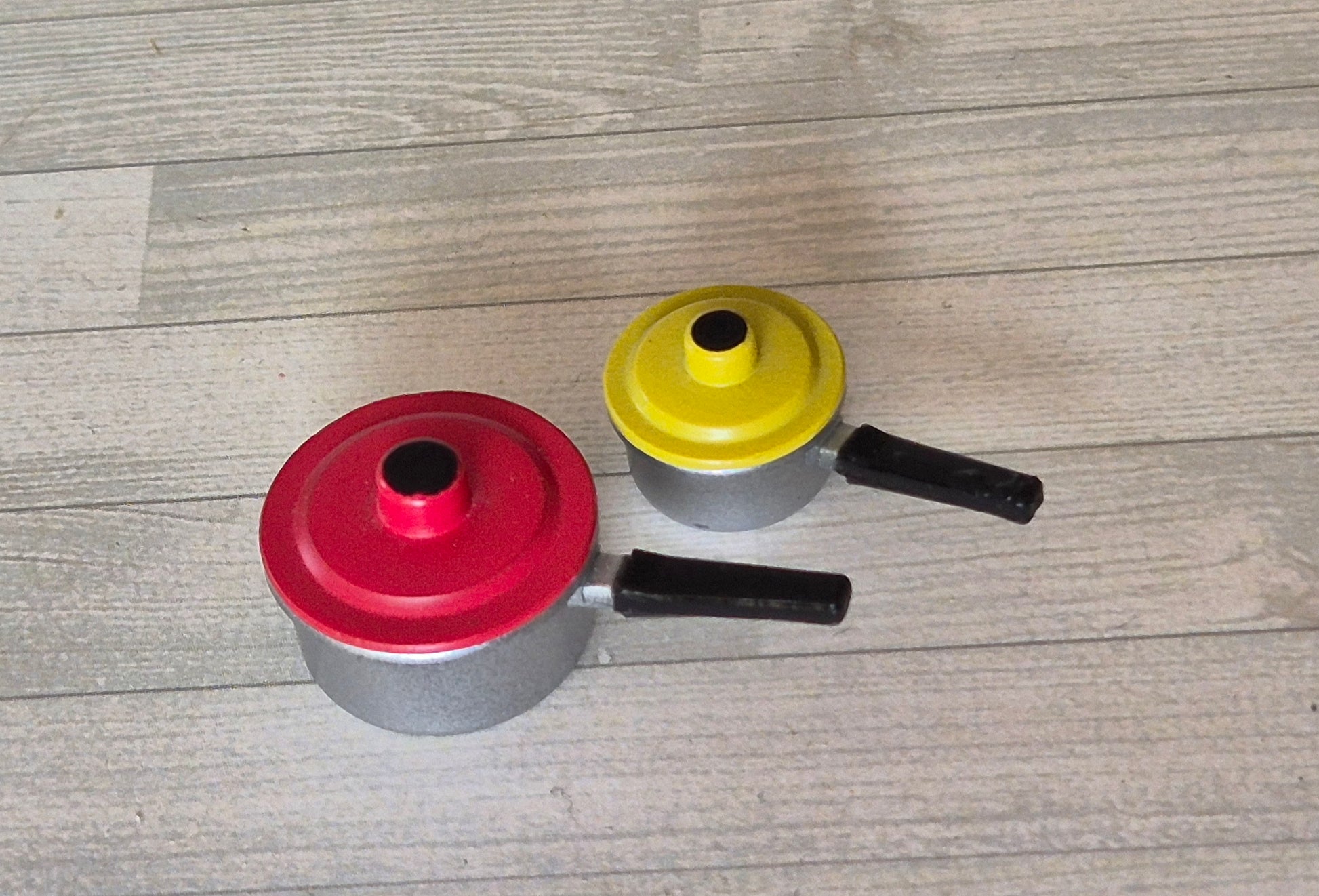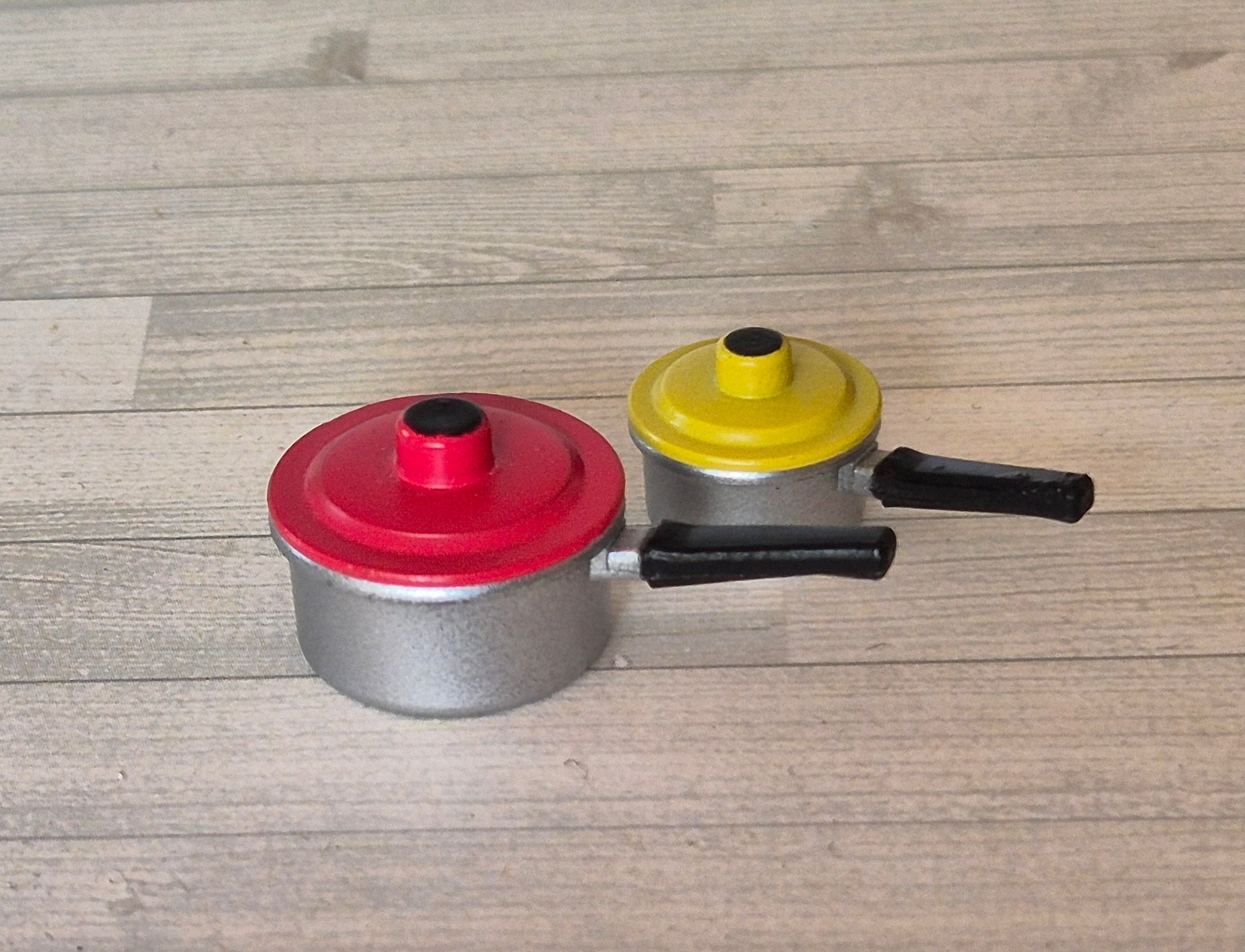 2 Lundby gryder med gult og rødt låg, der er limet fast.