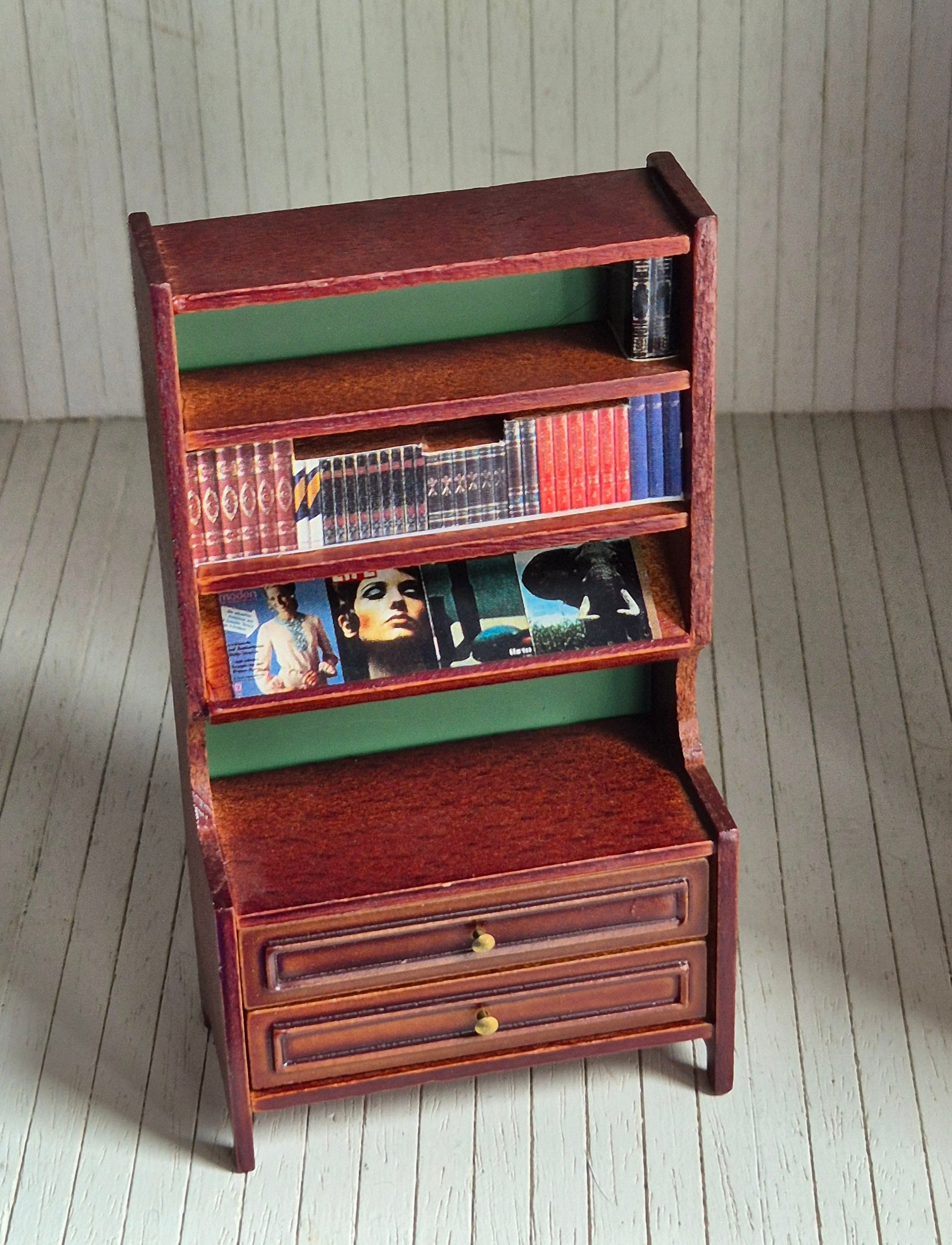Nice classic dark brown bookcase with green back wall. It has nice shelves and good drawers for Lundby dollhouse. Nice piece of furniture in good condition.