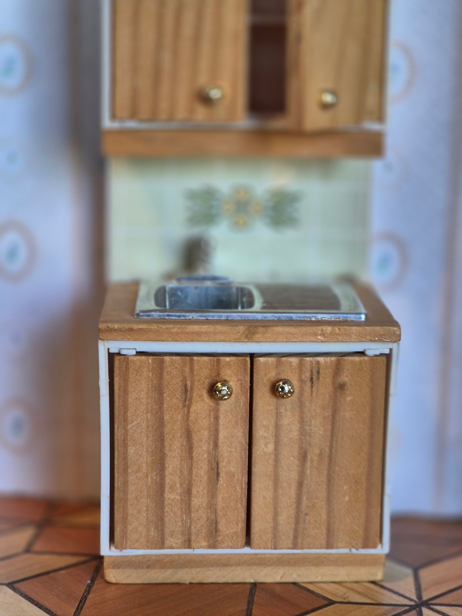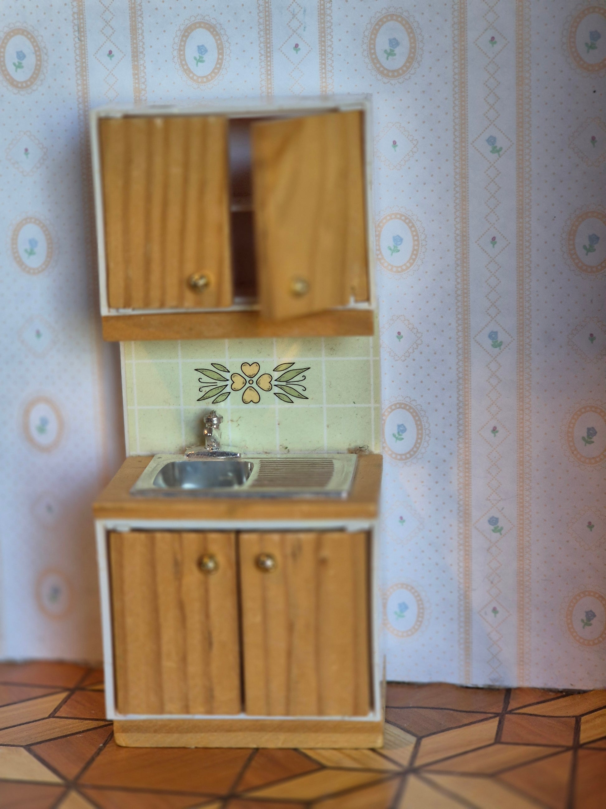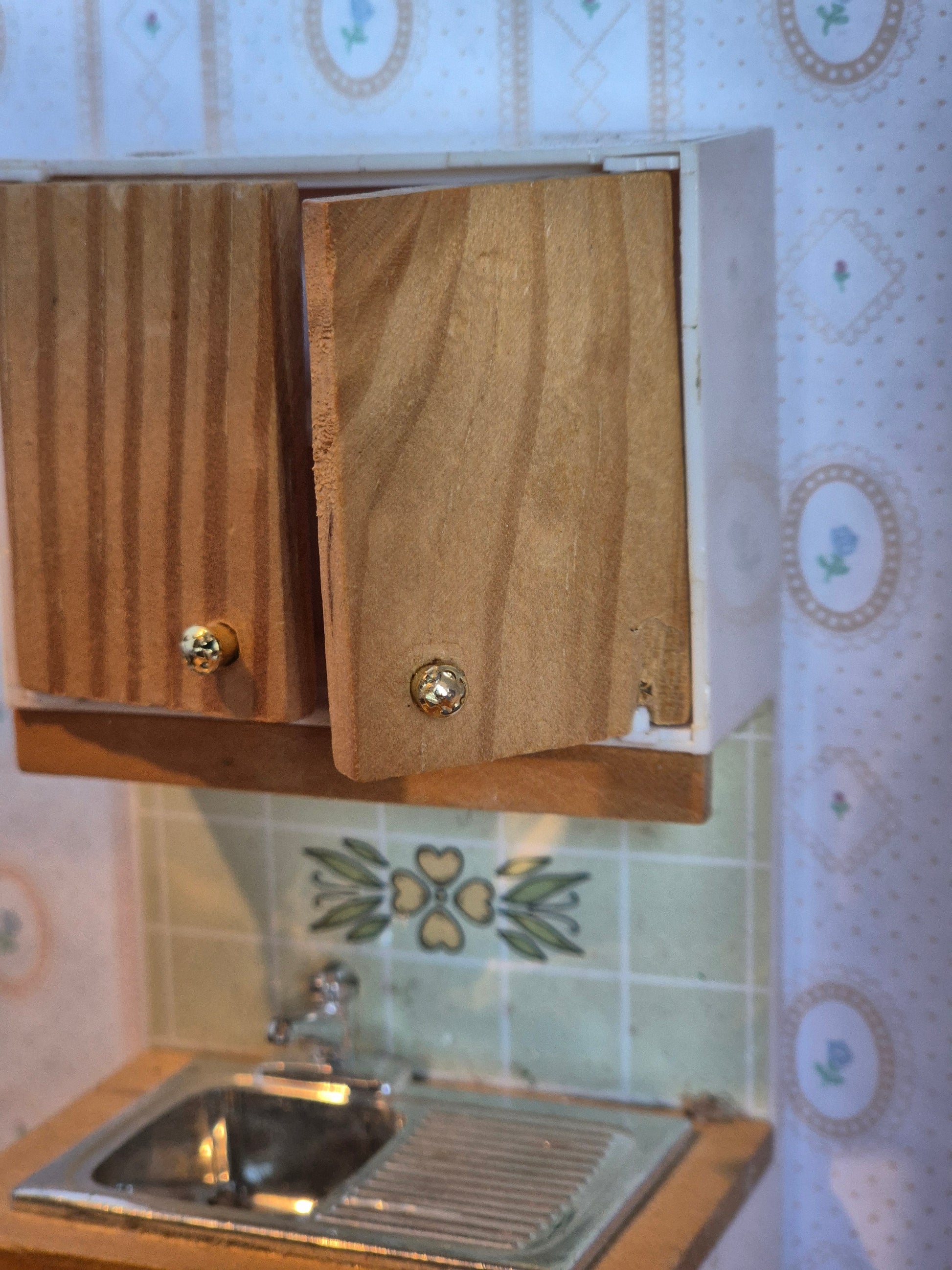 Lundby køkkenvask til dukkehus køkkenet. Den ene skabslåge er en skade nederst. Den har svært ved at lukke.