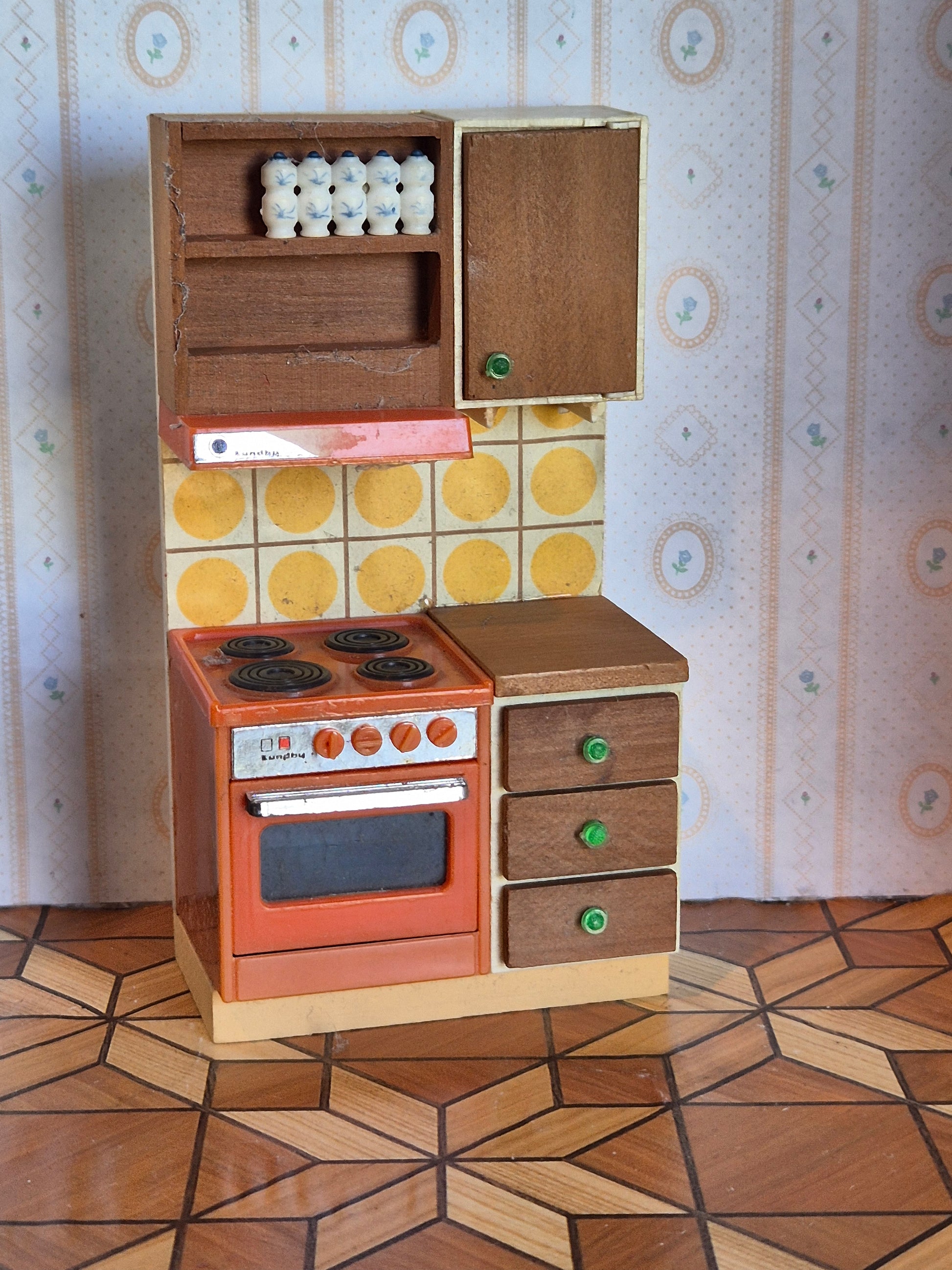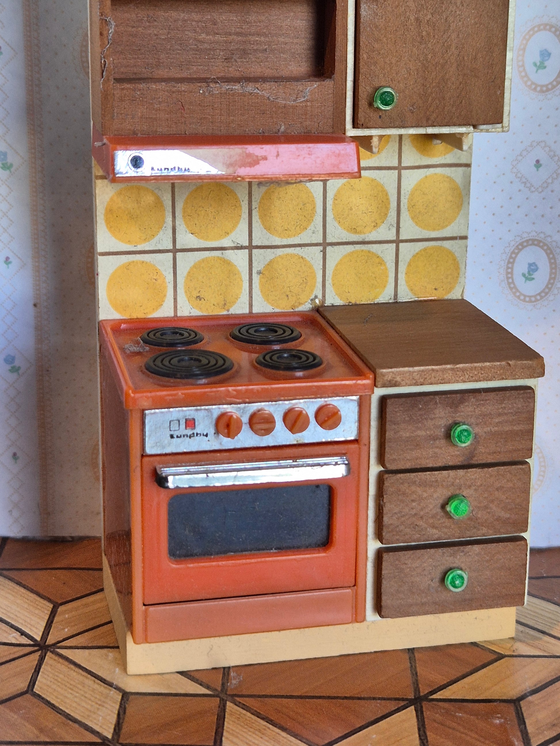 Lundby komfur enhed med gul prikket bagvæg og orange komfur. God pæn stand