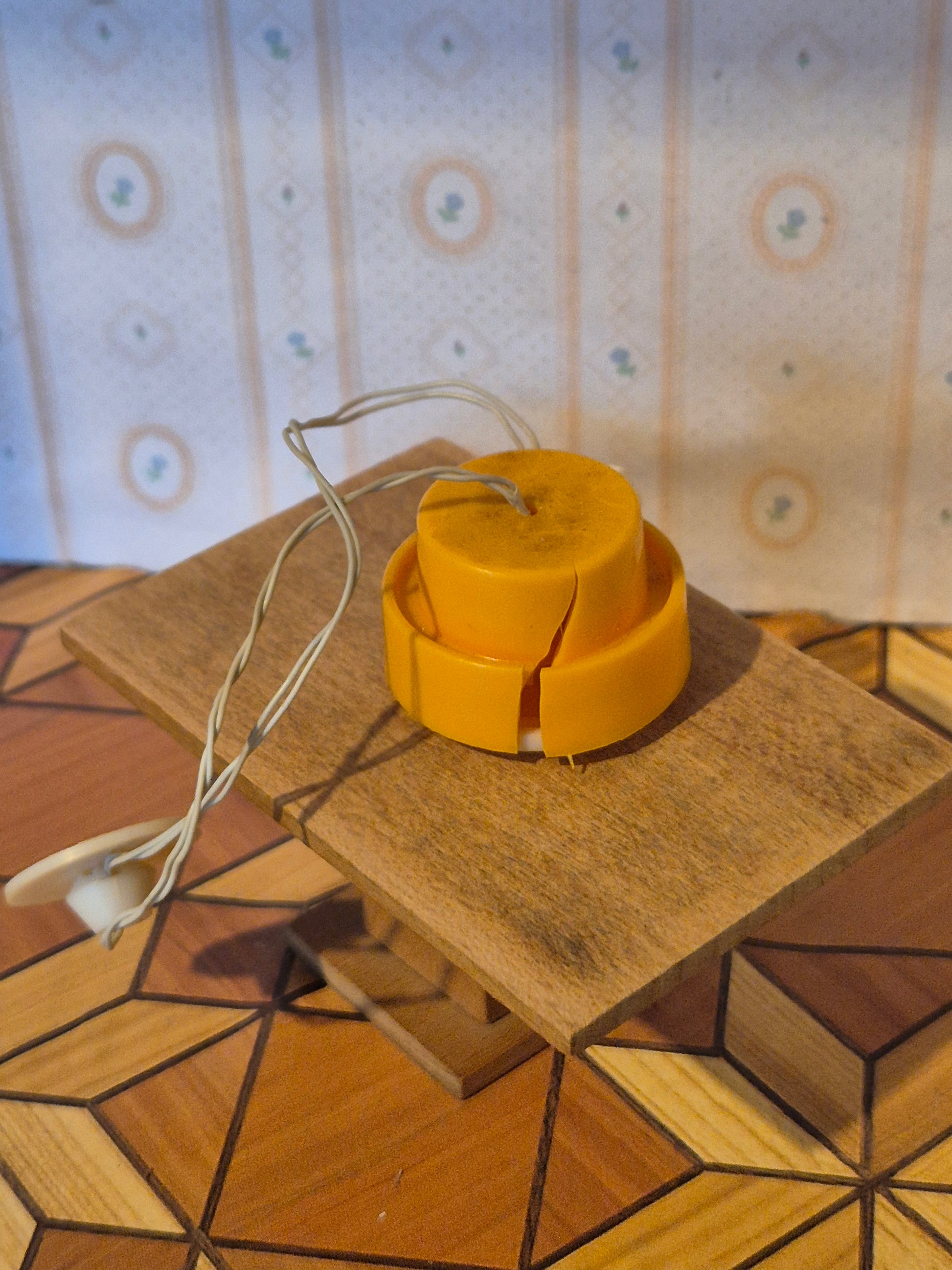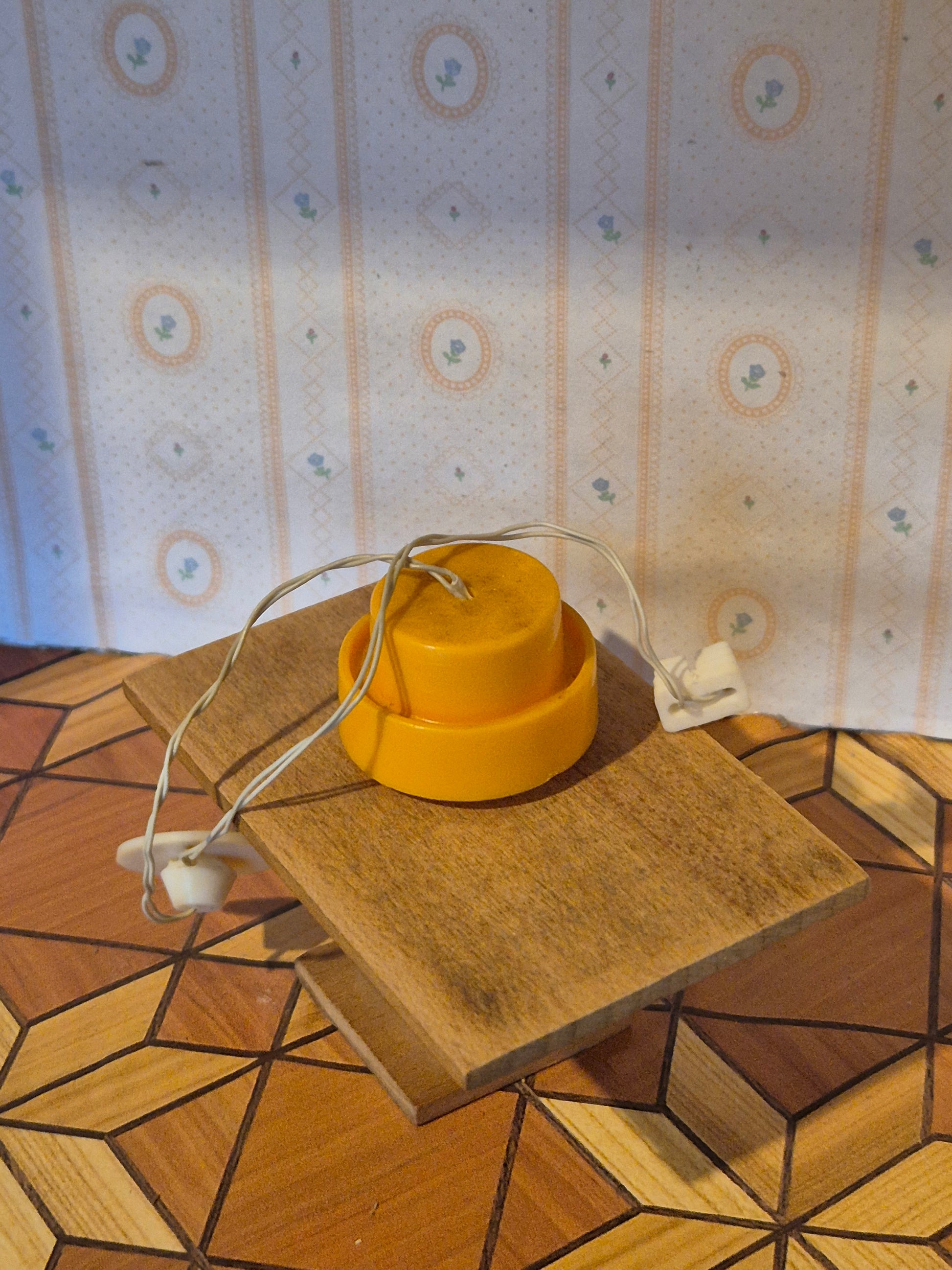 Lundby lampe, pedant lampe, mørkegul plast skærm med større revne i siden.