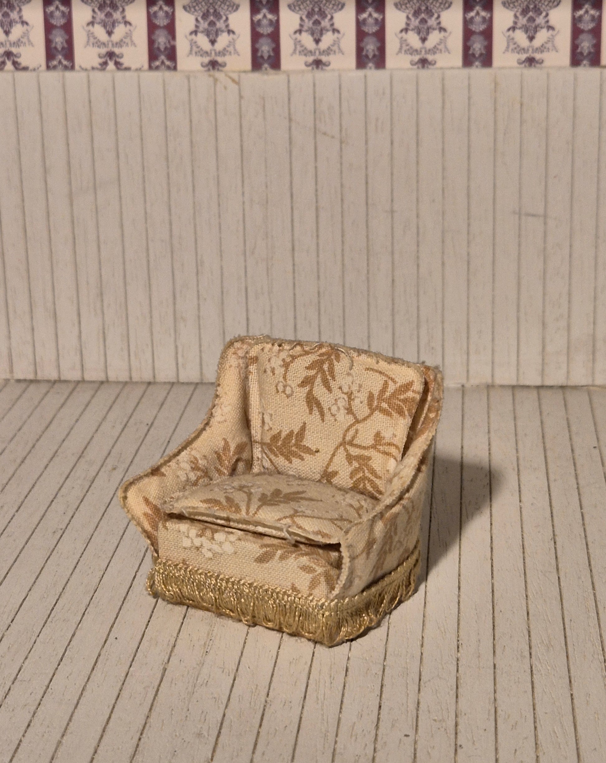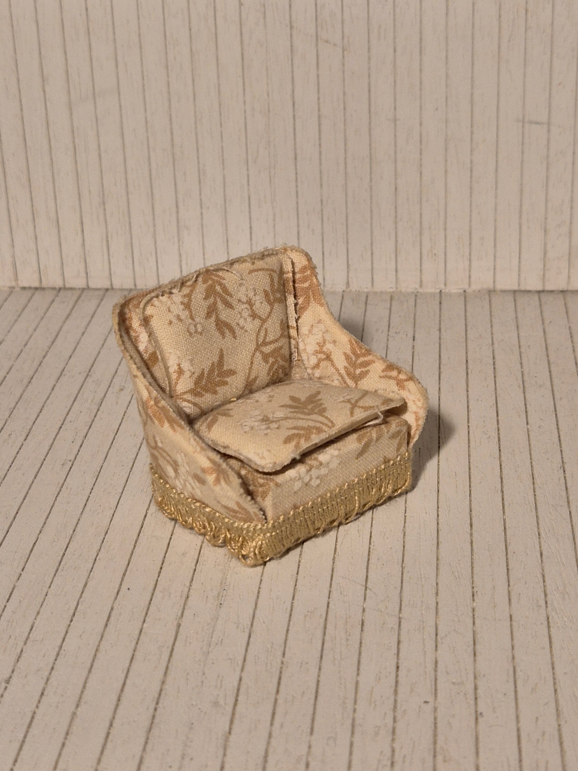 Armchair with a print of leaves in light/beige shades. It is nice and from the brand Lundby.