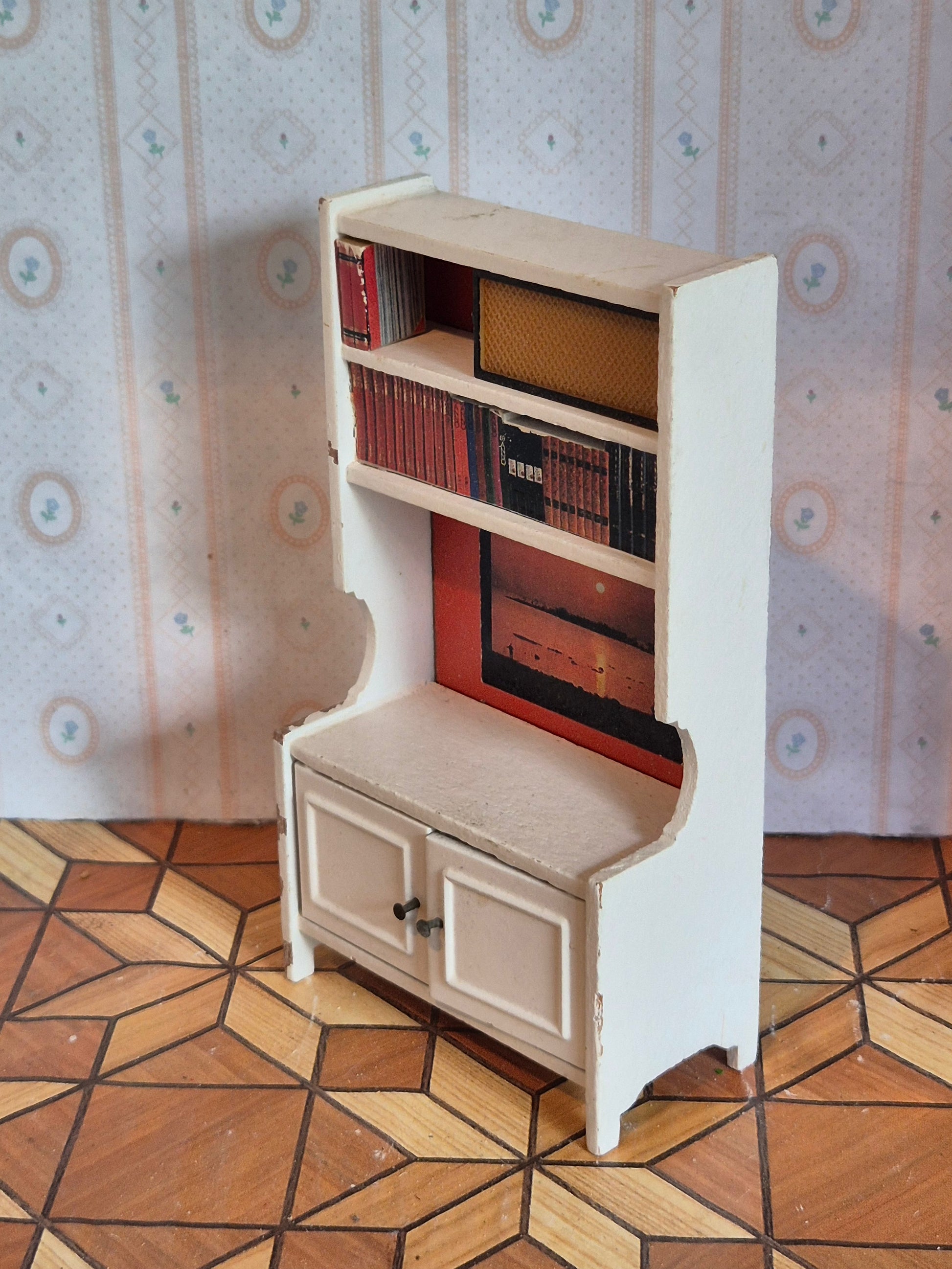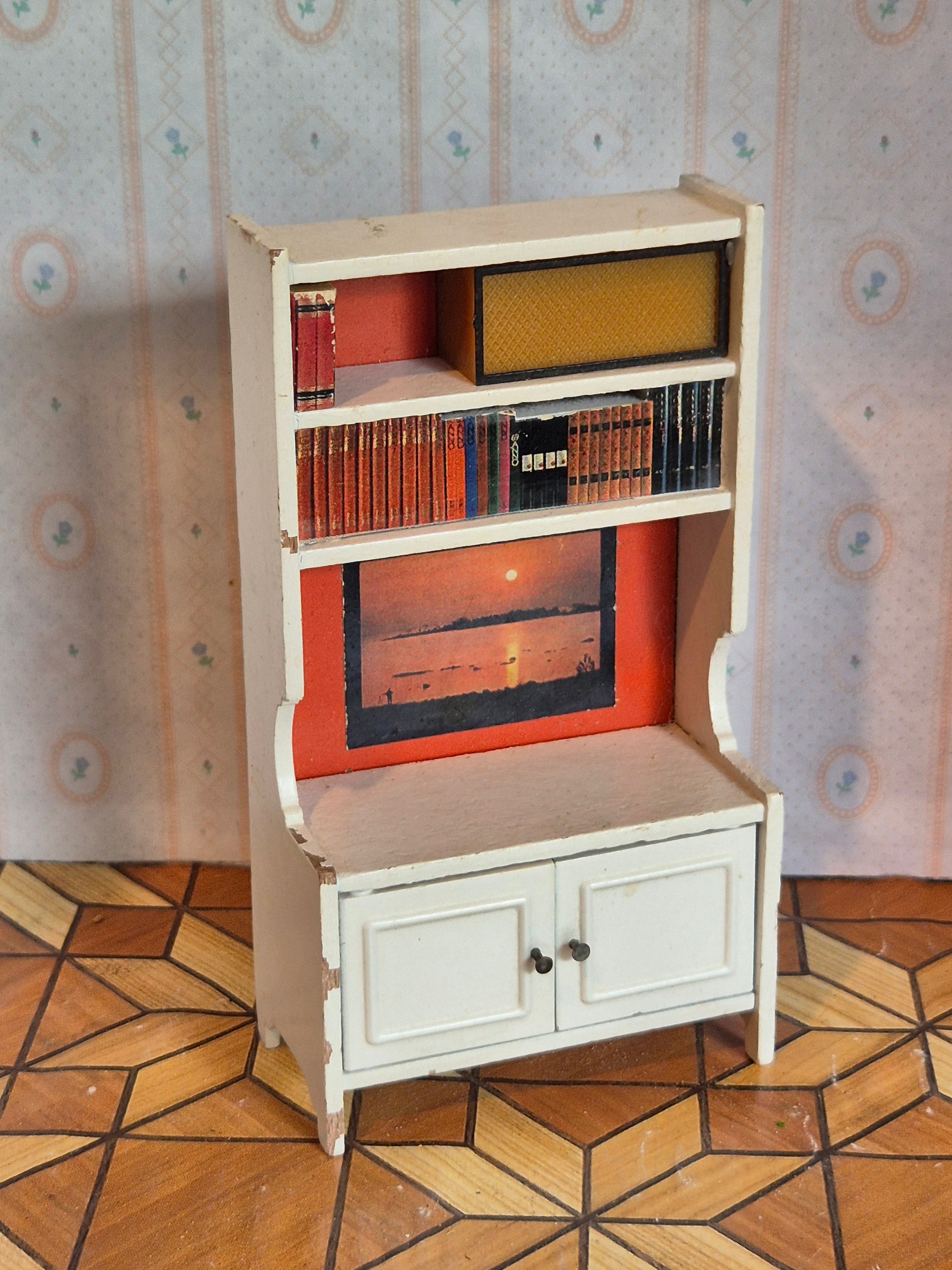 Lundby hvid reol med rød baggrund. Der er hylder og skabslåger. Udmærket stand med patina og brugsspor