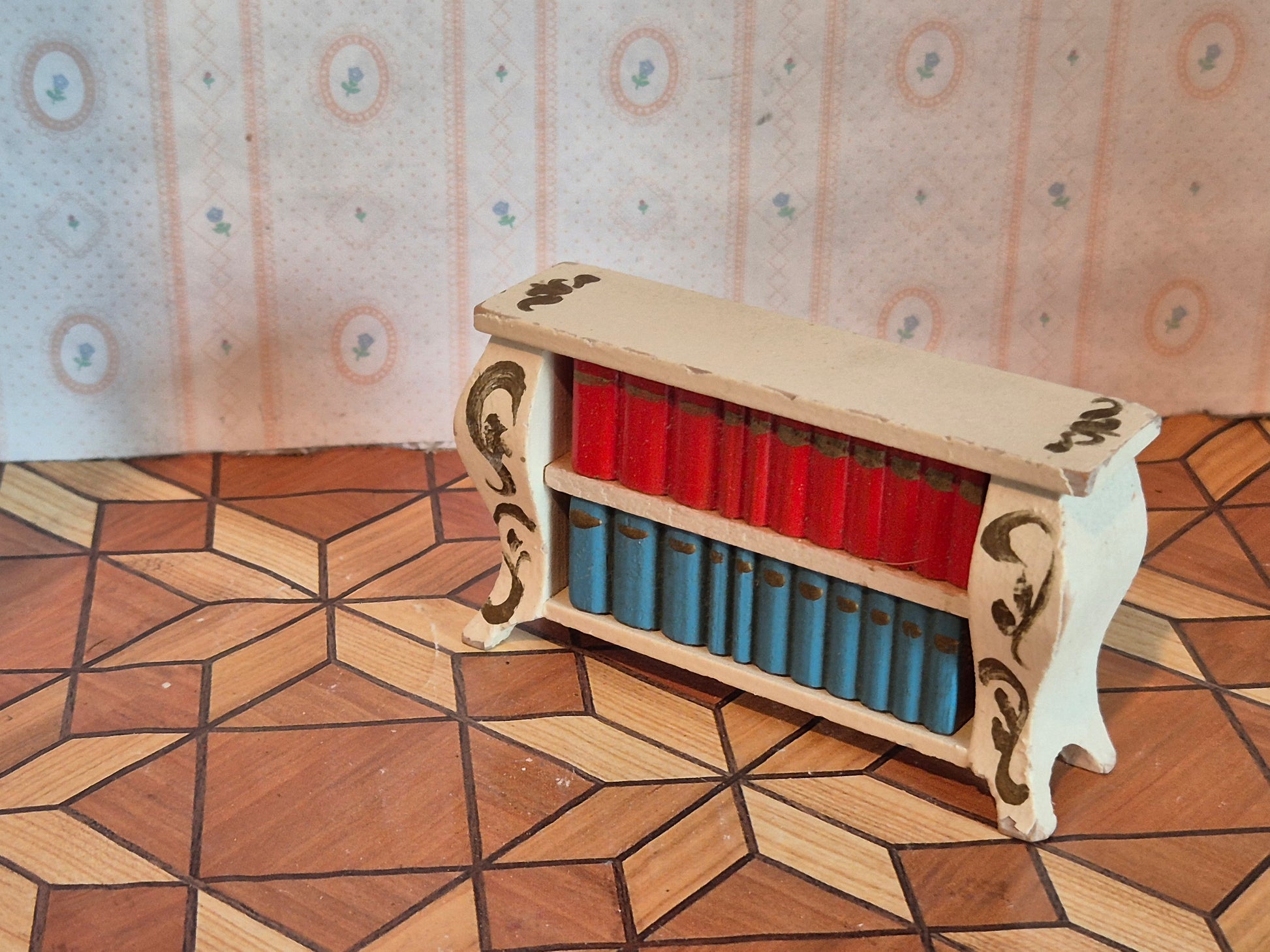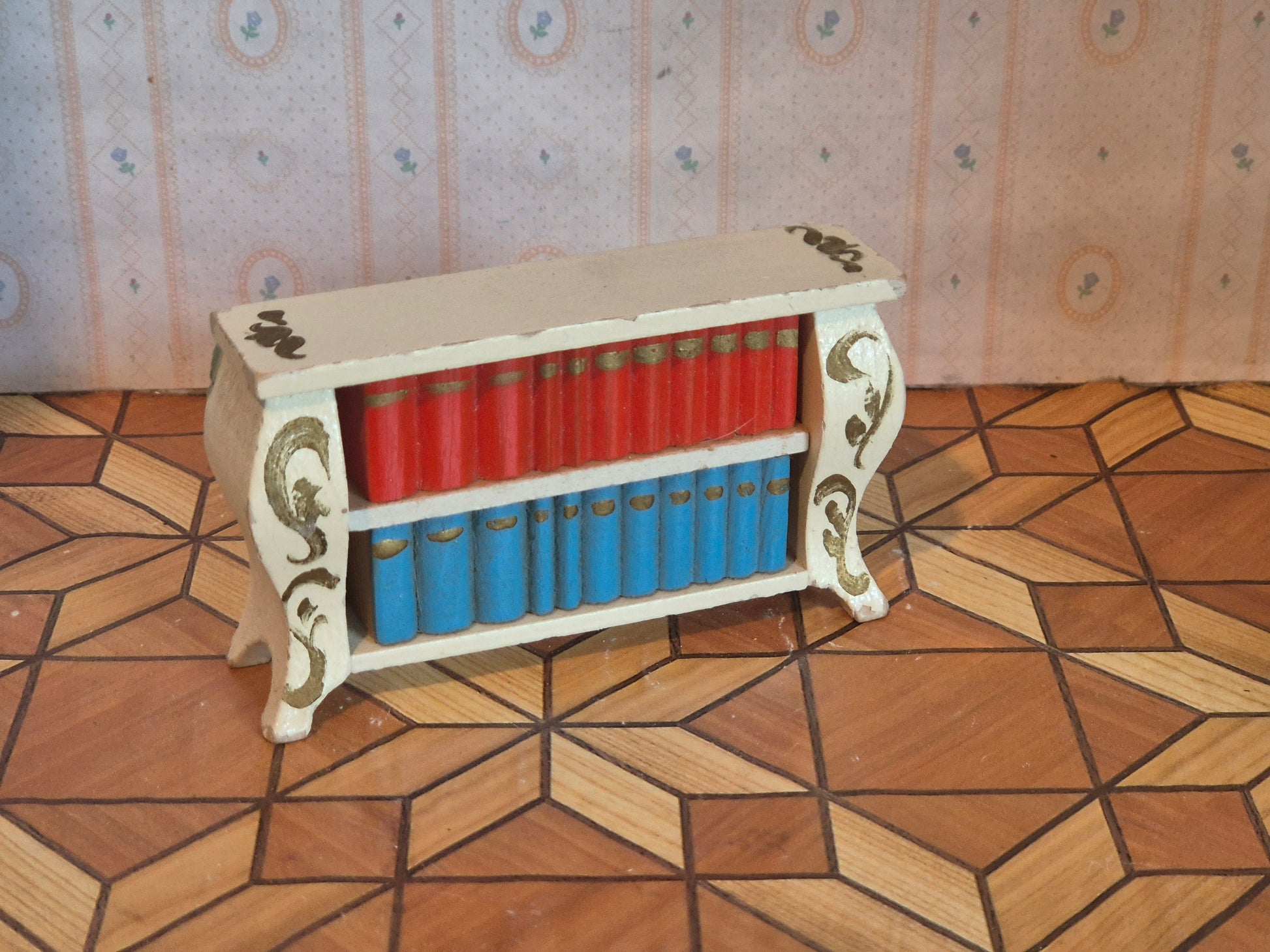 Vintage Lundby reol i hvid rokoko stil med gyldne detaljer. Den er pæn med patina og brugsspor. Den er fra 1950erne