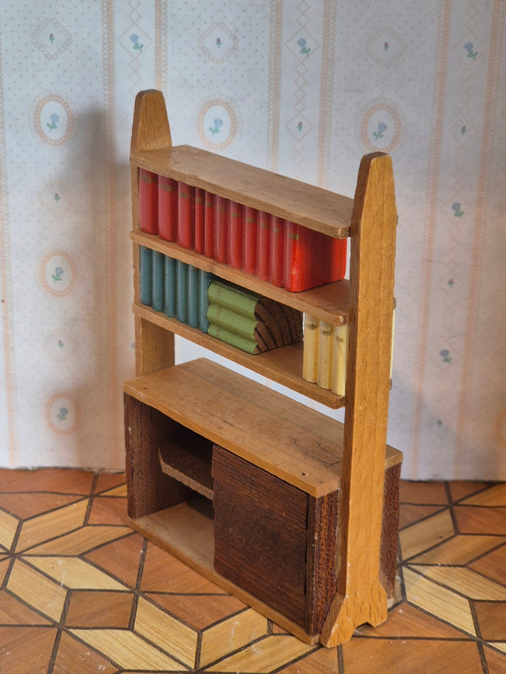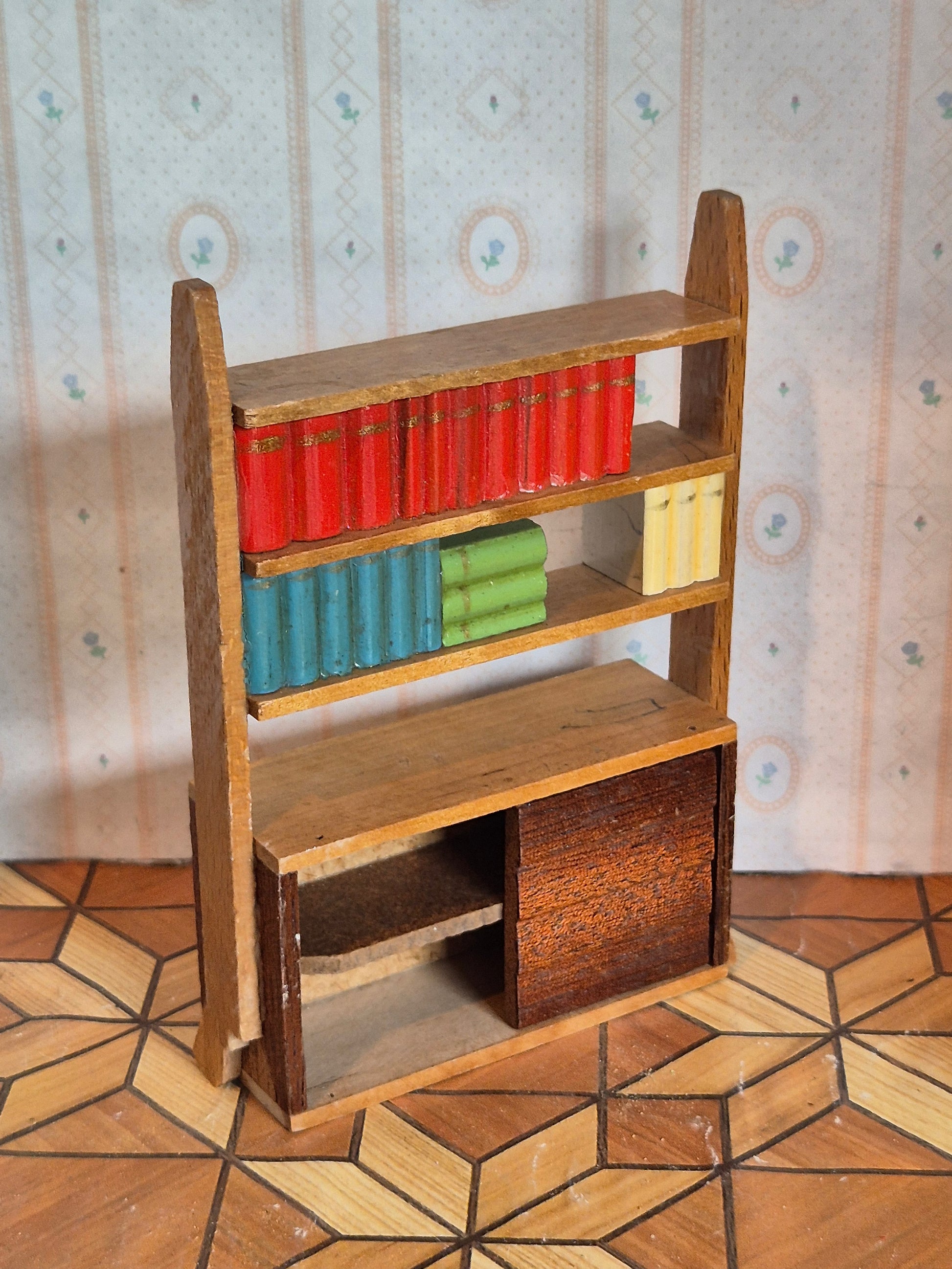 Vintage Lundby reol fra slutningen af 1950erne. Den er i stykker og har mangler.