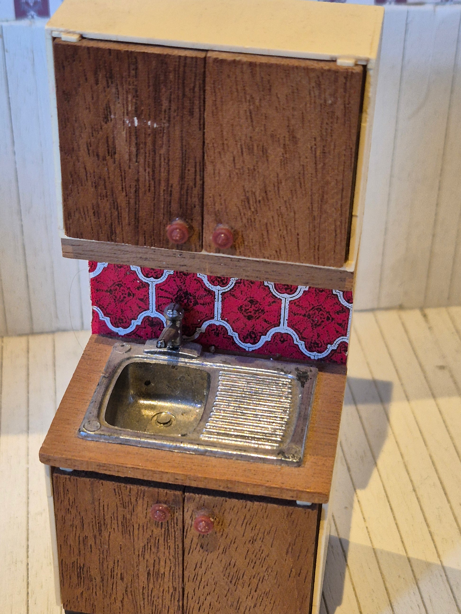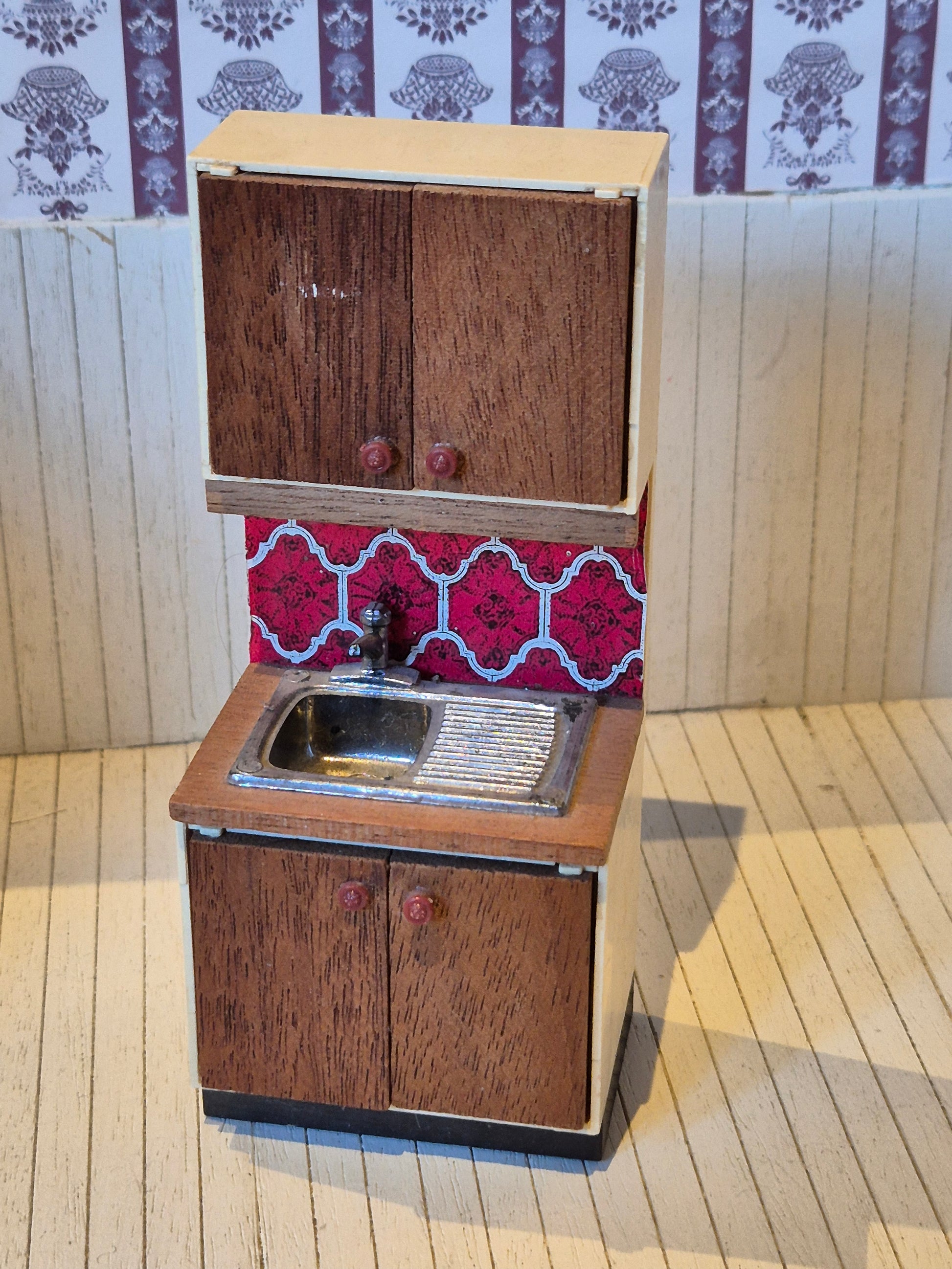 Good kitchen sink unit with dark wood, cabinet doors and red tile wallpaper on the back wall in excellent condition.