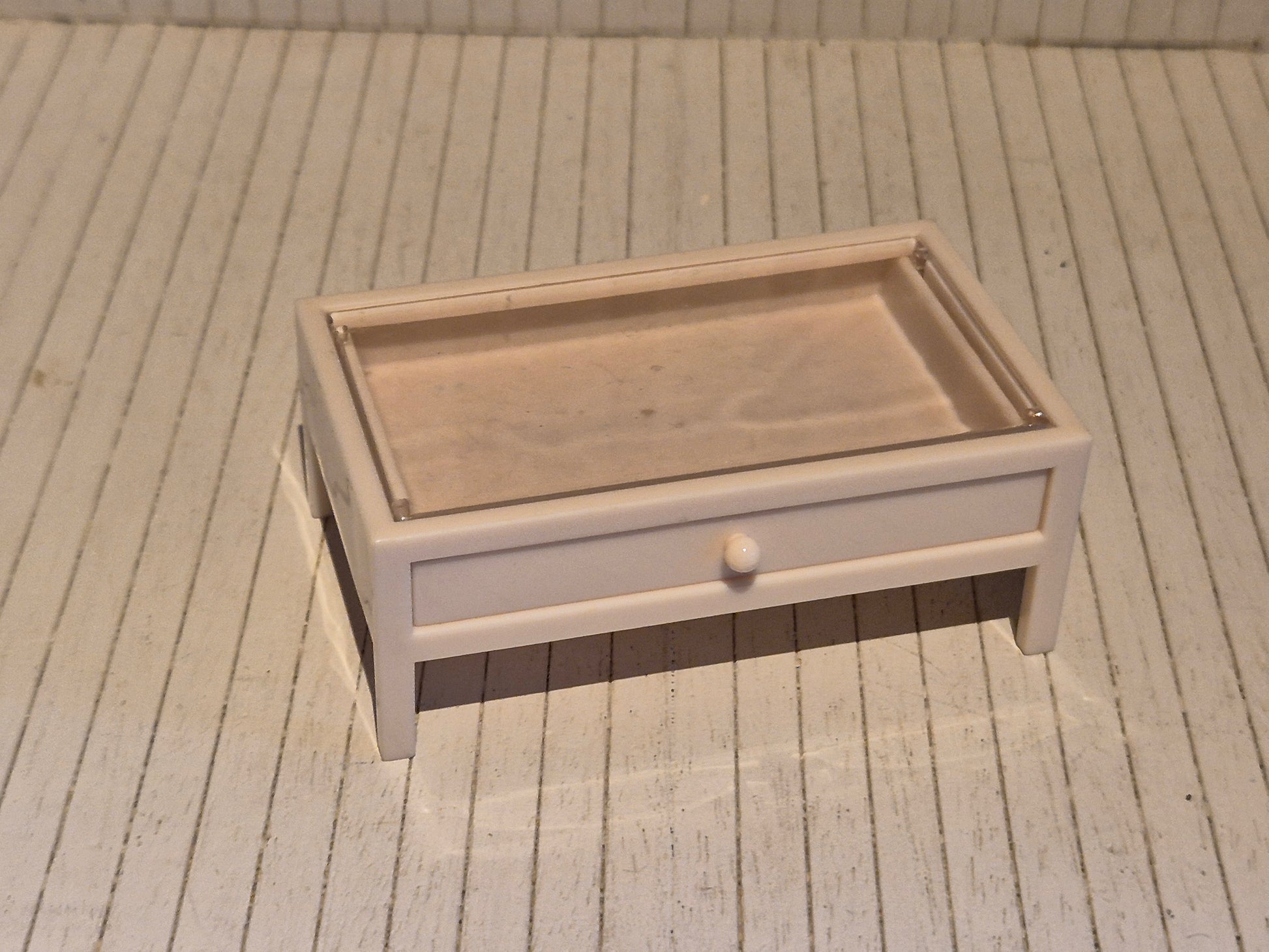 Lundby coffee table made of white plastic with a transparent table top. There is a nice drawer in it that can be pulled out from both sides. It is used and may have patina or traces of use.