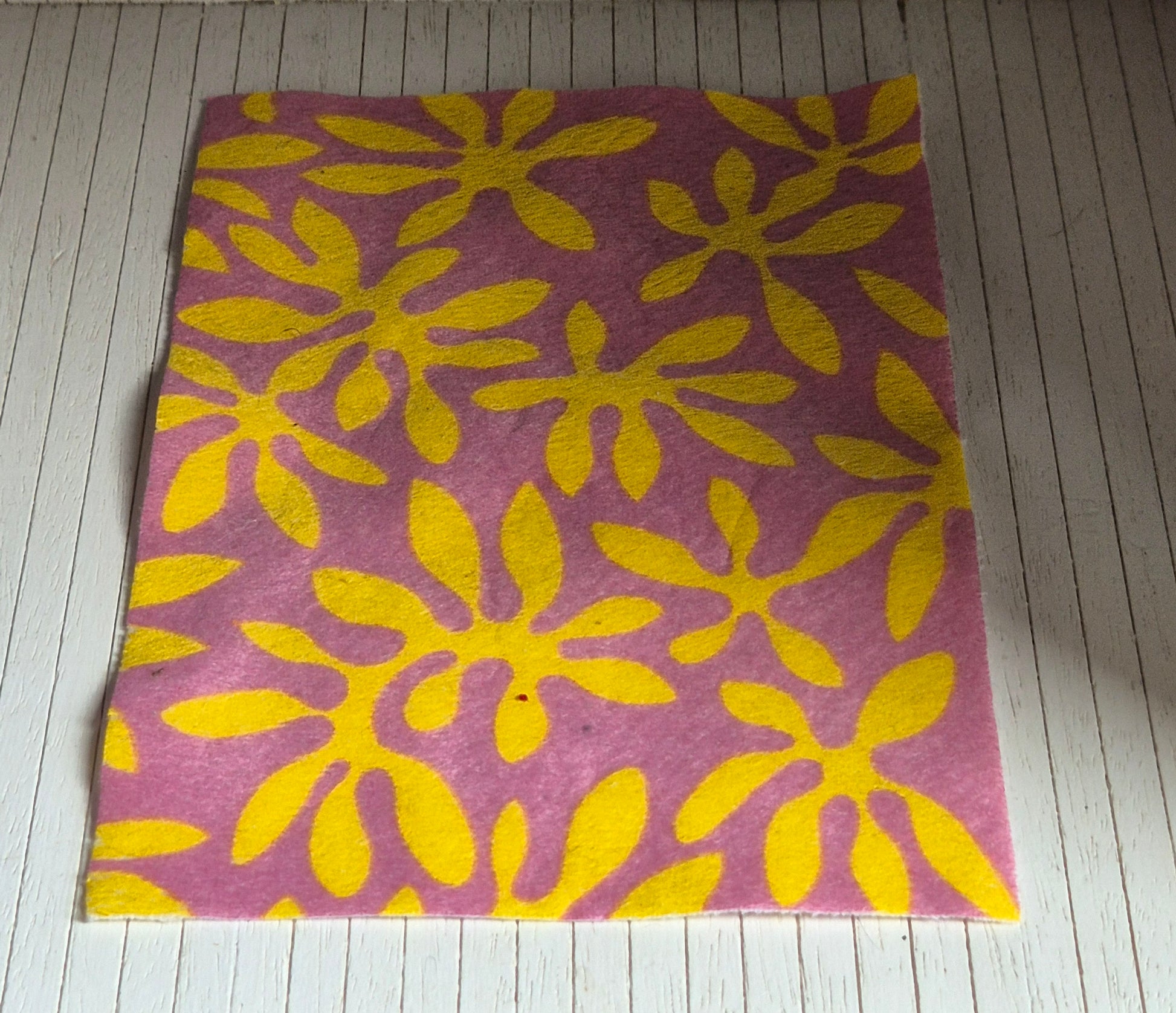 Pænt lyserødt tæppe med gult mønster. Pænt.